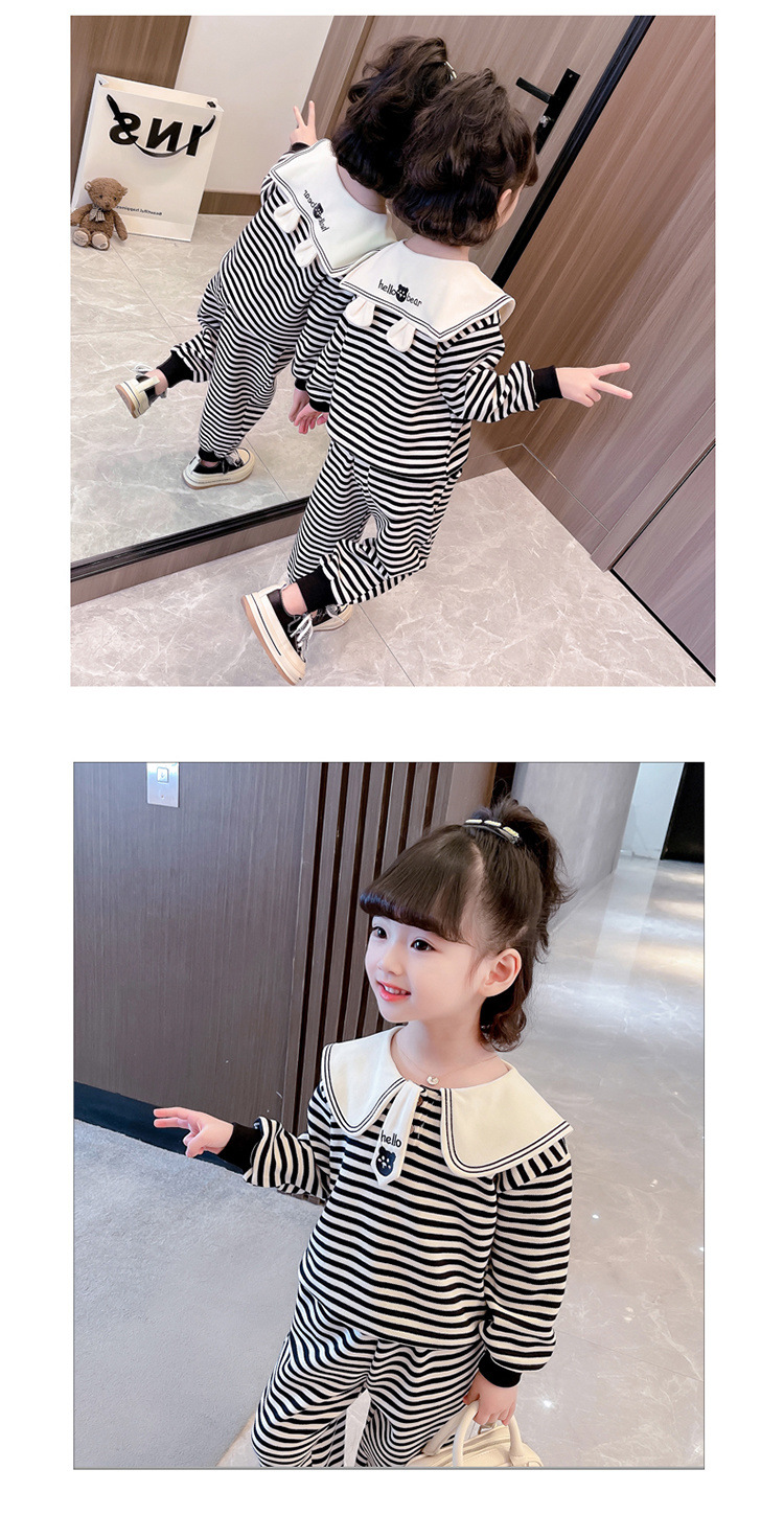 소녀 세트 봄과 가을 2025 새로운 어린이 온라인 인기 가을 서양 스타일 아기 소녀 줄무늬 해군 칼라 투피스 세트