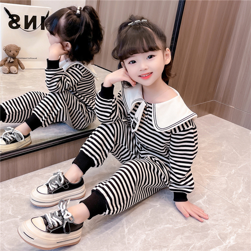 소녀 세트 봄과 가을 2025 새로운 어린이 온라인 인기 가을 서양 스타일 아기 소녀 줄무늬 해군 칼라 투피스 세트스토어 가기