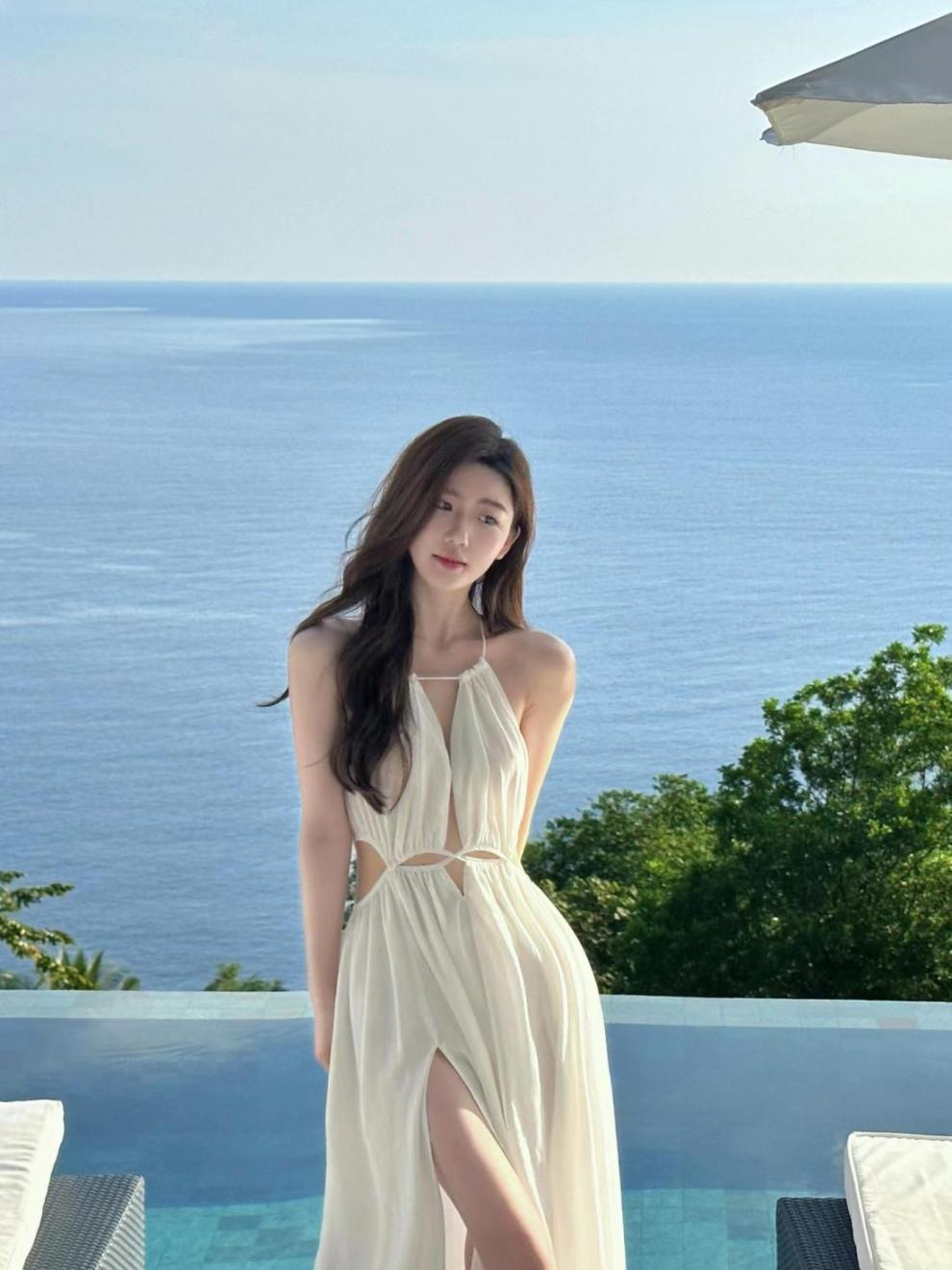 Sanya, 태국 여행 사진 해변 원피스 해변 휴가 원피스 순수한 섹시한 할로우 화이트 슬링 원피스스토어 가기