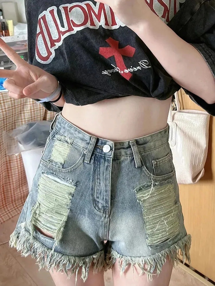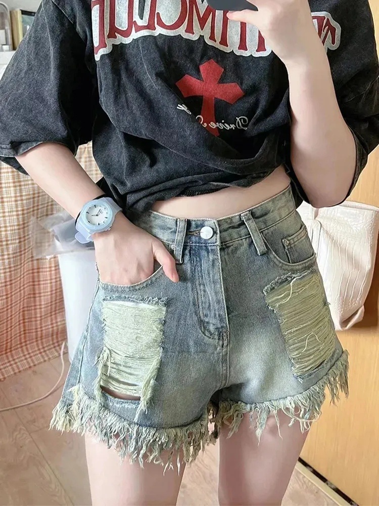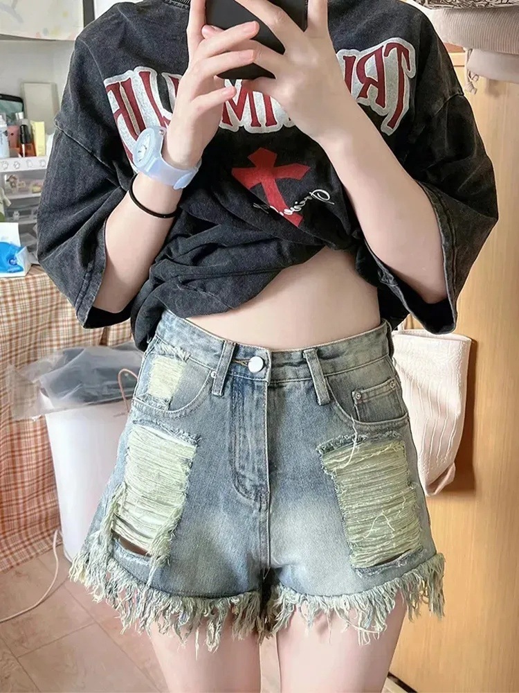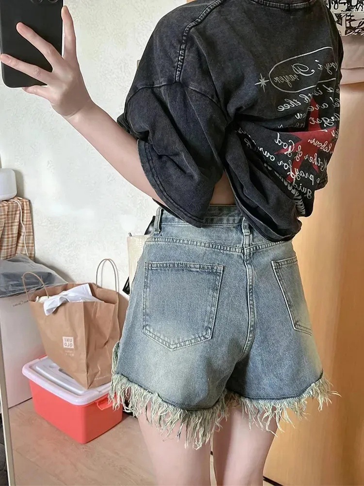 뜨거운 소녀 빈티지 리핑 청바지 여성용 봄 트렌디 반바지 높은 허리 슬리밍 디자인 센스 틈새 넓은 다리 바지스토어 가기