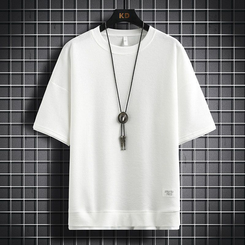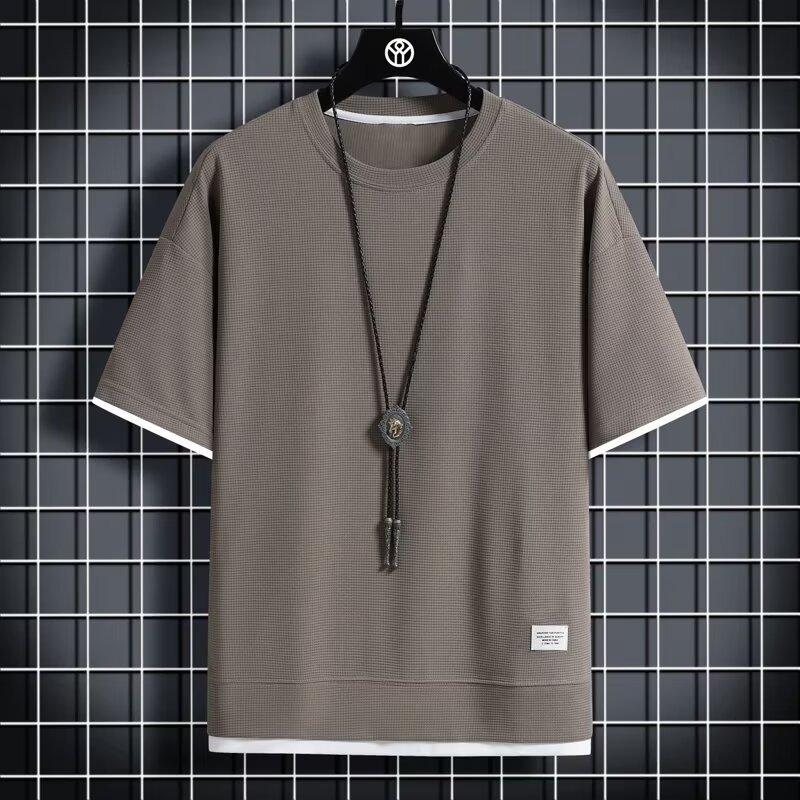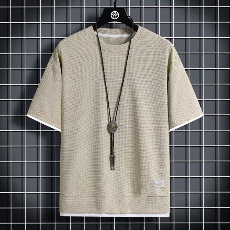 국경 간 와플 반팔 남성 여름 가짜 투피스 탑 도매 아이스 실크 얇은 둥근 목 티셔츠 의류 재고