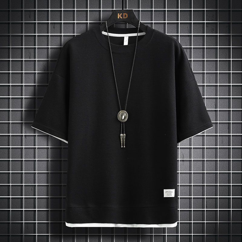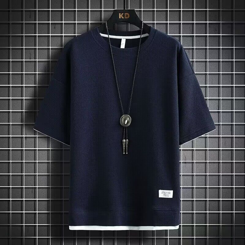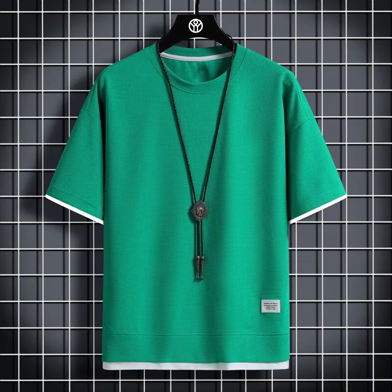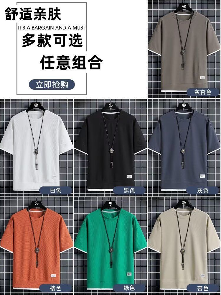 국경 간 와플 반팔 남성 여름 가짜 투피스 탑 도매 아이스 실크 얇은 둥근 목 티셔츠 의류 재고스토어 가기