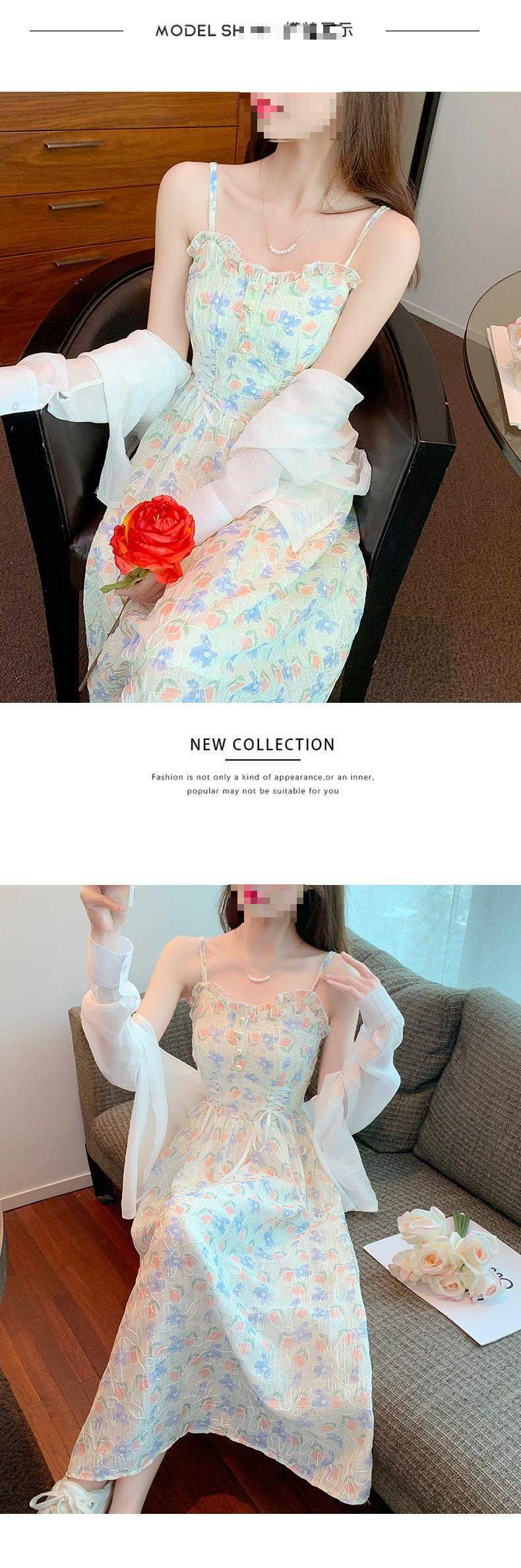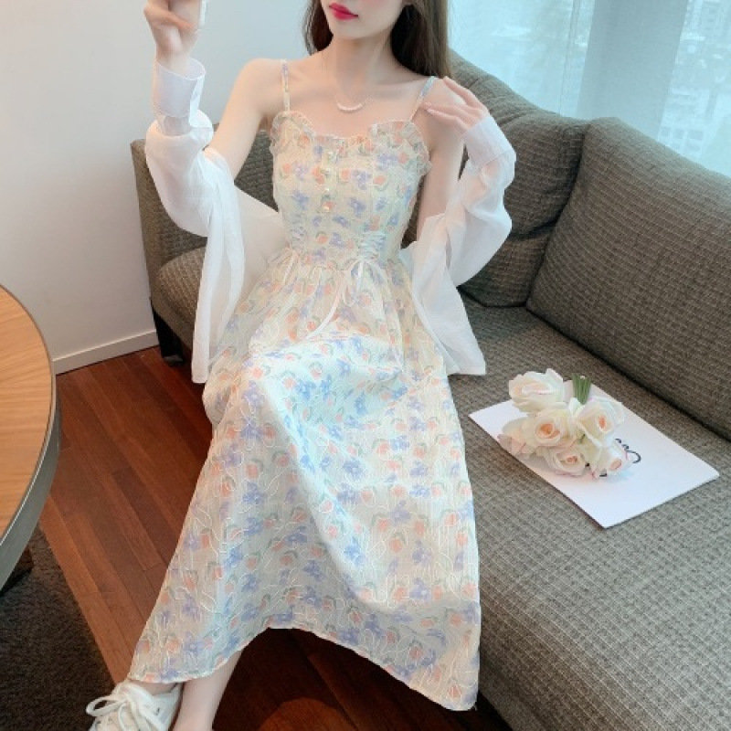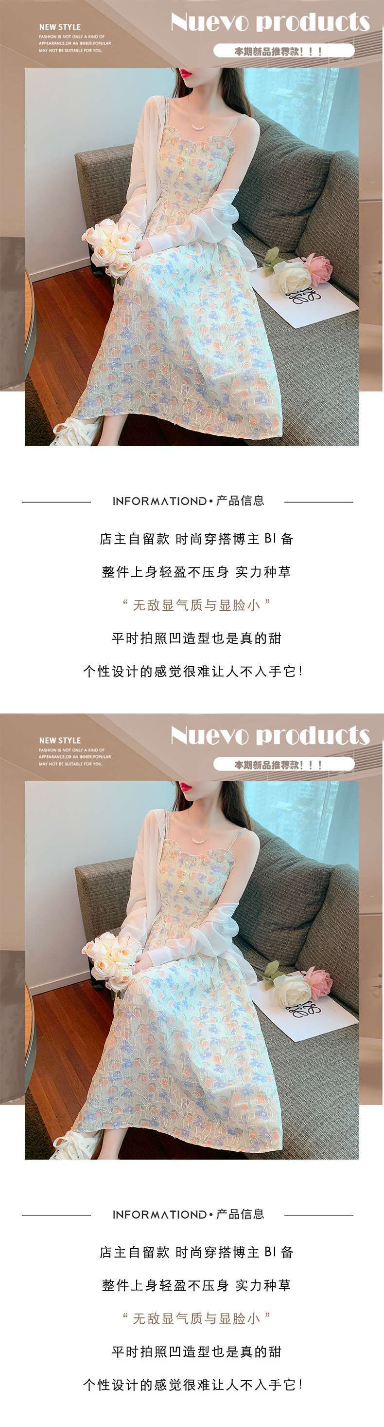 꽃 원피스 프랑스 스타일 여성의 세련된 2025 봄과 여름 분할 현악 슬링 긴 원피스 우아한 태양 보호 카디건 세트스토어 가기
