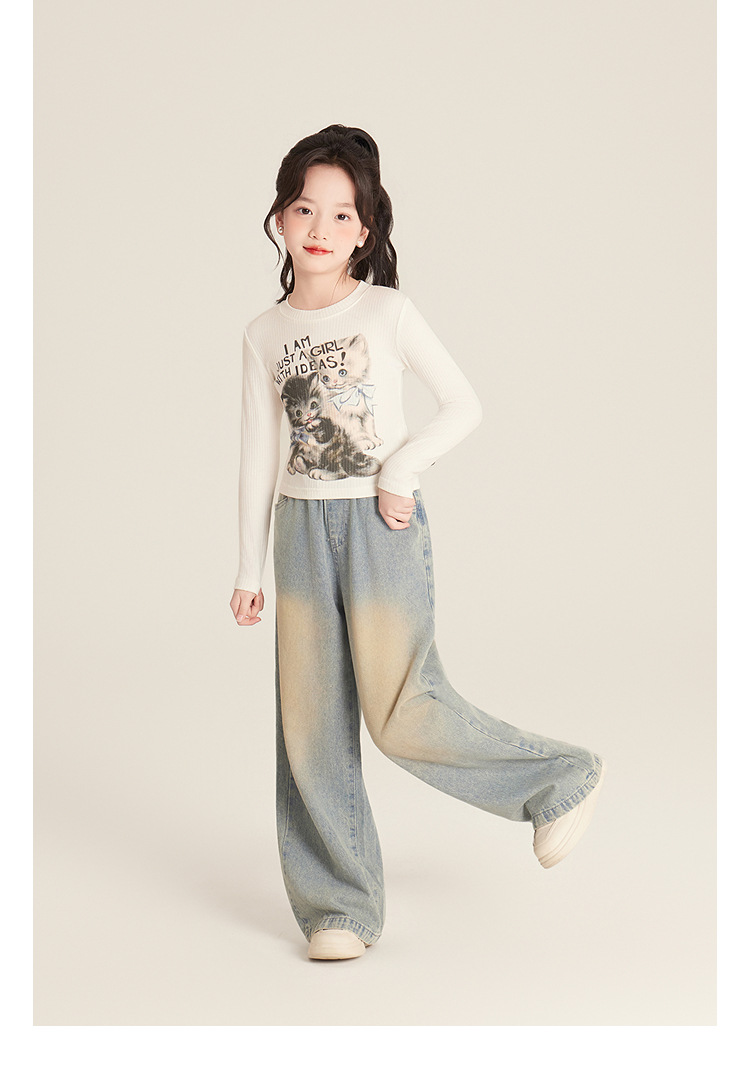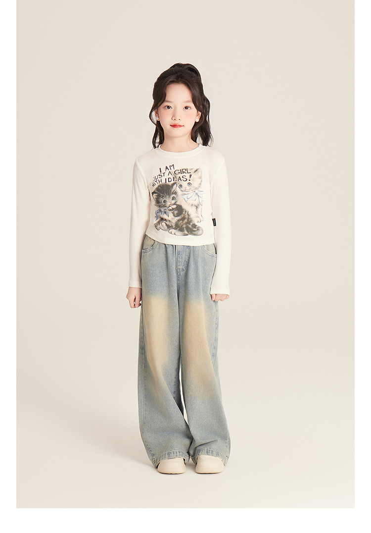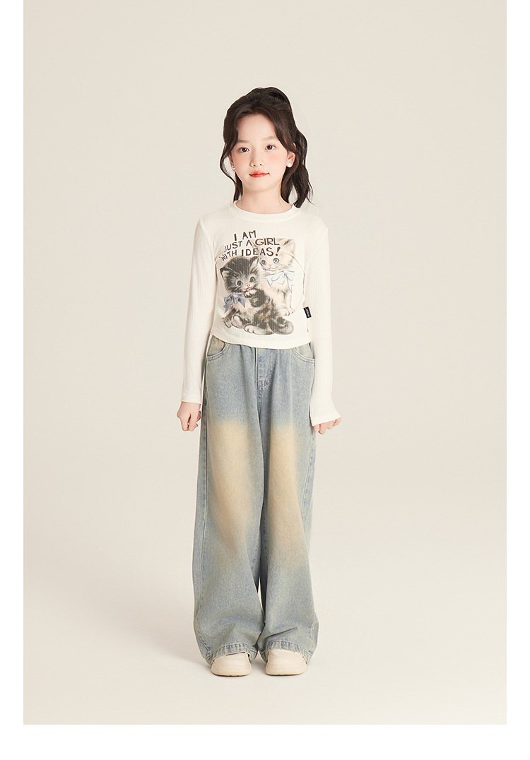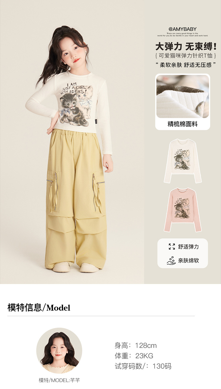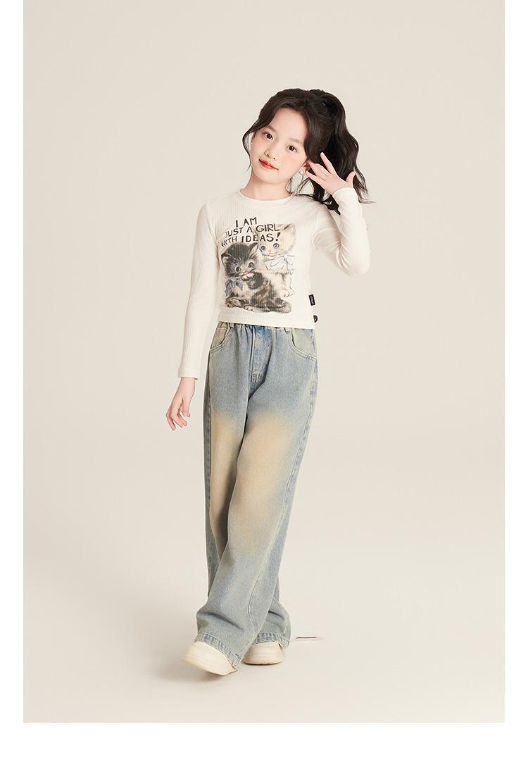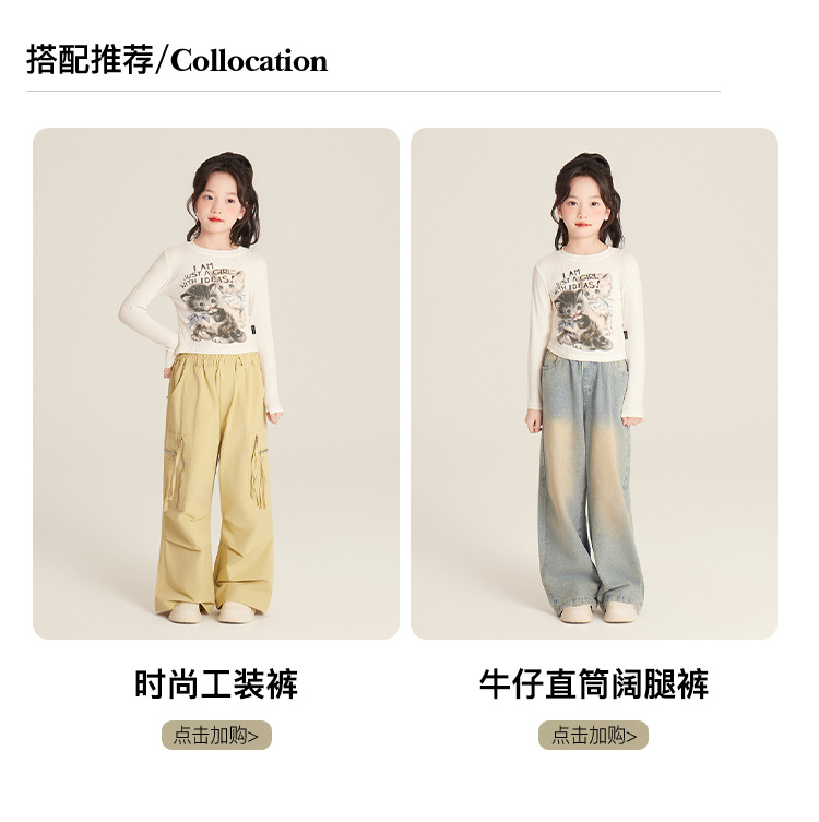 Amybaby Girls Top Spring 2025 새로운 귀여운 미국 빈티지 새끼 고양이 인쇄 스트레치 니트 티셔츠스토어 가기