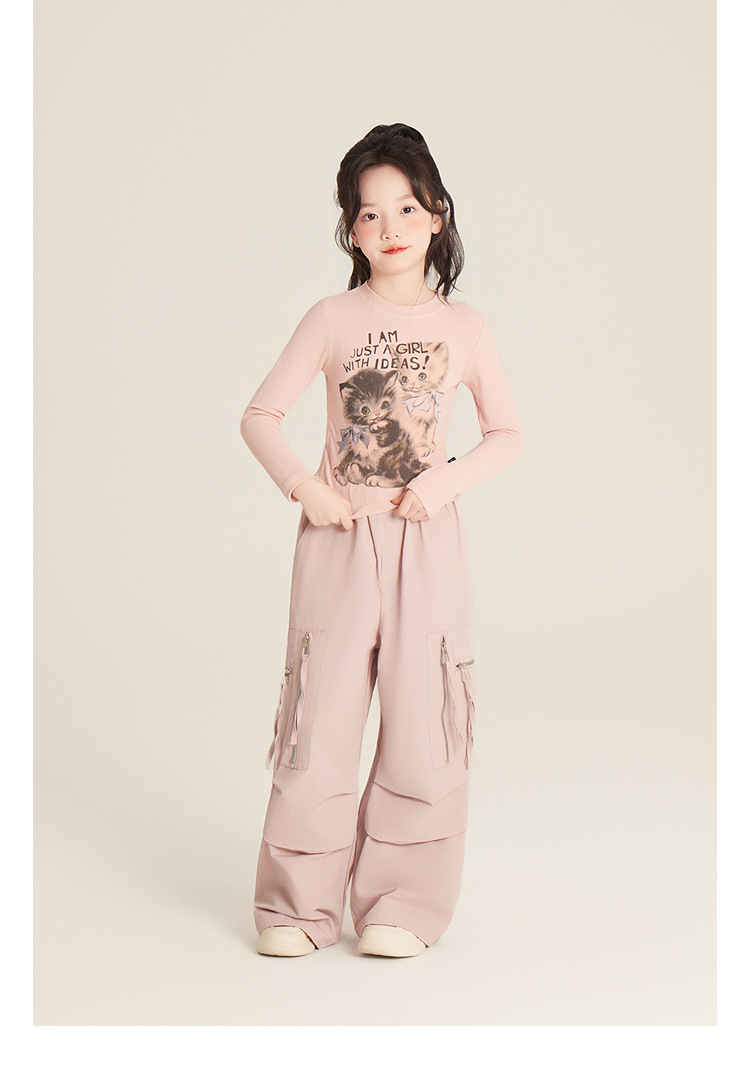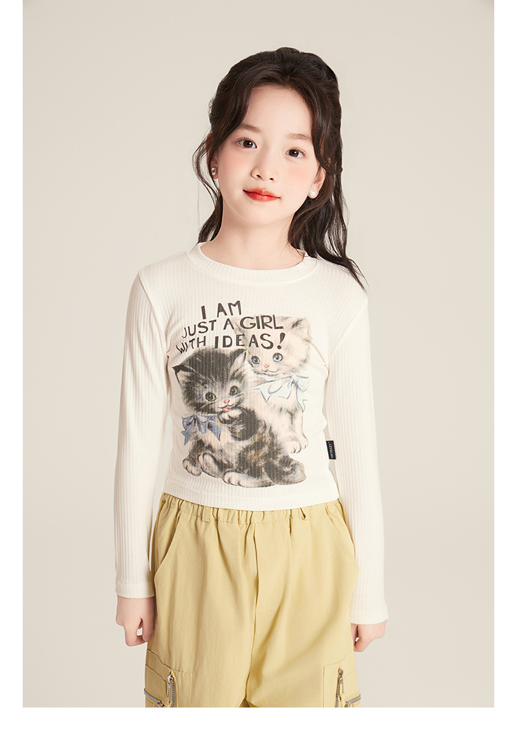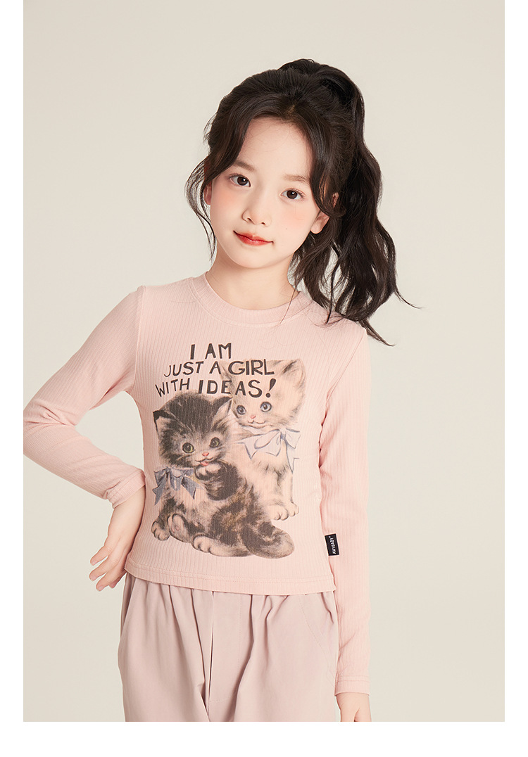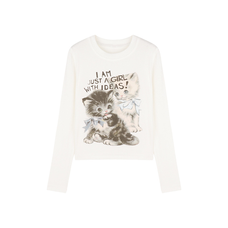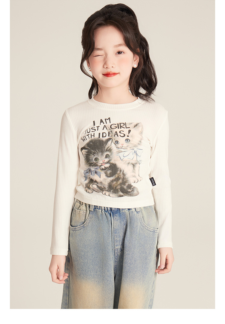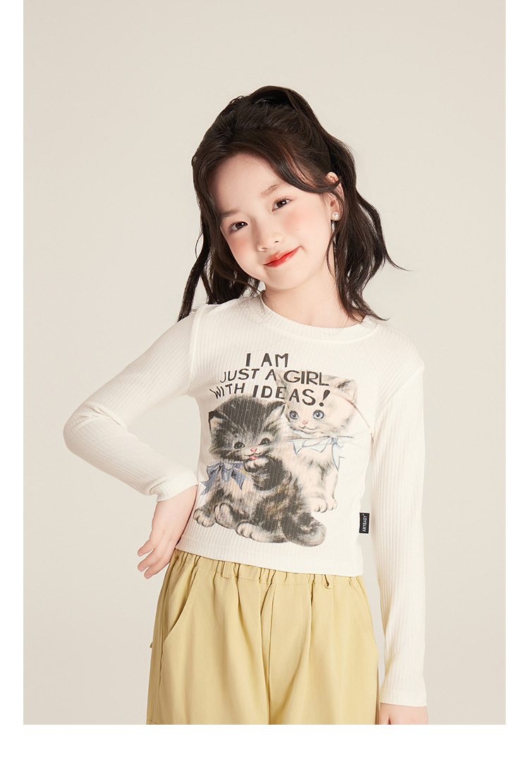 Amybaby Girls Top Spring 2025 새로운 귀여운 미국 빈티지 새끼 고양이 인쇄 스트레치 니트 티셔츠