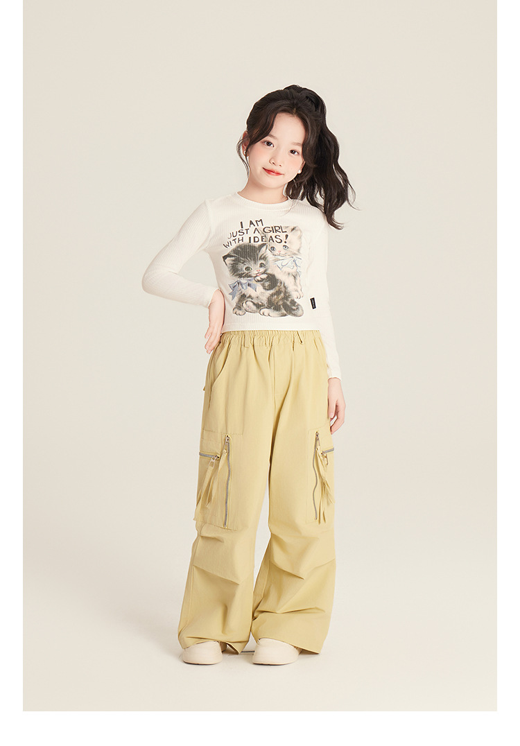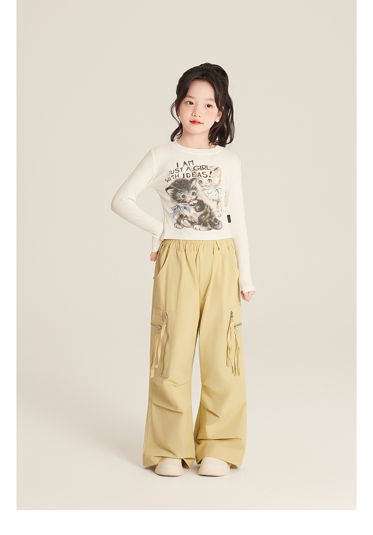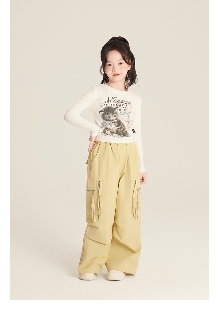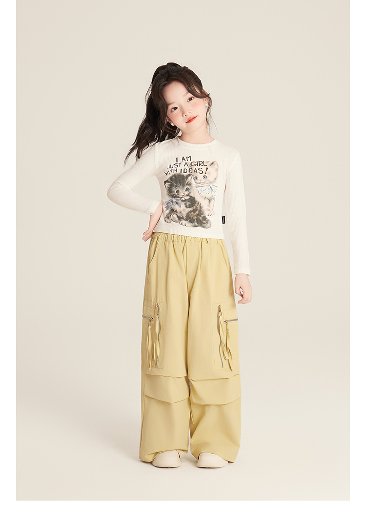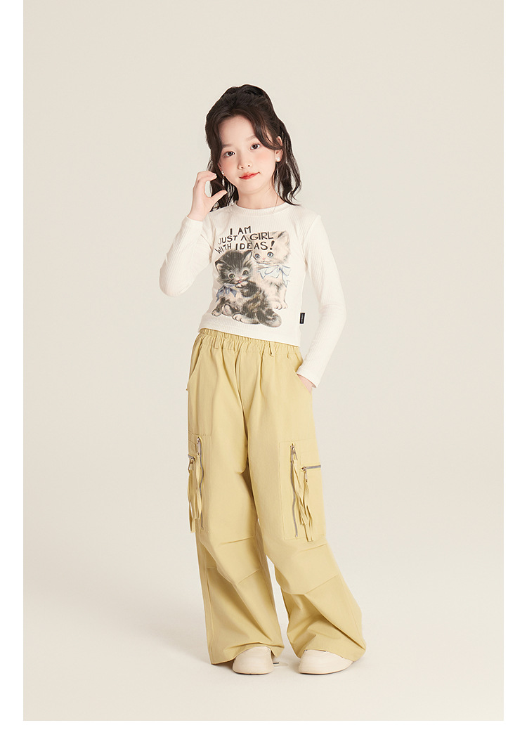 Amybaby Girls Top Spring 2025 새로운 귀여운 미국 빈티지 새끼 고양이 인쇄 스트레치 니트 티셔츠