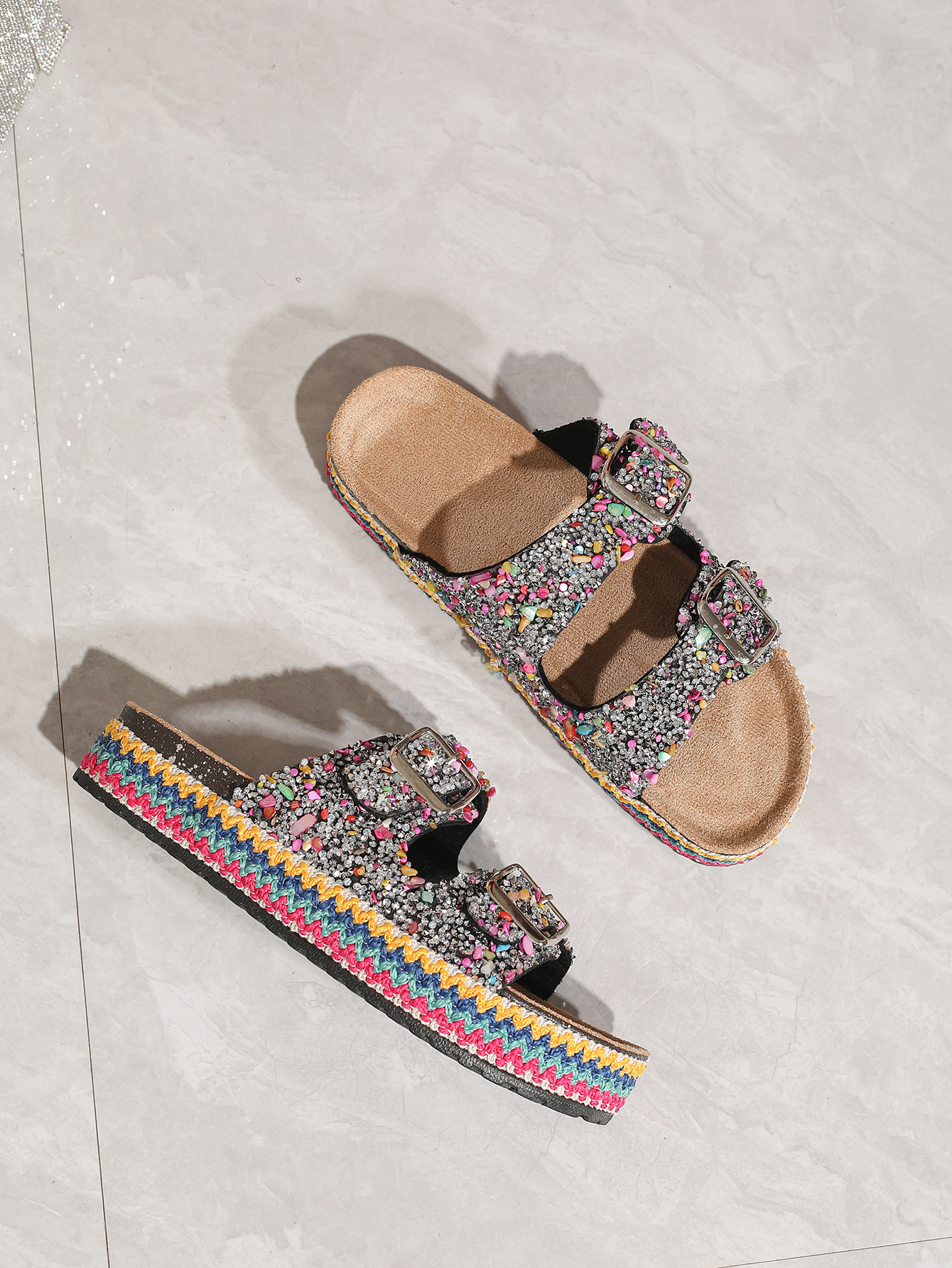 새로운 슈퍼 하이힐 크로스보더 브릭 앤 스톤 더블 버클 슈즈 여성 캐주얼 외출용 홈 여름 샌들 슬리퍼 유럽 및 미국 스타일 모조 토끼털스토어 가기