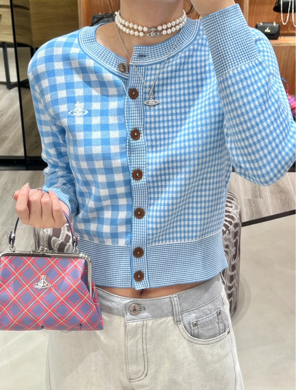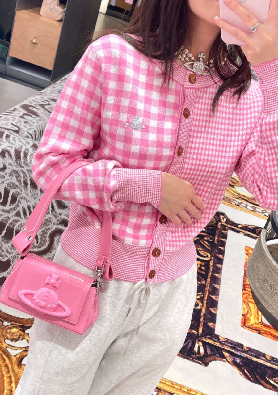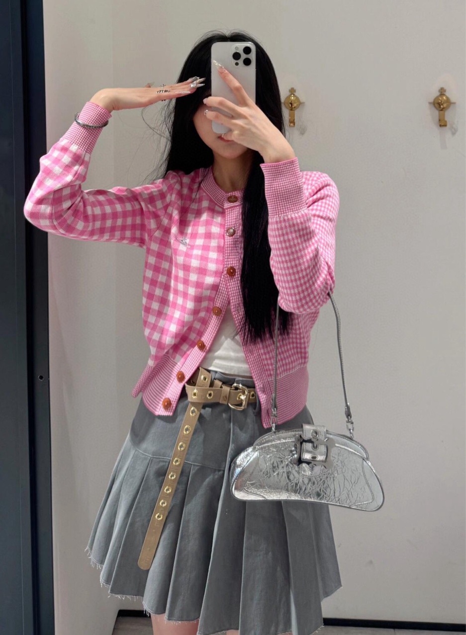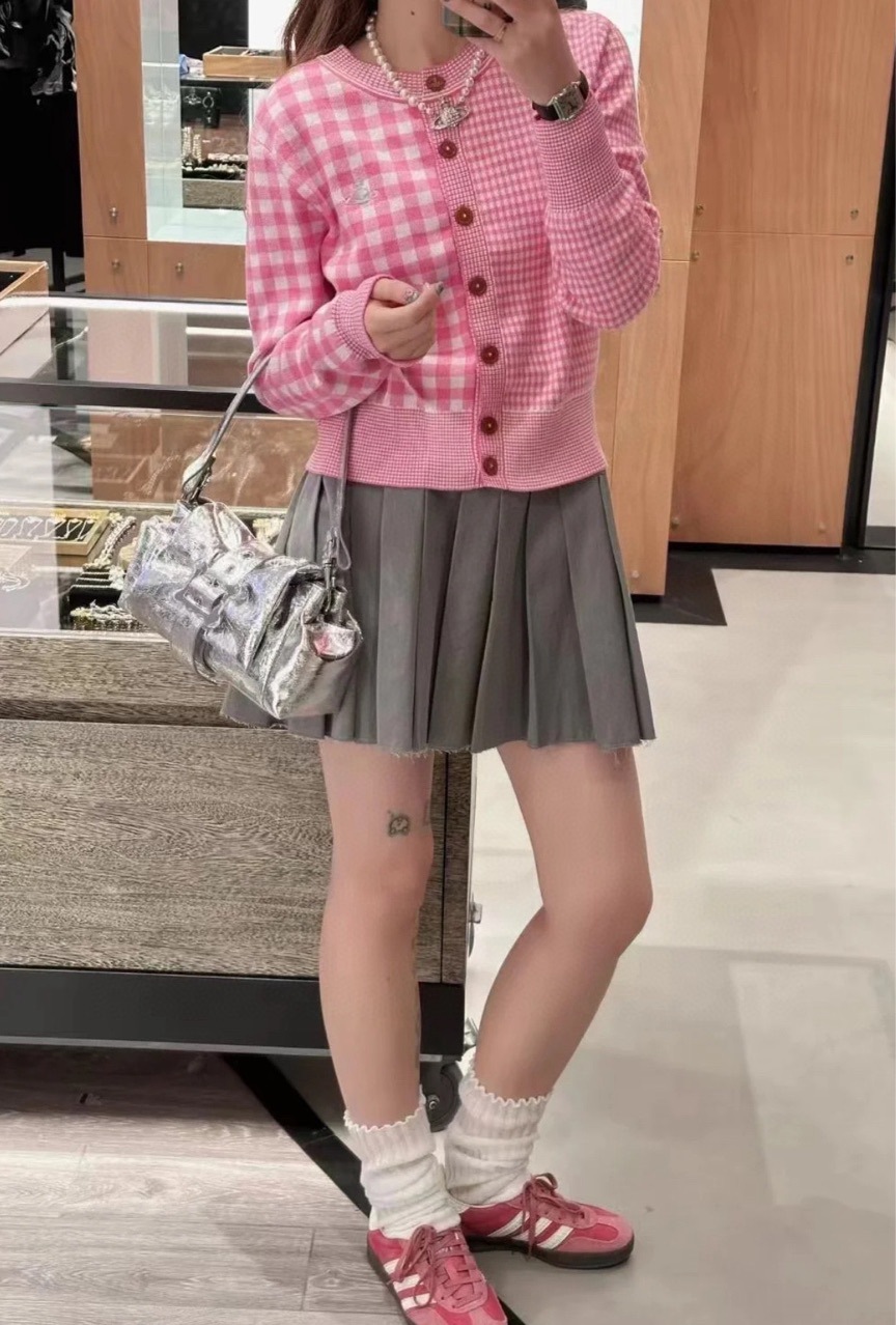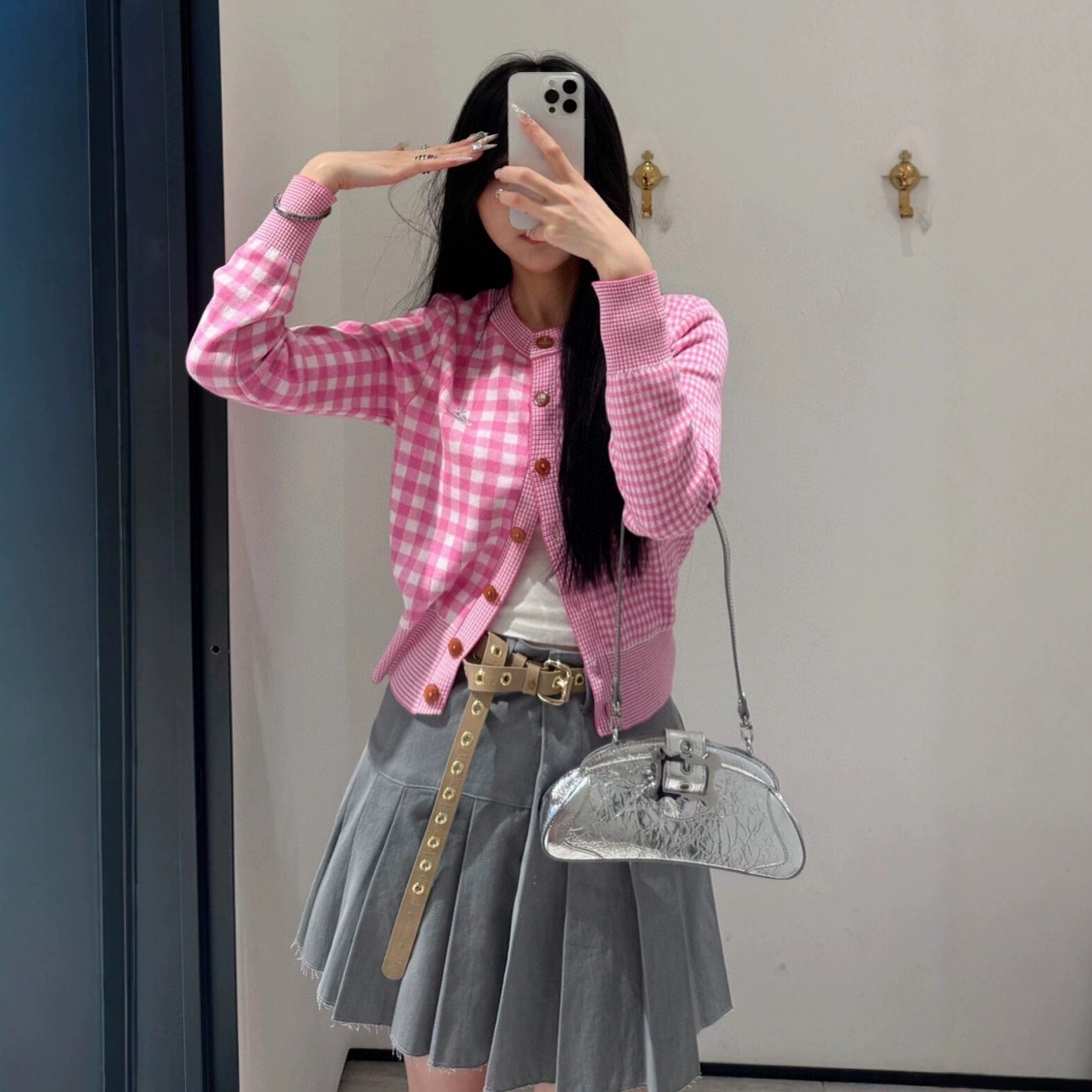 2025 봄 새로운 토성 격자 무늬 니트 카디건 여성 인스 타 그램 유행 새 스타일 라운드 넥 대비 컬러 코트 탑스토어 가기