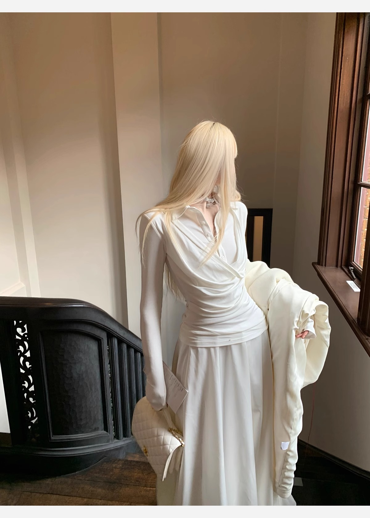 공식 피겨 실제 가격 봄과 가을 칼라 바느질 가짜 투피스 슬림 핏 긴팔 티셔츠 셔츠 여성 디자인 센스 우아한 탑