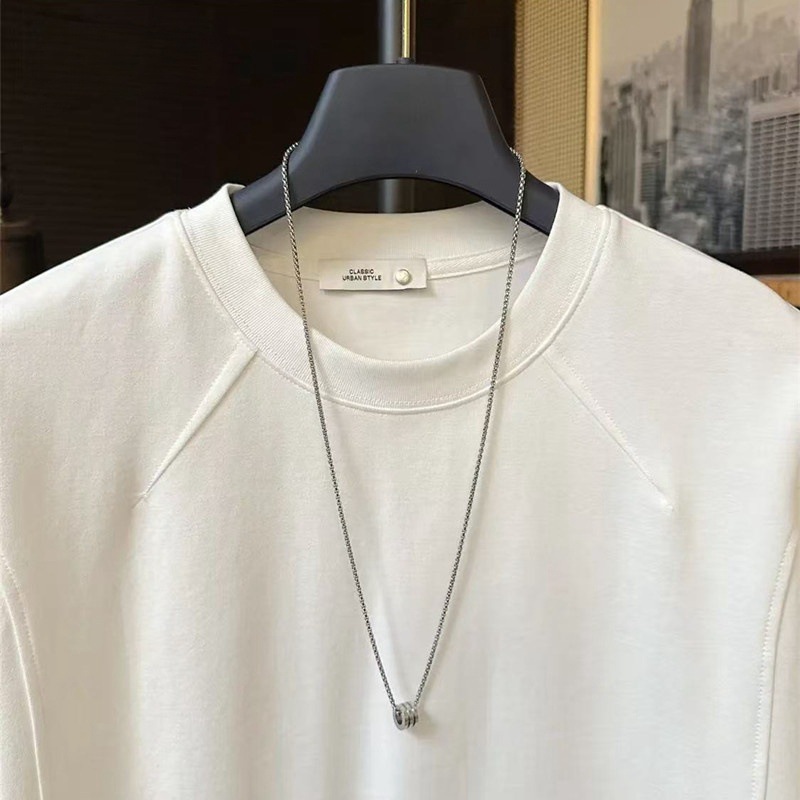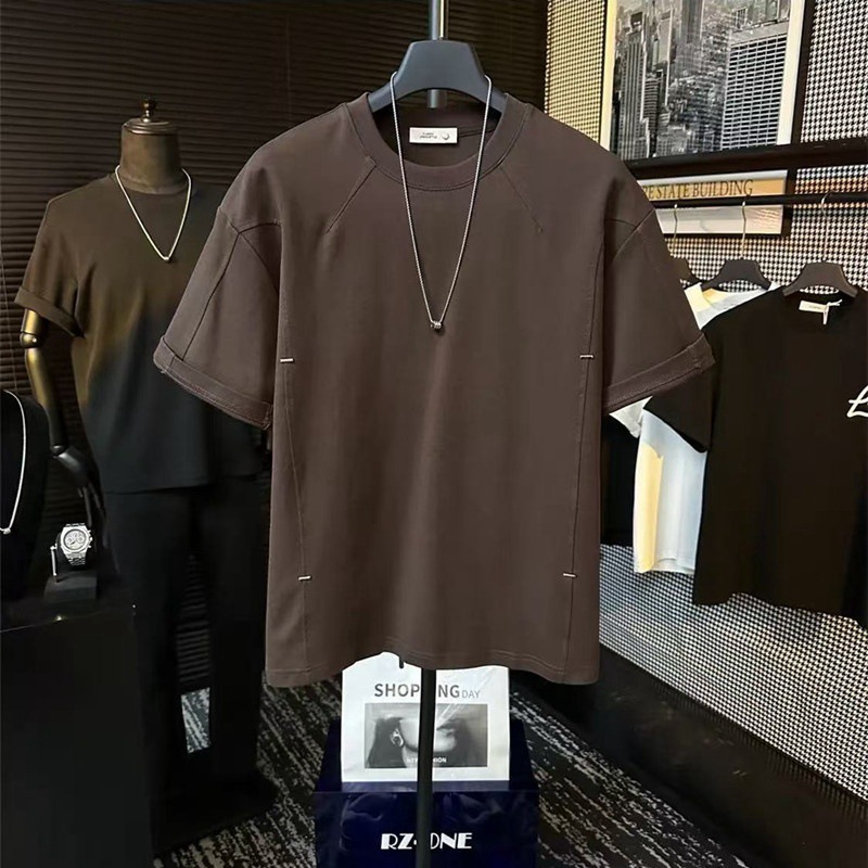 봄과 여름 새로운 남성 하이 세트 스티칭 네일 디자인 라이트 럭셔리 간단한 무거운 캐주얼 다목적 라운드 넥 짧은 소매 티셔츠