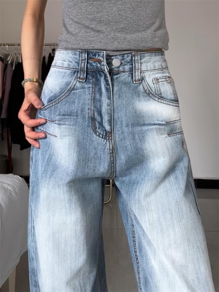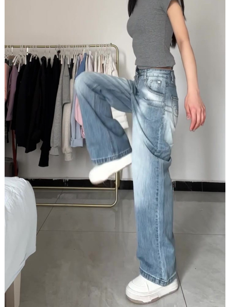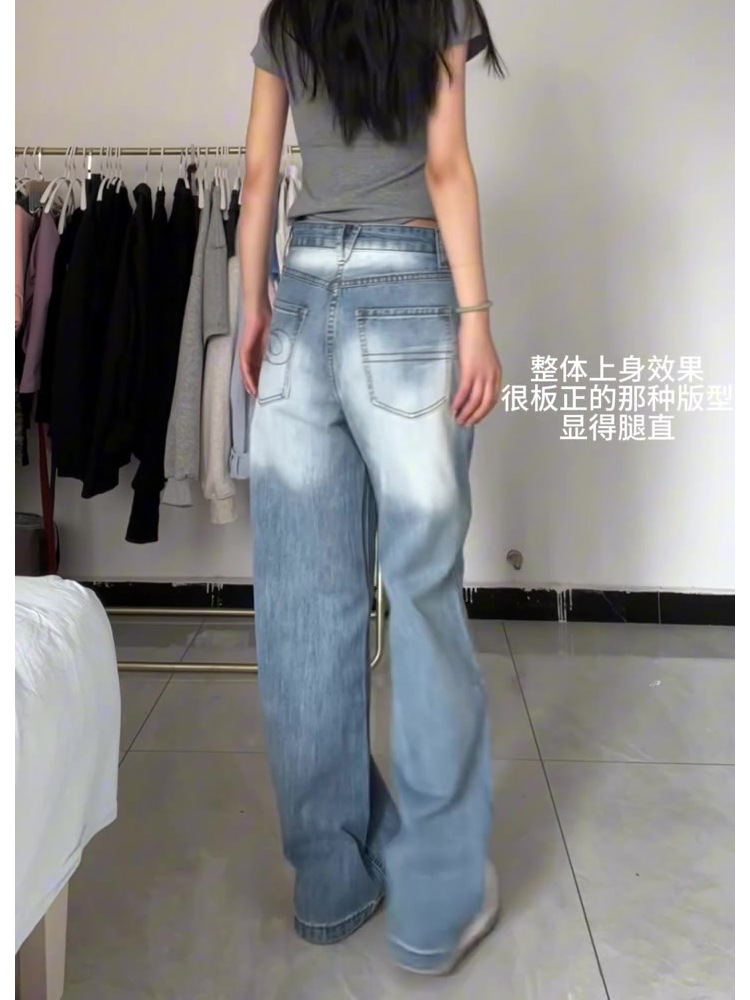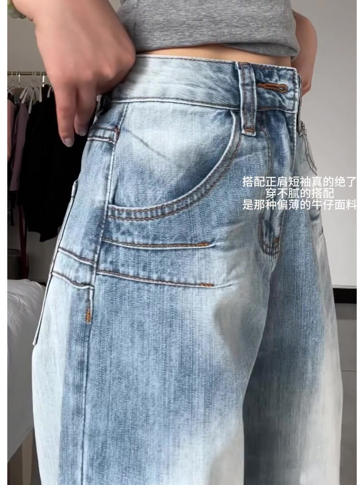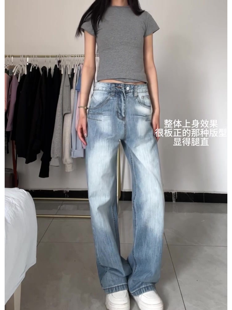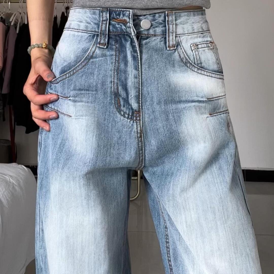 아메리칸 스타일 빈티지 세척 느슨한 스트레이트-다리 청바지 여성 여름 유행 새로운 올 매치 딥 와이드 레그 바지스토어 가기