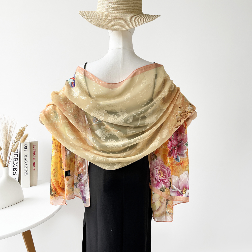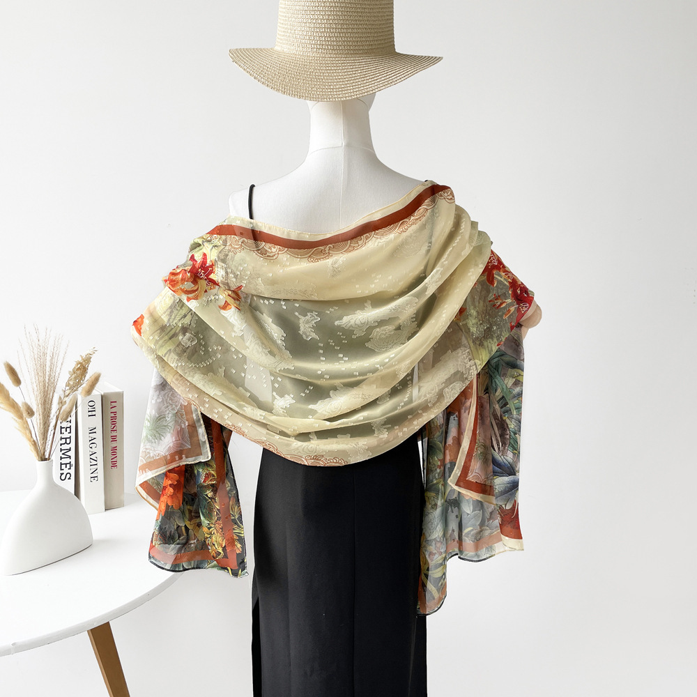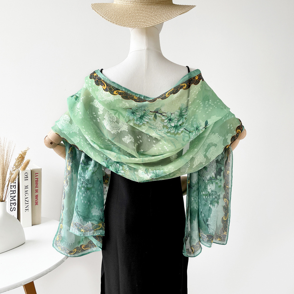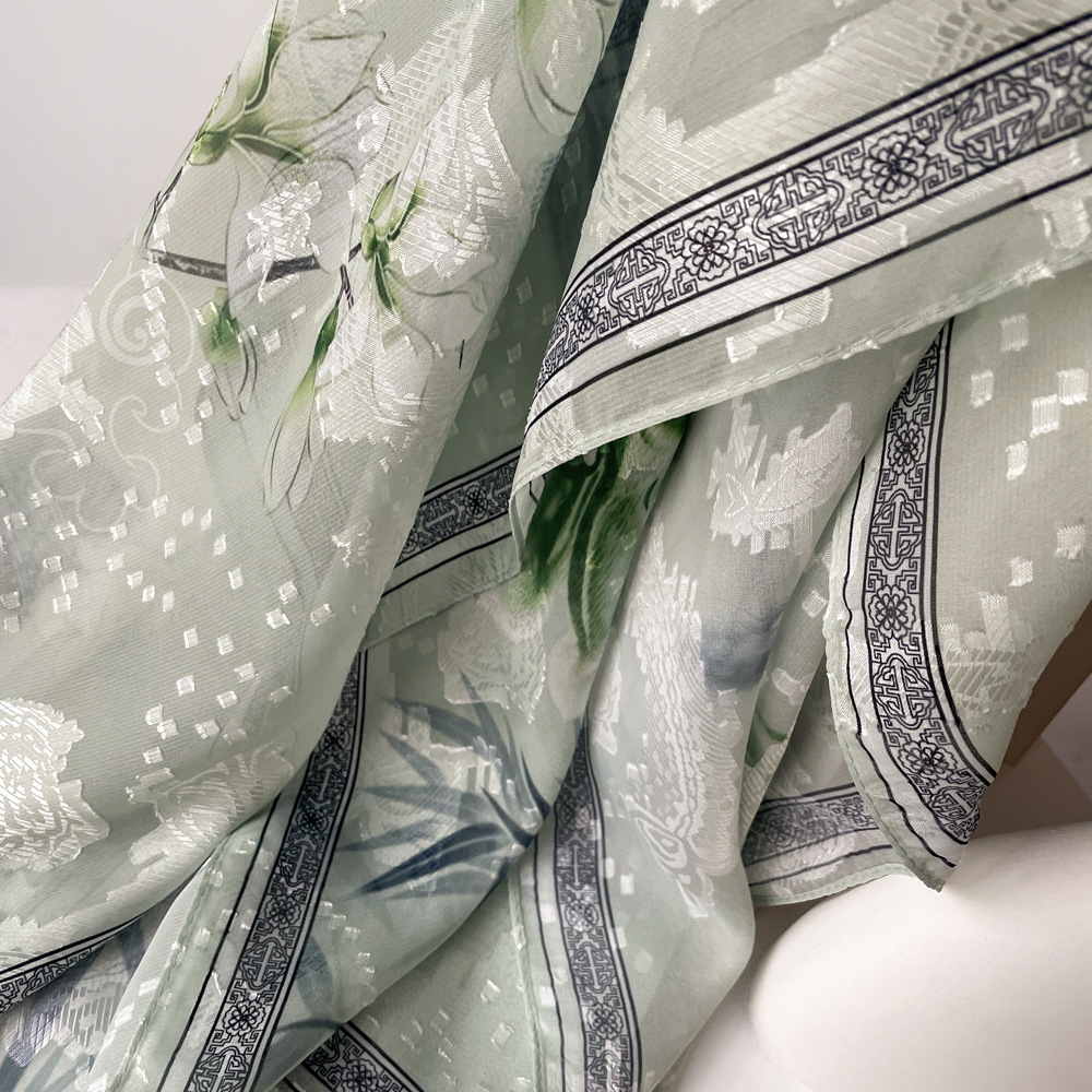 전국 타이드 그린 할로우 컷 꽃 저녁 식사 목도리 여성의 새로운 공예 인쇄 실크 스카프 고급 웨딩 스카프