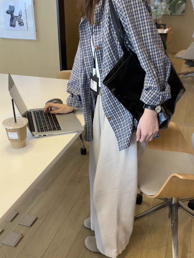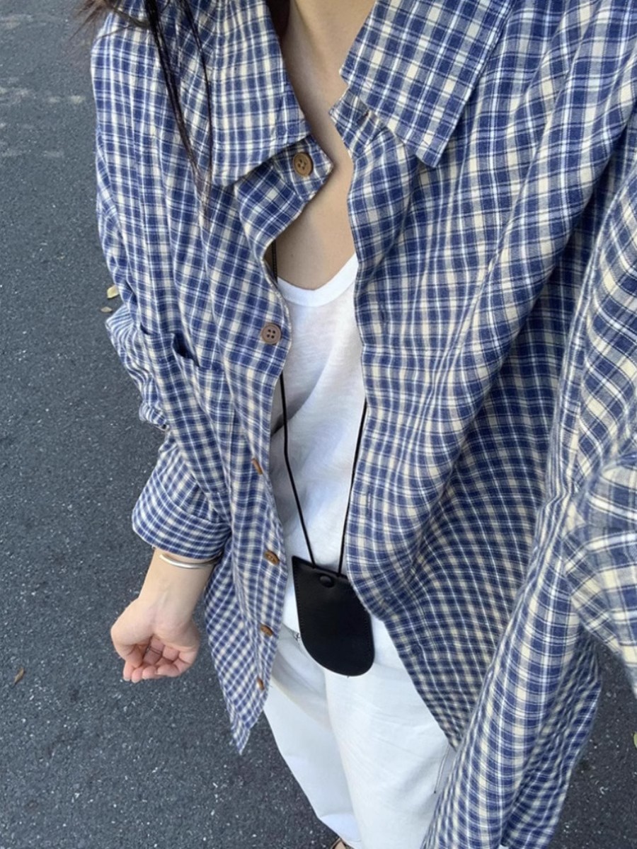 블루 격자 무늬 긴팔 셔츠 여성의 봄과 가을 새로운 선 스크린 셔츠 게으른 스타일 프렌치 루즈 탑 얇은 코트스토어 가기