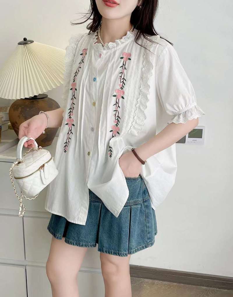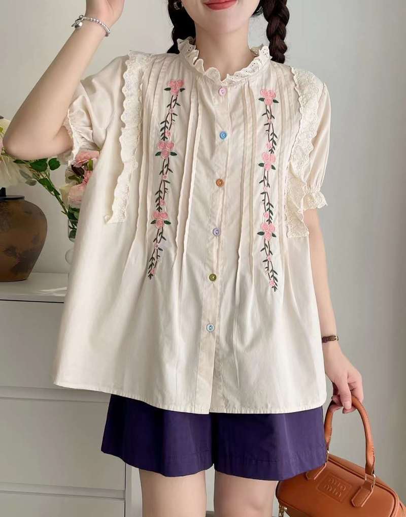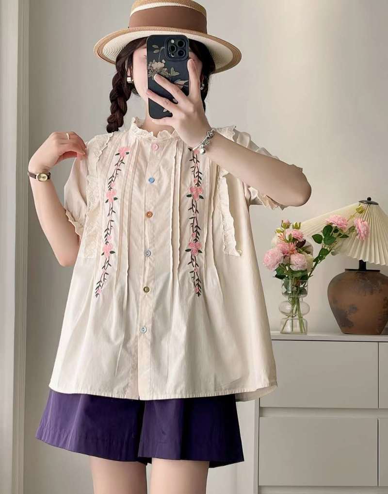 일본식 모리 여자의 칼라 레이스 자수 느슨한 여성용 카디건 셔츠 짧은 소매 탑