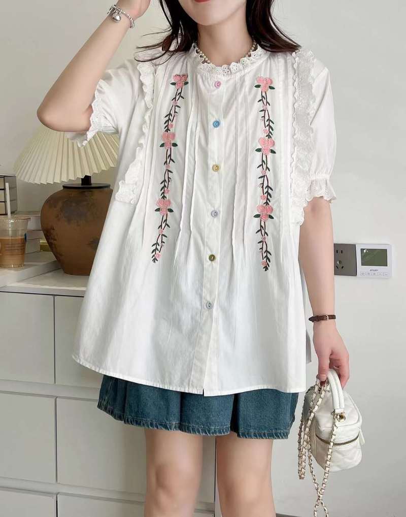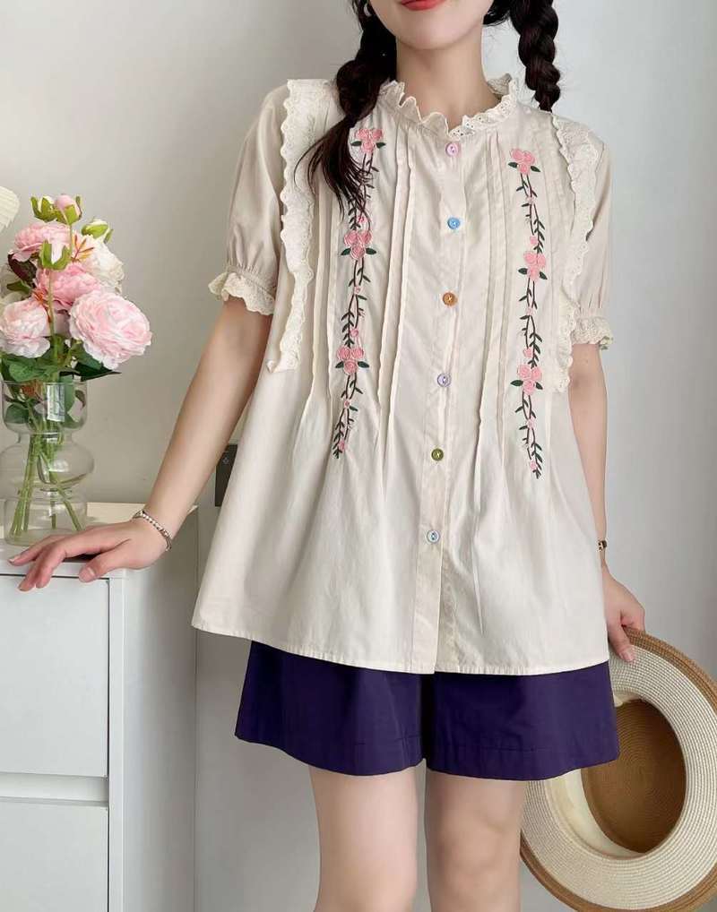 일본식 모리 여자의 칼라 레이스 자수 느슨한 여성용 카디건 셔츠 짧은 소매 탑스토어 가기