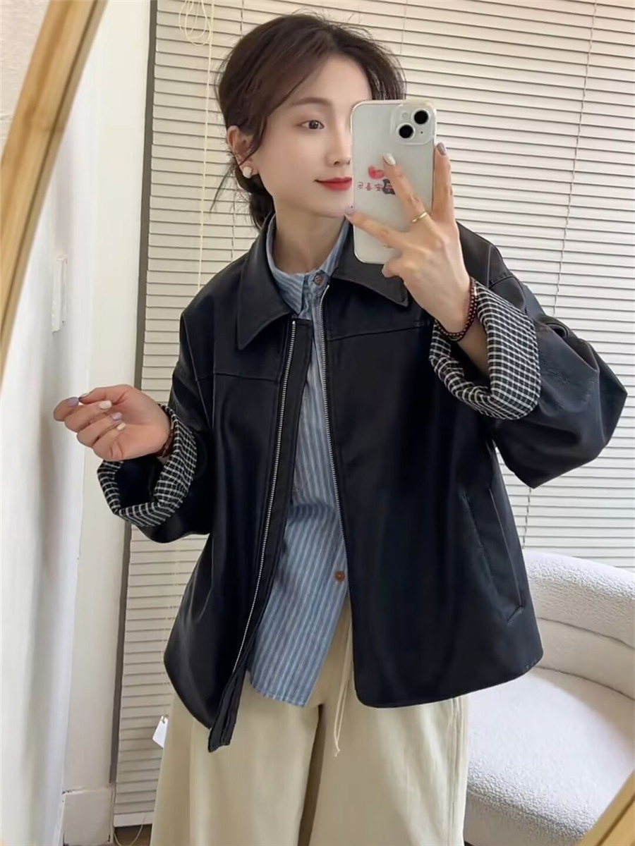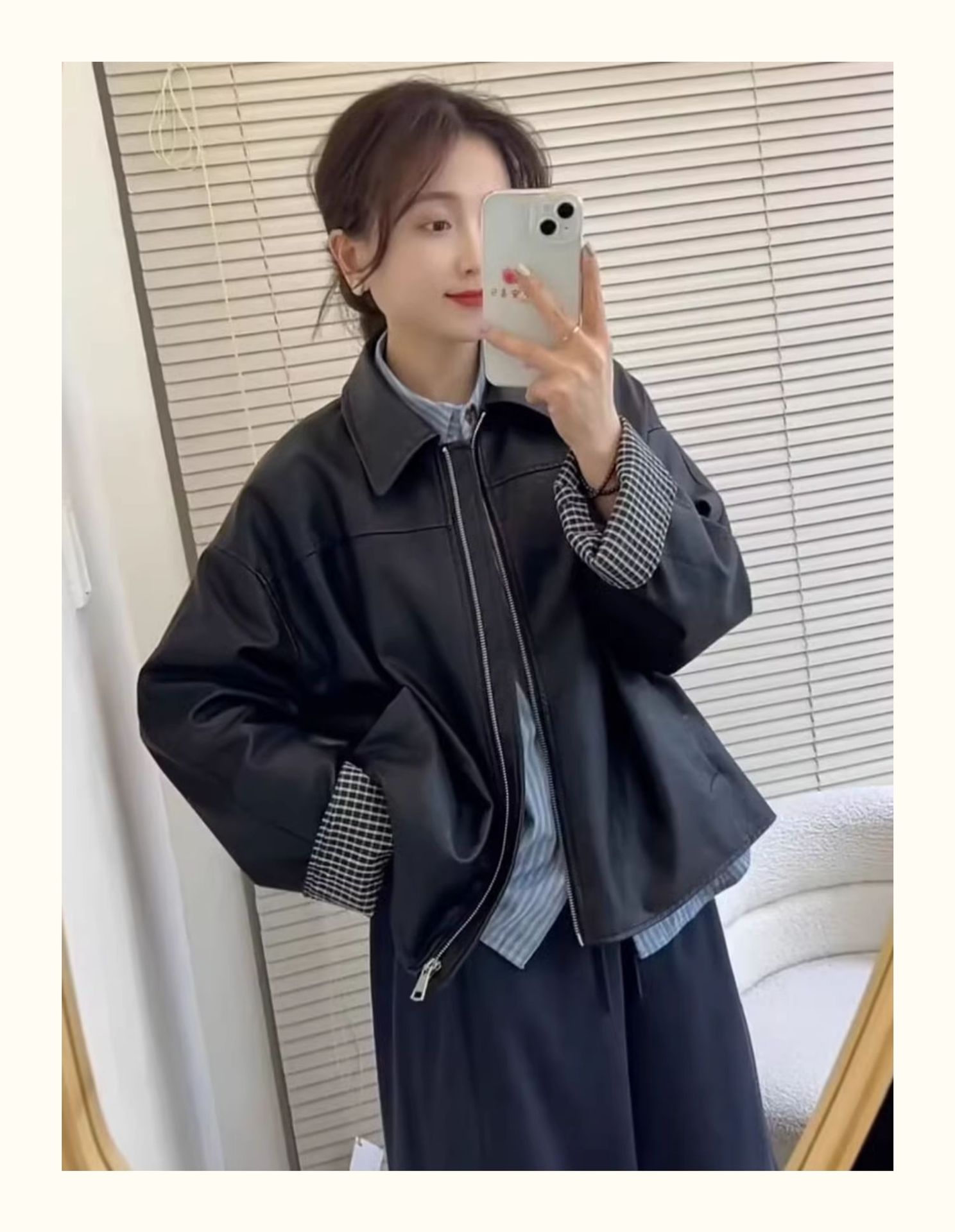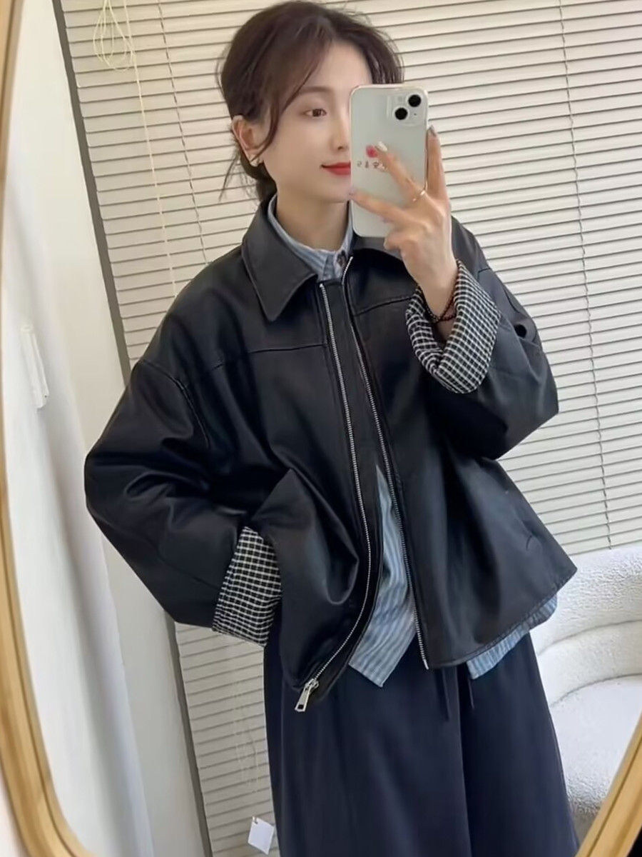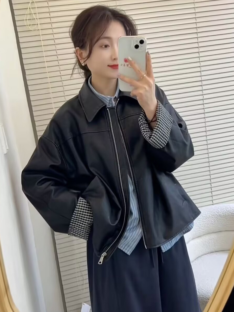 하이 엔드 레트로 격자 무늬 가죽 자켓 여성용 2025 봄 새로운 루즈 캐주얼 올 매치 PU 가죽 자켓스토어 가기
