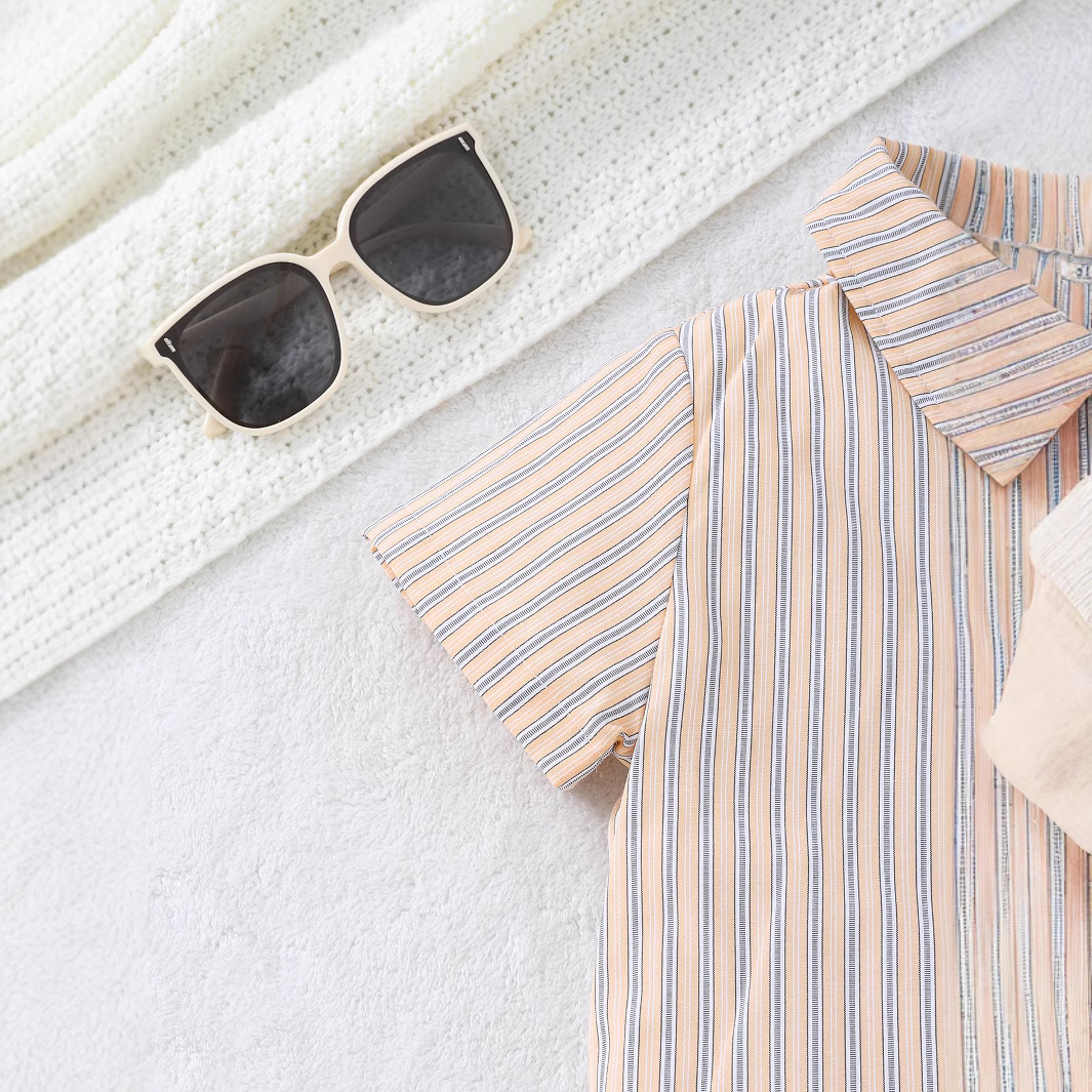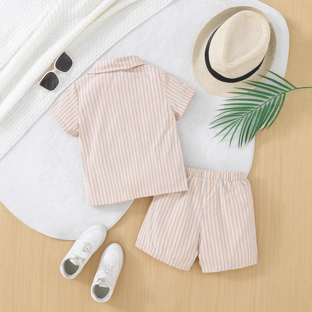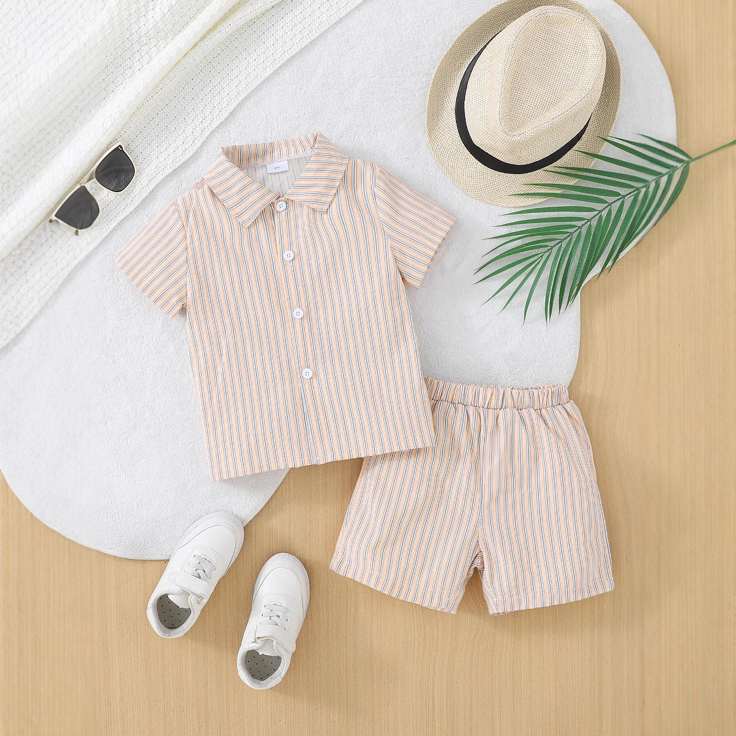 두 조각 소년의 줄무늬 인쇄 셔츠 칼라 싱글 가슴 오픈 라켓 짧은 소매 셔츠 및 느슨한 허리 캐주얼 반바지스토어 가기