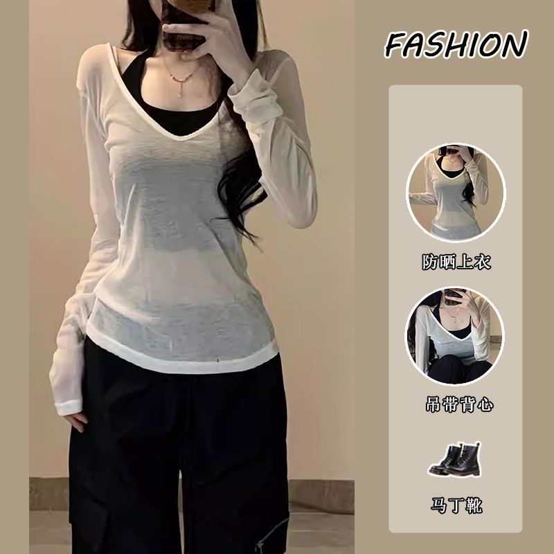 바람 뜨거운 소녀에 대한 순수한 욕망 세트 여성의 2025 년 여름 태양 긴 소매 블라우스 탑 목에 매달린 서스펜더 투피스 세트 조수스토어 가기