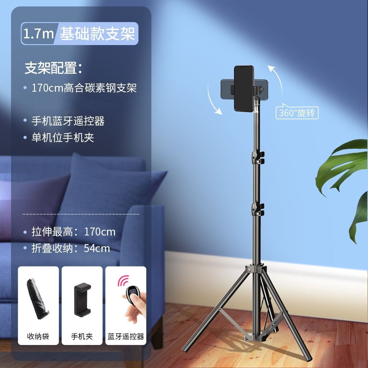 • 블랙 - 1.7m 싱글 카메라 라이브 방송 브래킷 + 블루투스 셀카