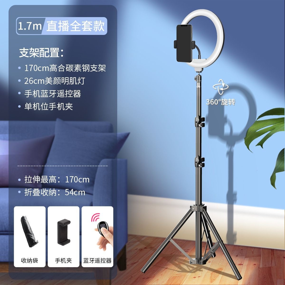 • 블랙 - 1.7m 싱글 카메라 라이브 방송 브래킷 + 블루투스 셀카 + 필 라이트