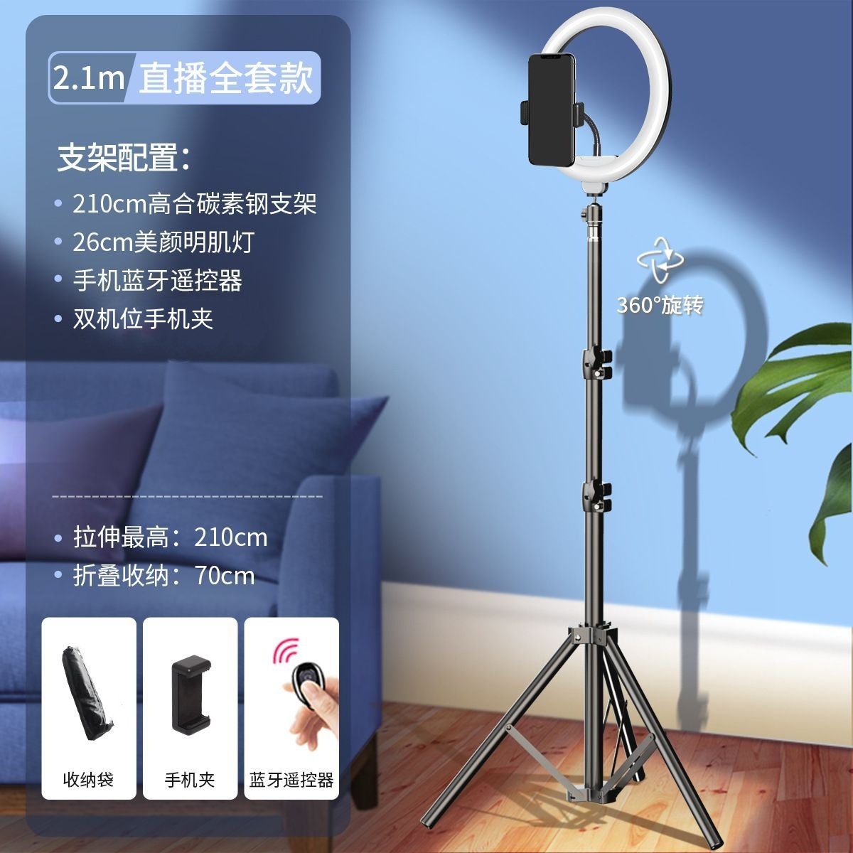 • 블랙 - 2.1m 듀얼 카메라 라이브 방송 브래킷 + 블루투스 셀카 + 필 라이트
