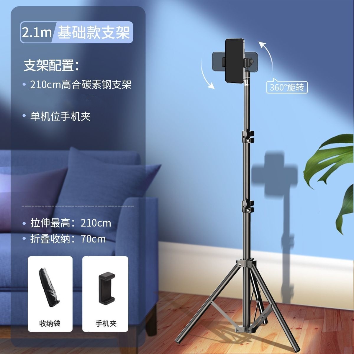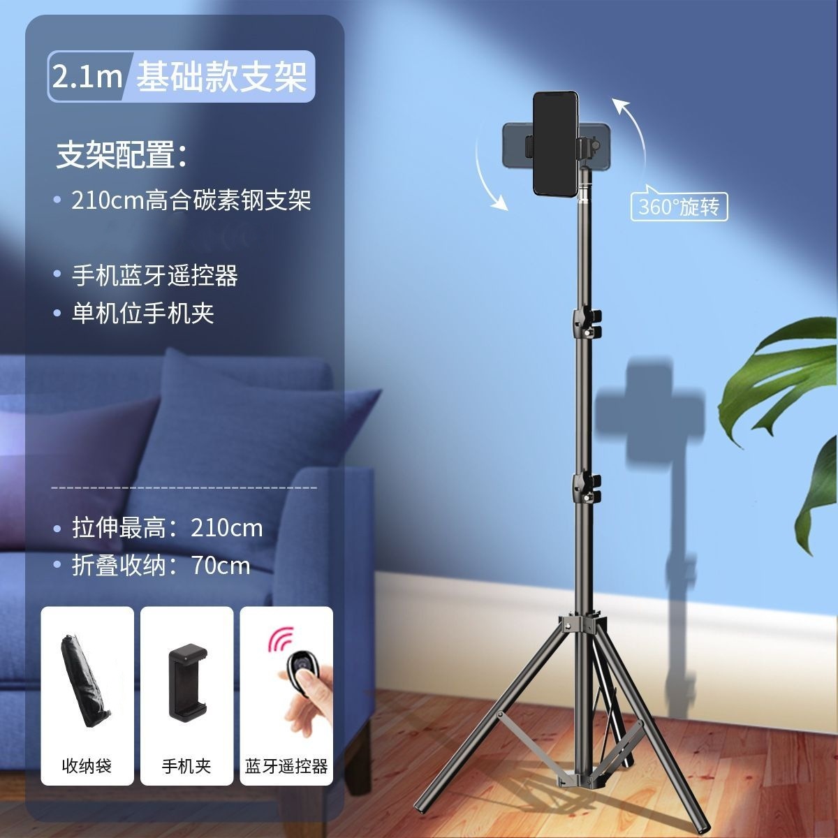 • 블랙 - 2.1m 싱글 카메라 라이브 방송 브래킷 + 블루투스 셀카
