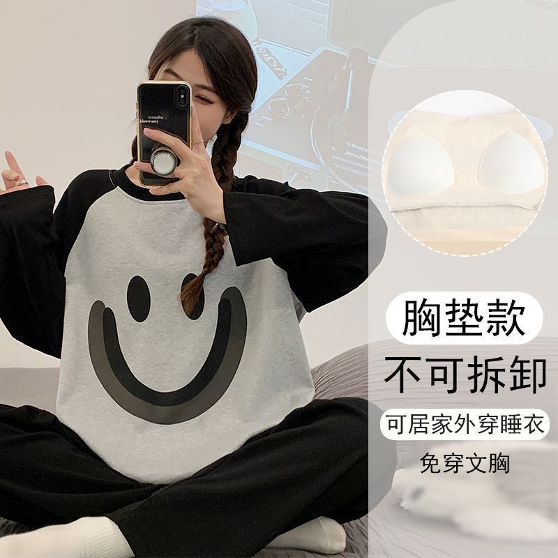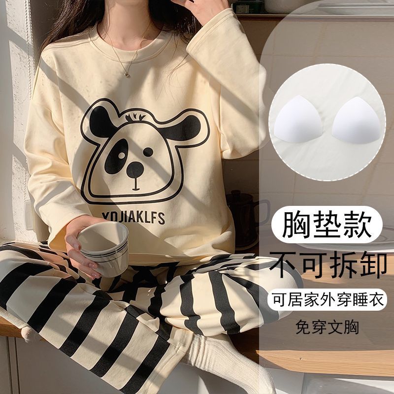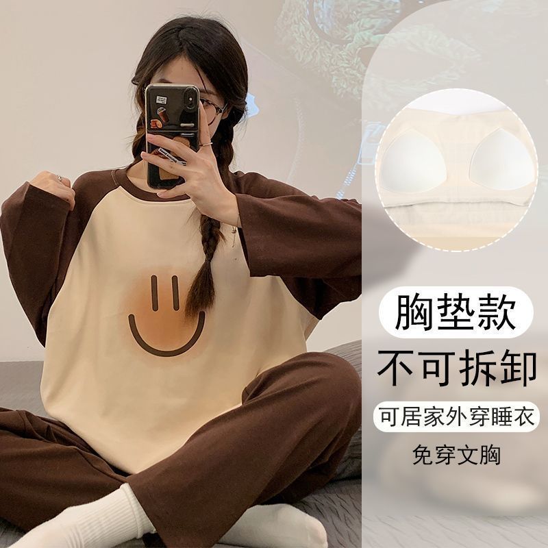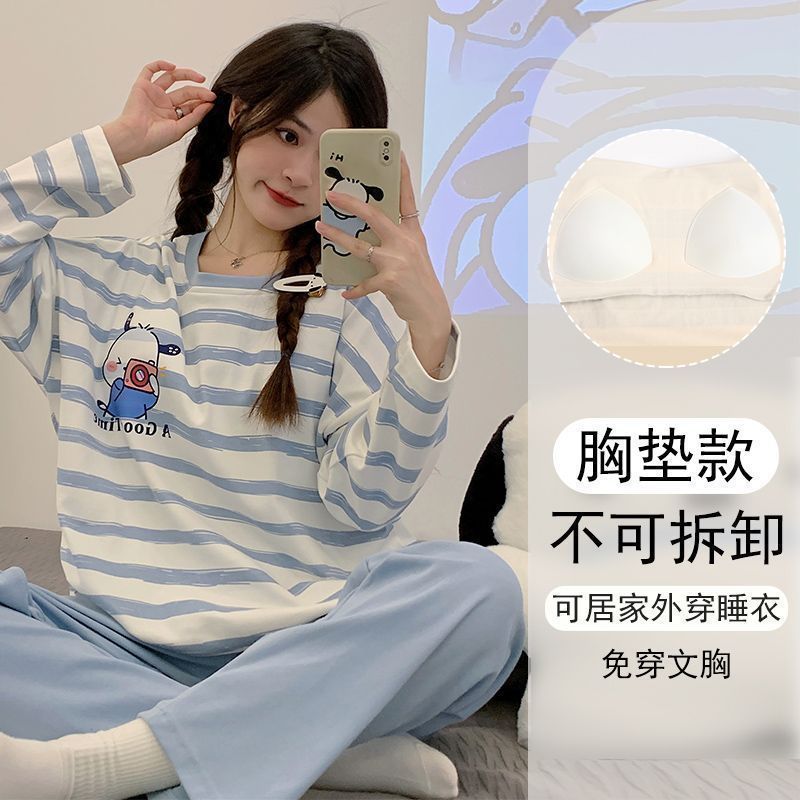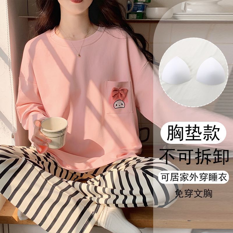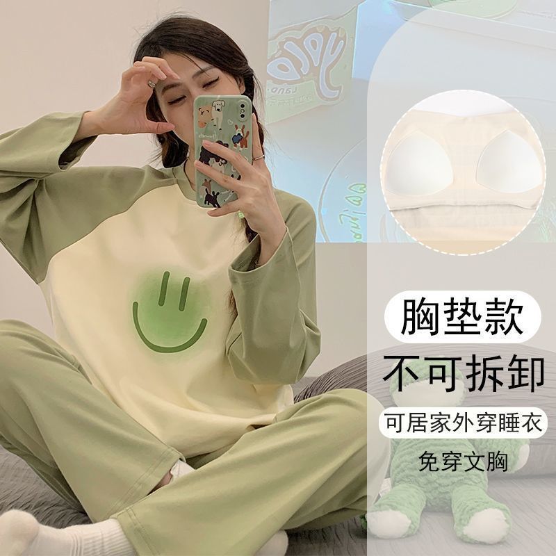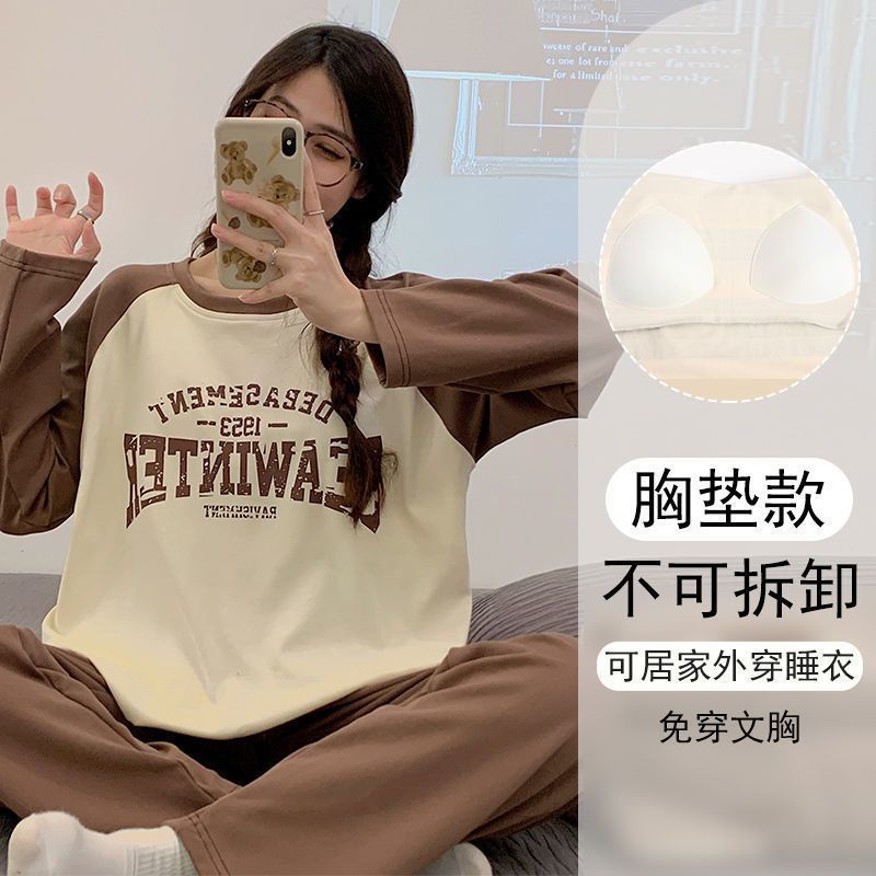 가슴 패드와 함께 잠옷 여성의 긴 소매 2025 새로운 봄과 가을 세트 학생 기숙사 플러스 사이즈 가정 옷을 입고스토어 가기