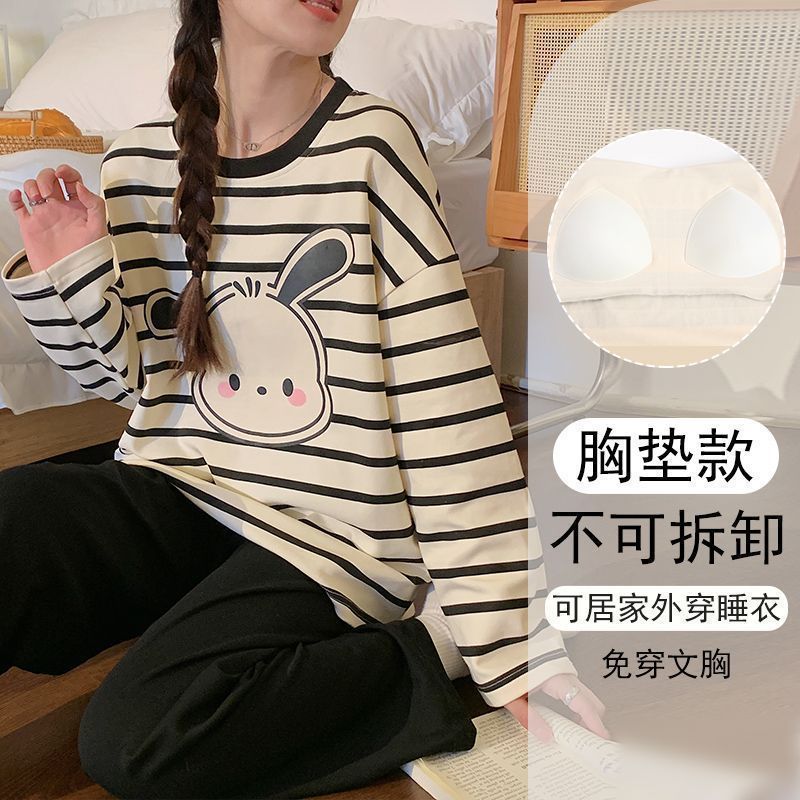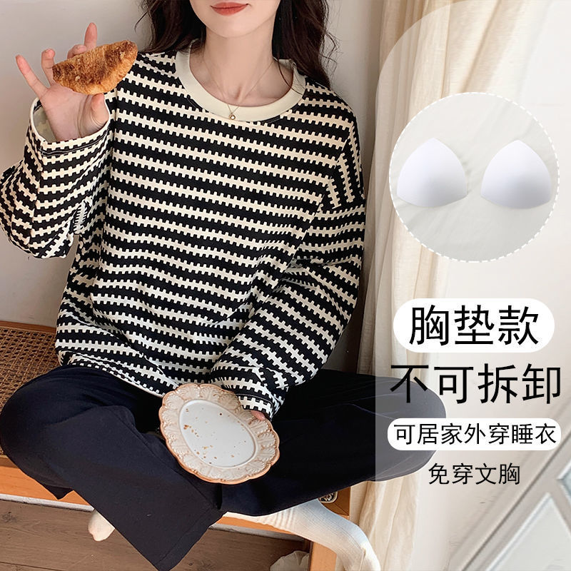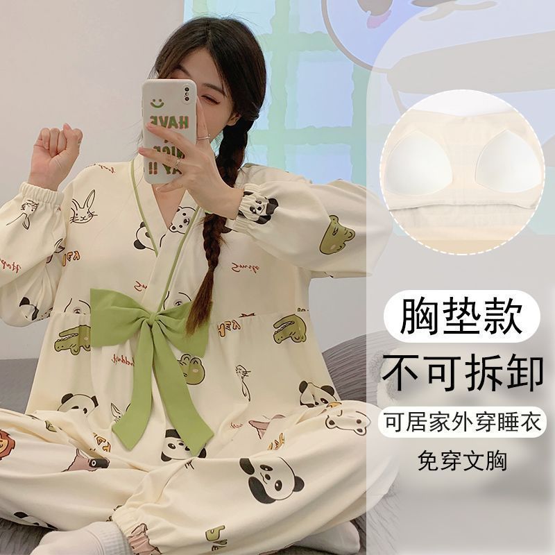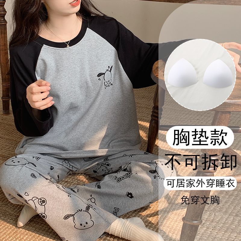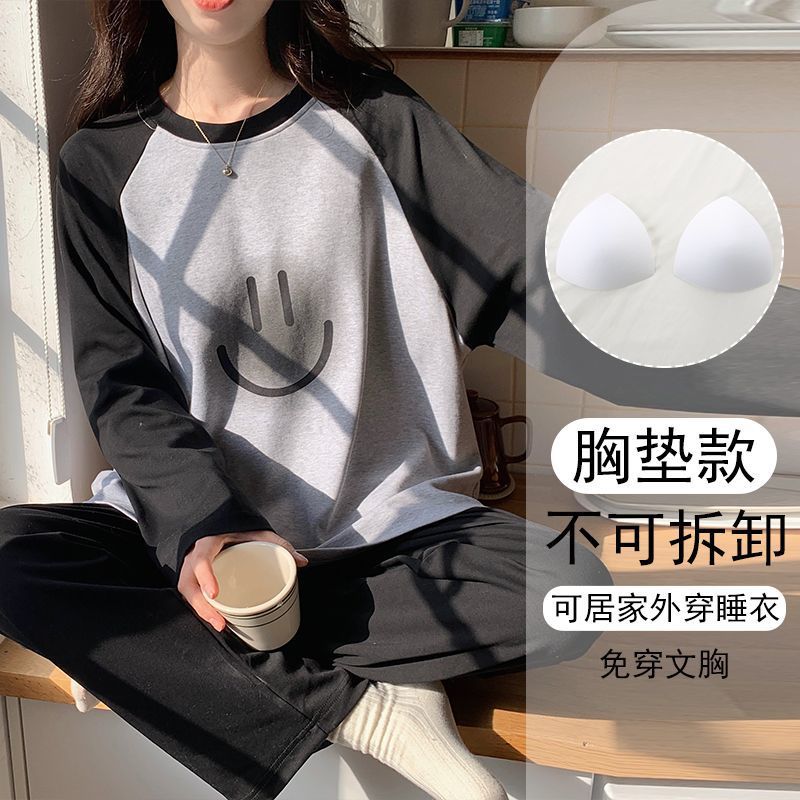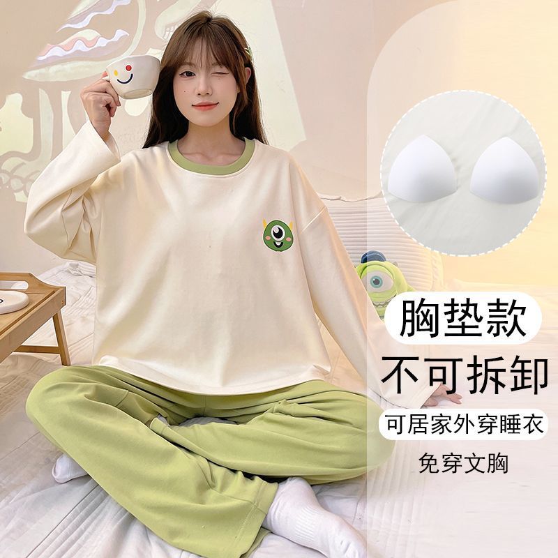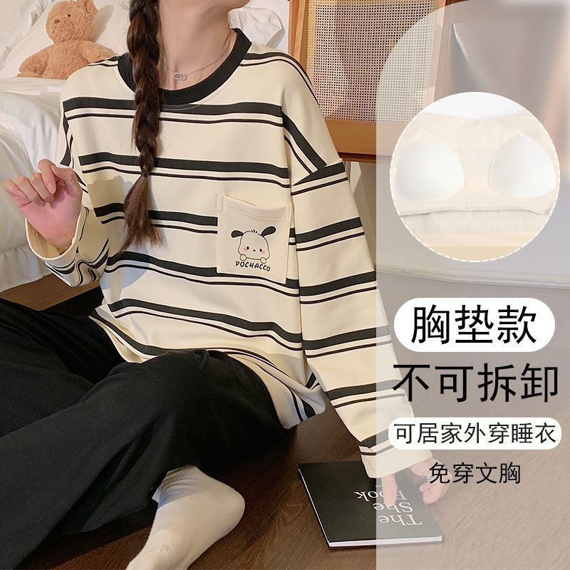 가슴 패드와 함께 잠옷 여성의 긴 소매 2025 새로운 봄과 가을 세트 학생 기숙사 플러스 사이즈 가정 옷을 입고스토어 가기