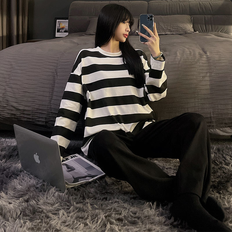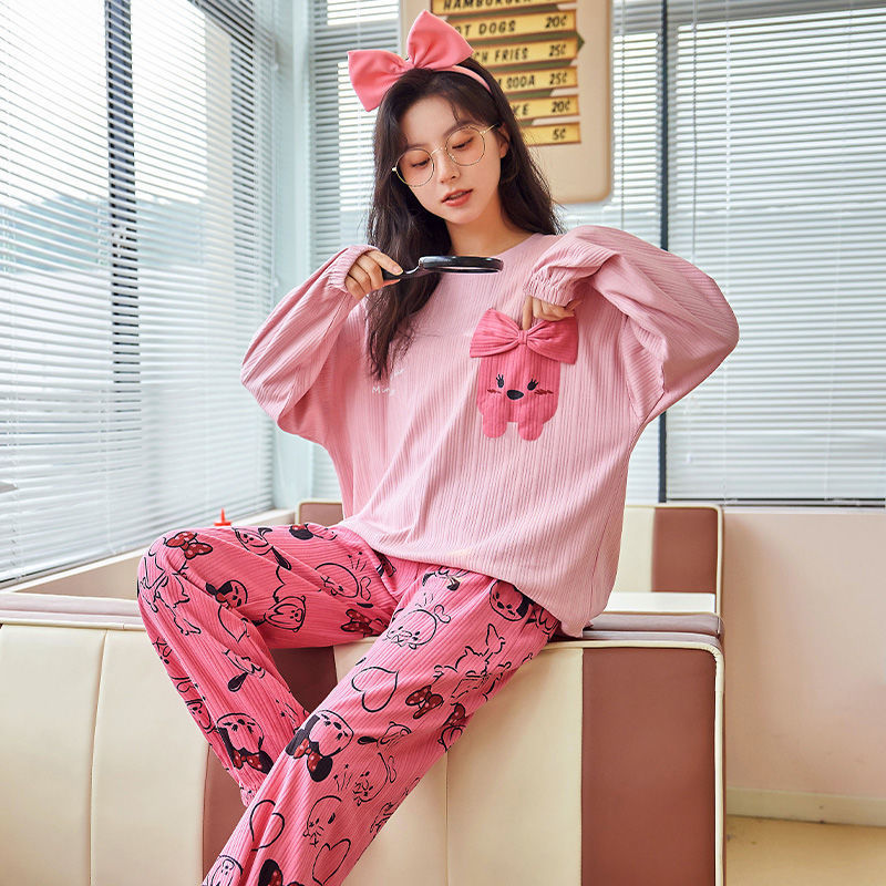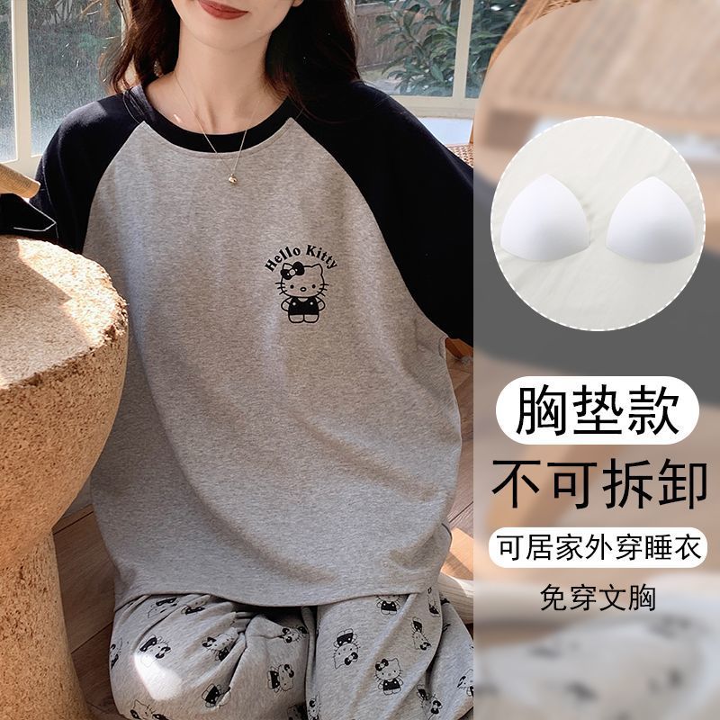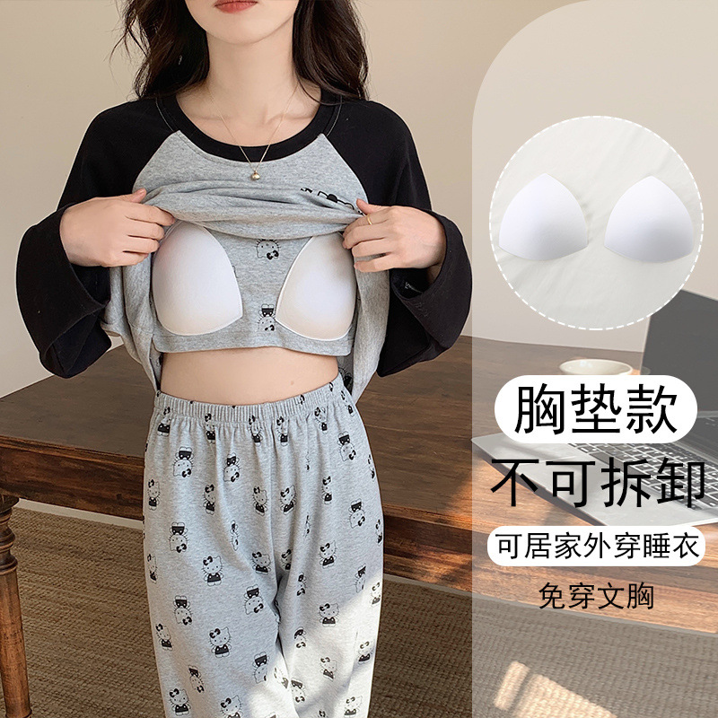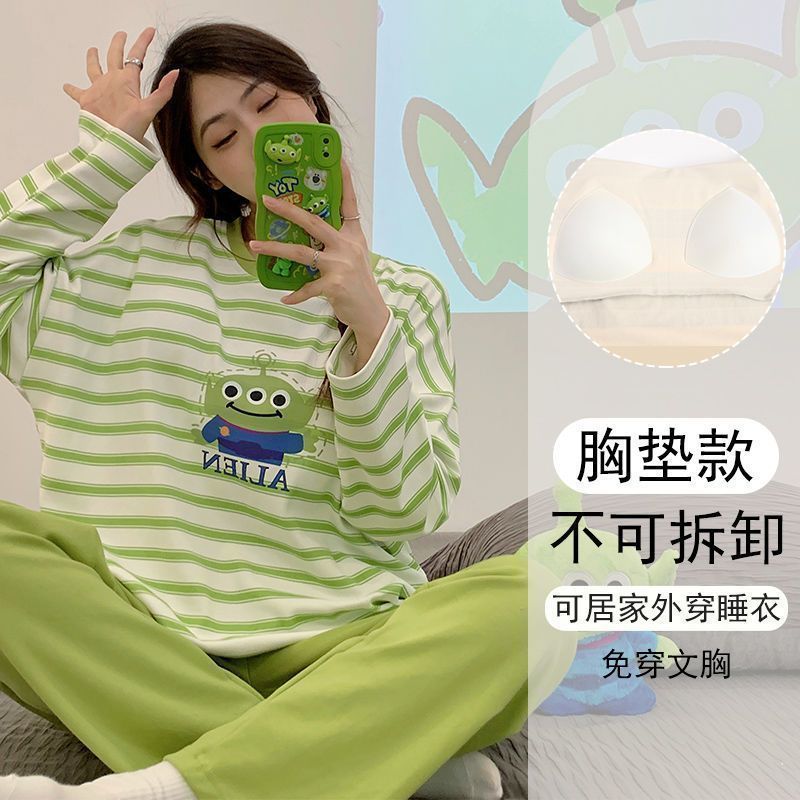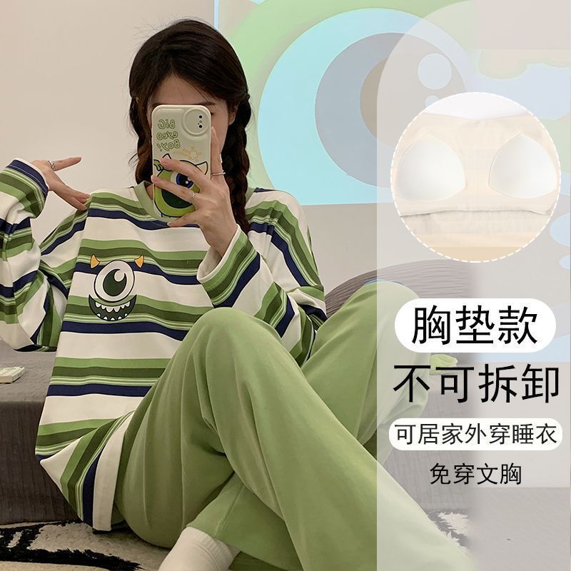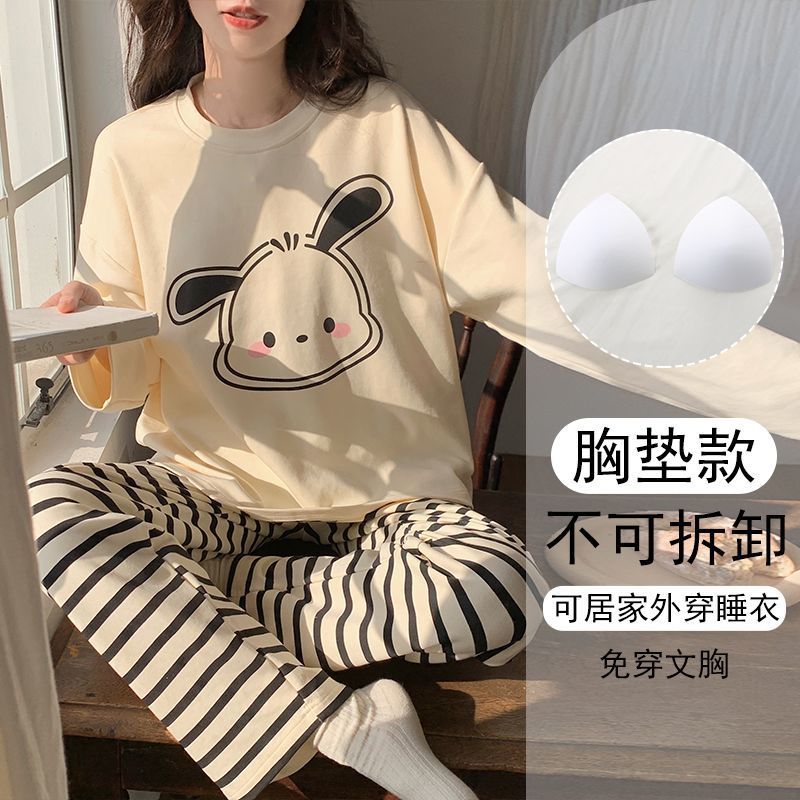 가슴 패드와 함께 잠옷 여성의 긴 소매 2025 새로운 봄과 가을 세트 학생 기숙사 플러스 사이즈 가정 옷을 입고스토어 가기