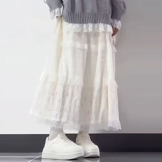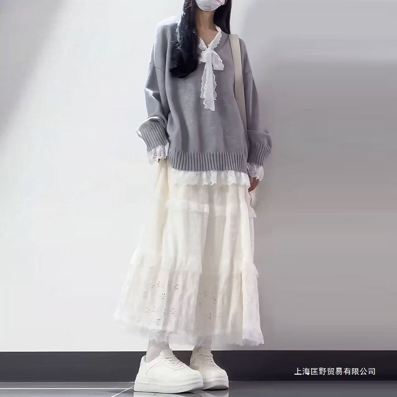 부드러운 스타일 우아한 달콤한 레이스 바느질 니트웨어 느슨한 스웨터 높은 허리 레이스 레이스 스커트 세트스토어 가기