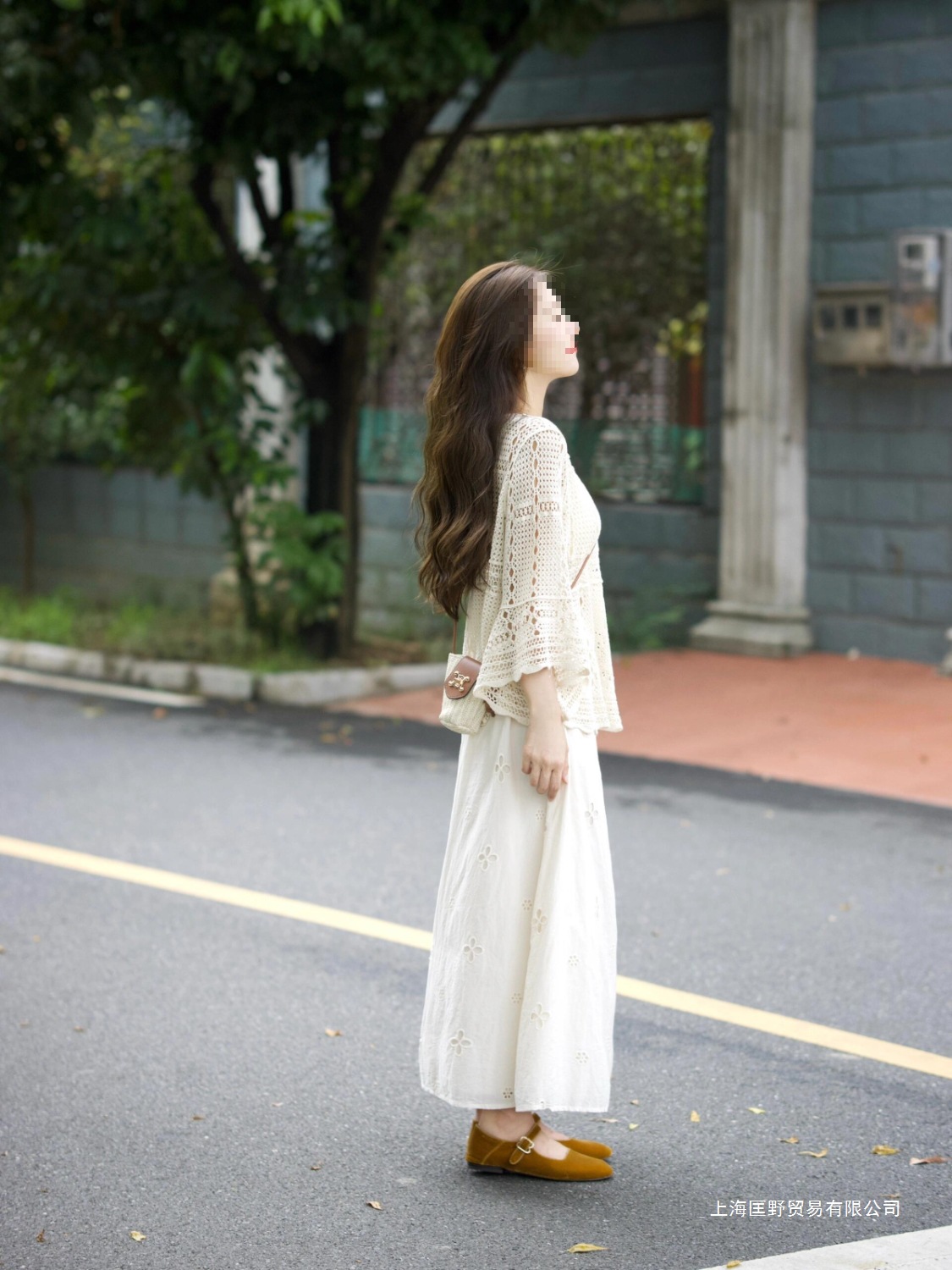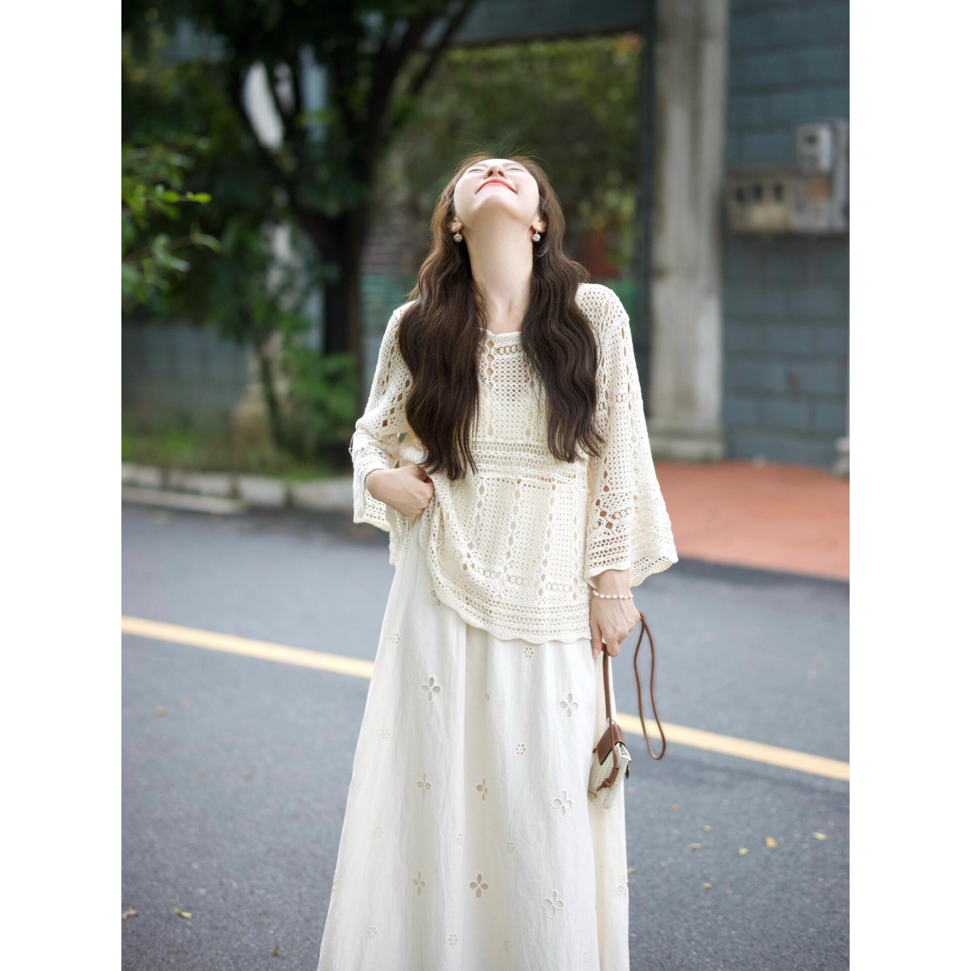 프랑스 게으른 크로 셰 뜨개질 니트 블라우스 흰색 자카드 모양 스커트 투피스 여성 세트와 함께 이른 가을스토어 가기