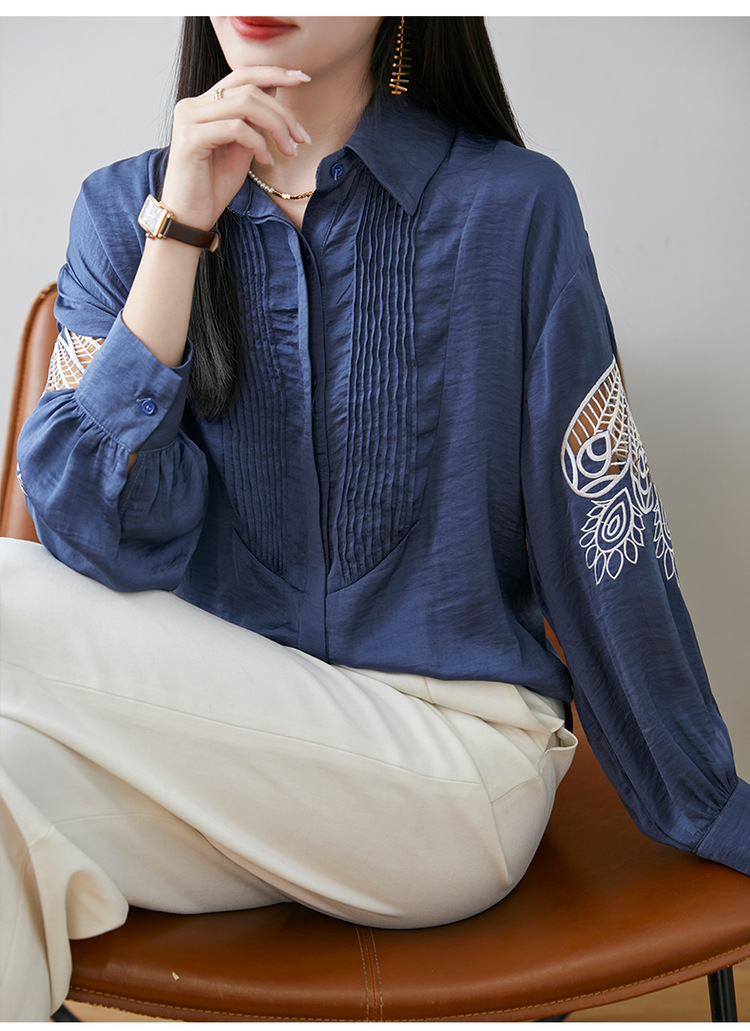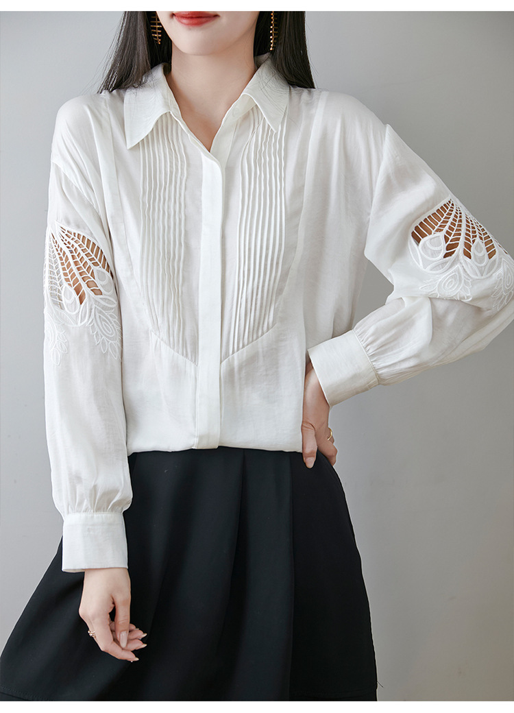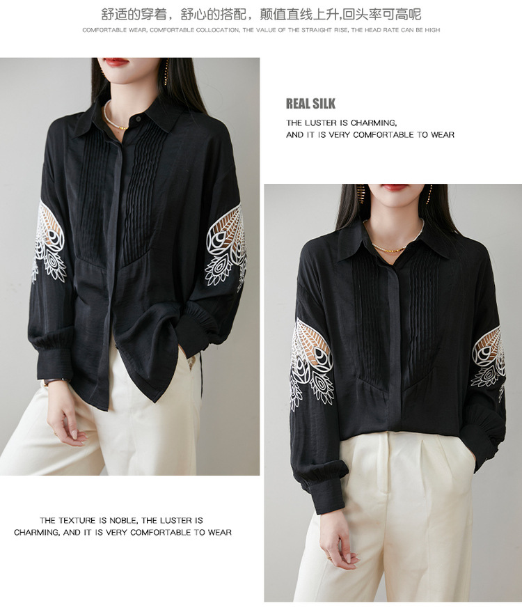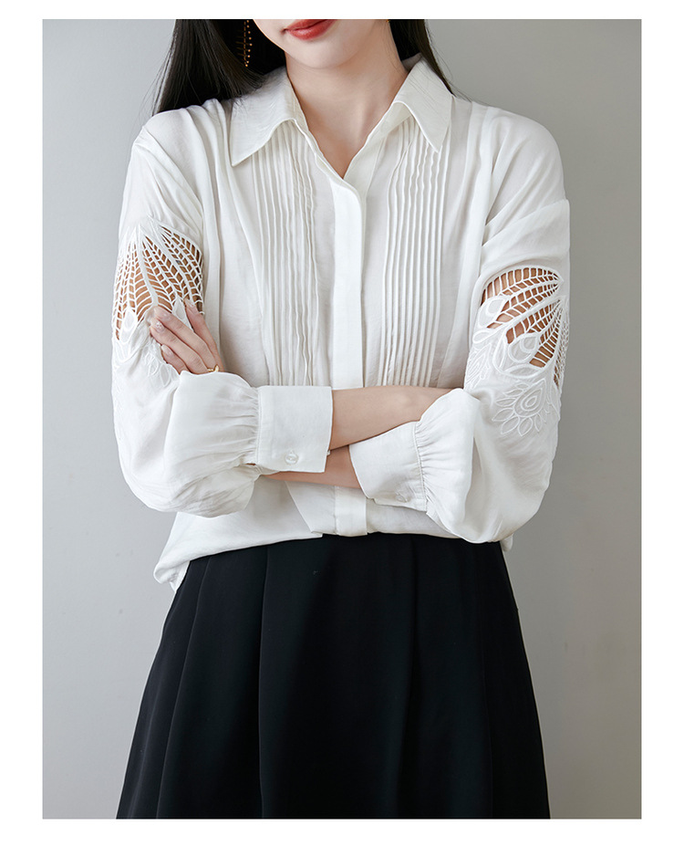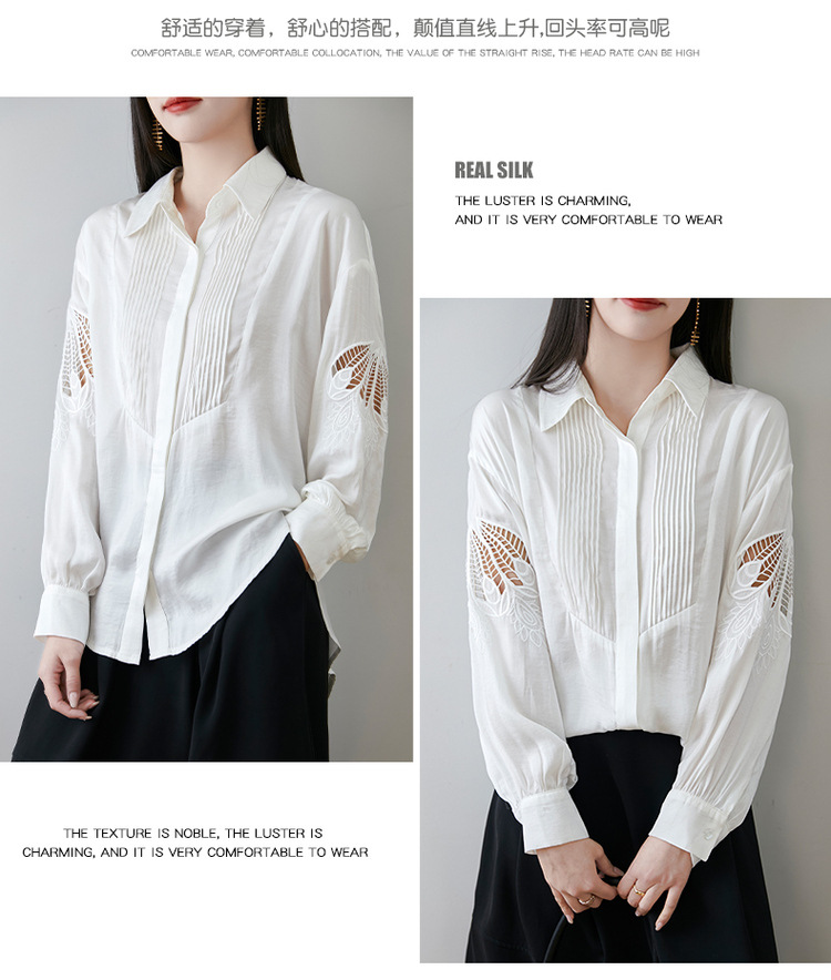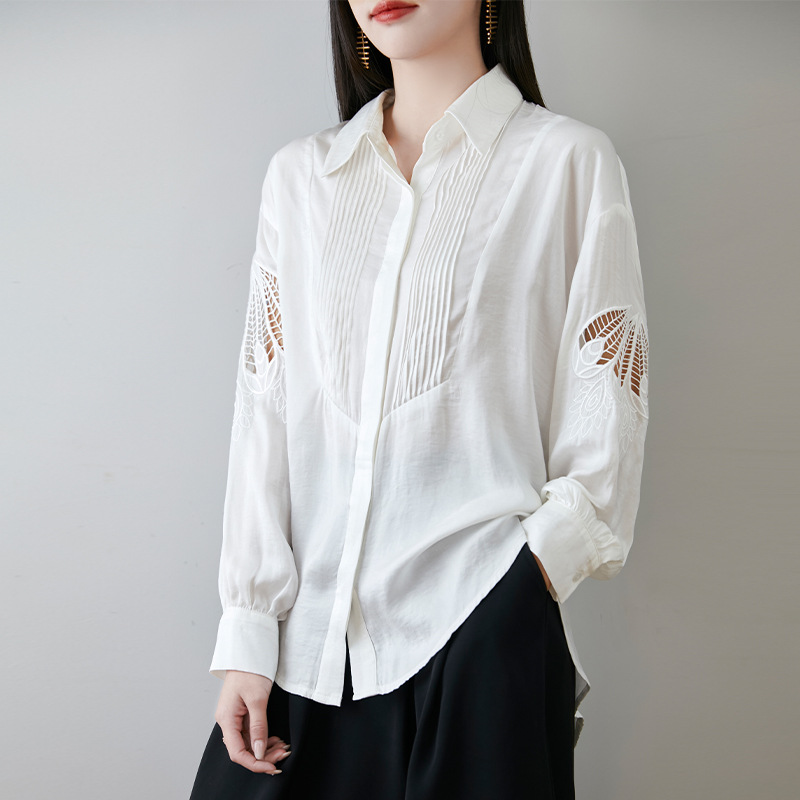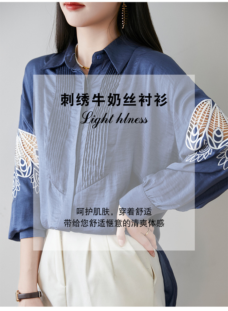 2025 봄과 여름 새로운 디자인 감각 폴로 칼라 우유 실크 셔츠 여성 자수 중공 디자인 감각