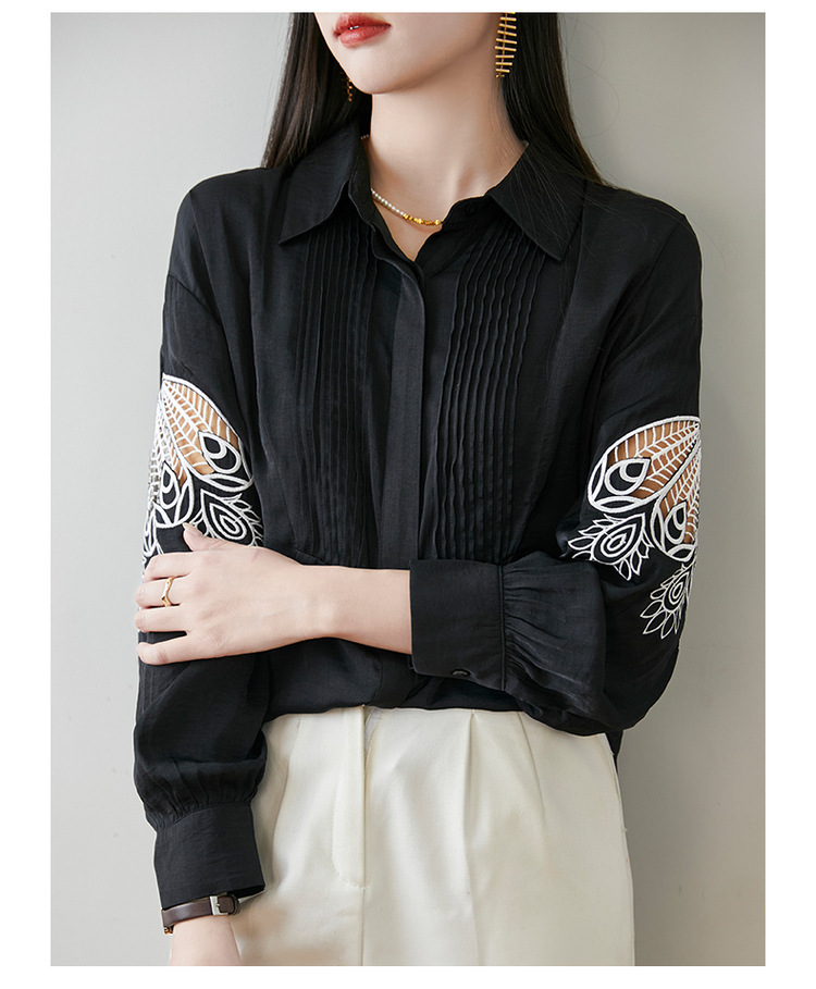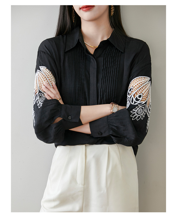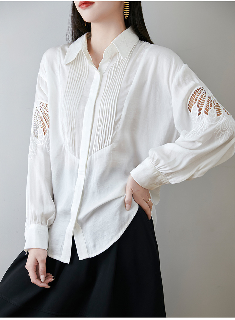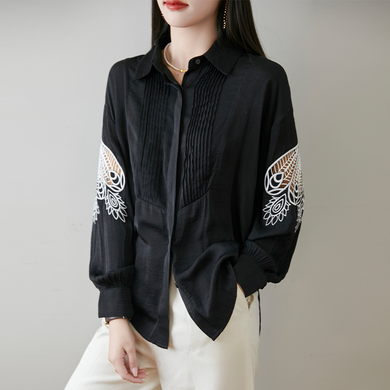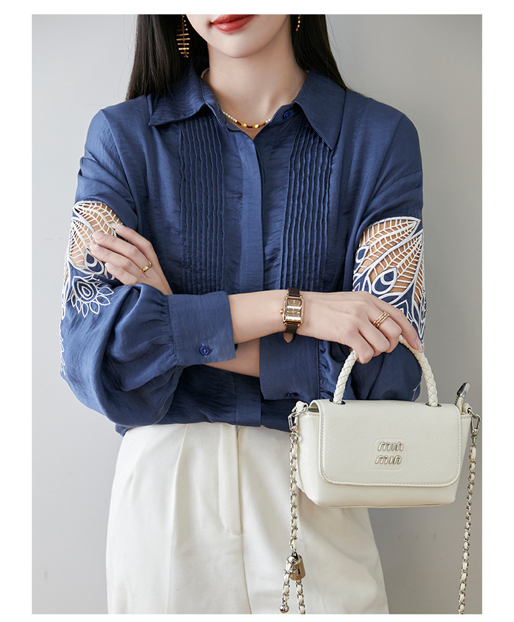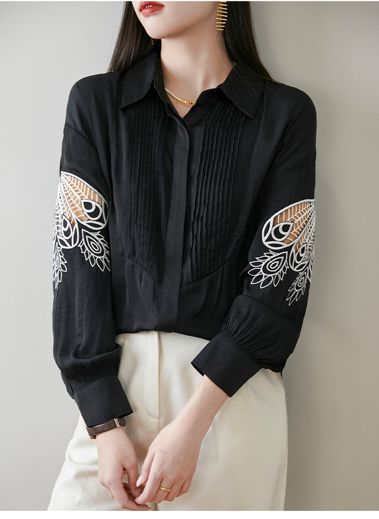 2025 봄과 여름 새로운 디자인 감각 폴로 칼라 우유 실크 셔츠 여성 자수 중공 디자인 감각