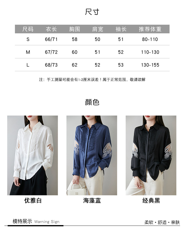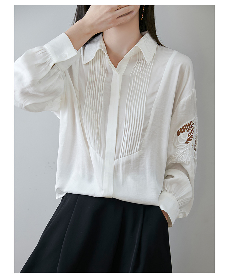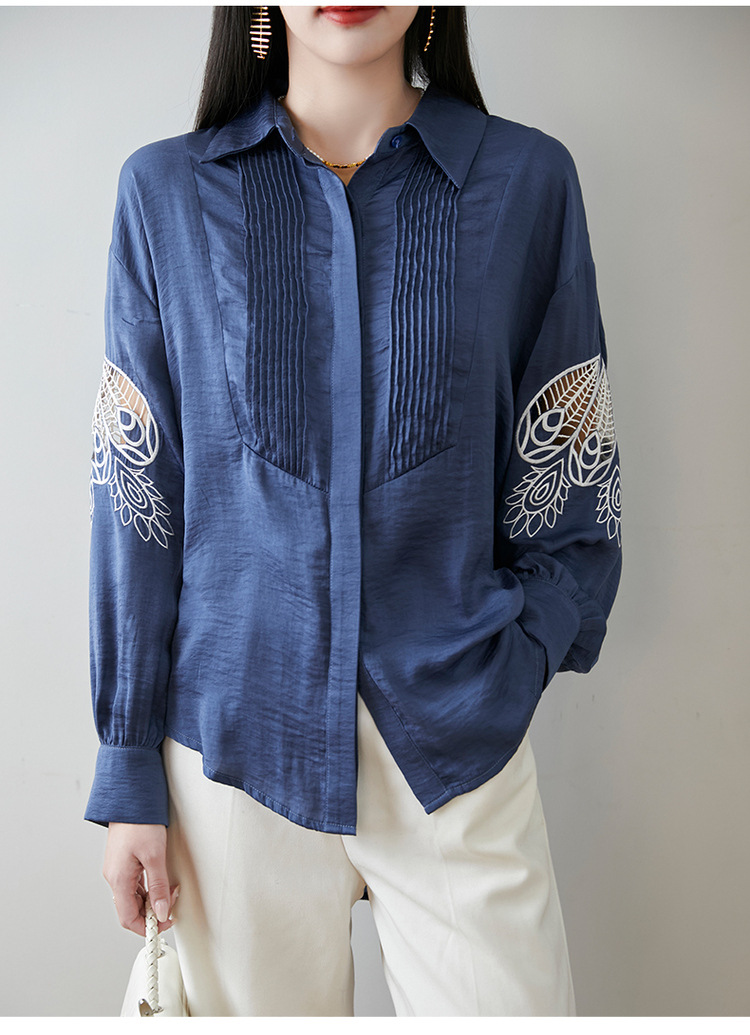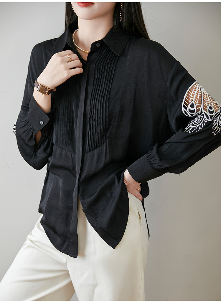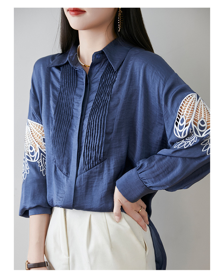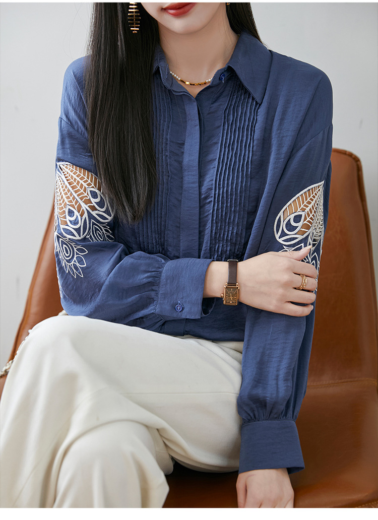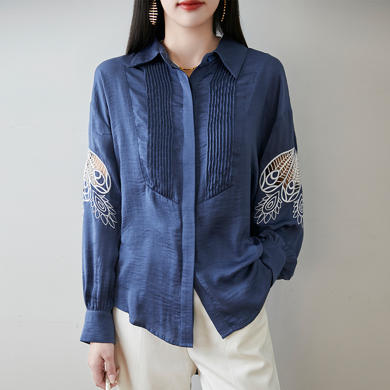 2025 봄과 여름 새로운 디자인 감각 폴로 칼라 우유 실크 셔츠 여성 자수 중공 디자인 감각