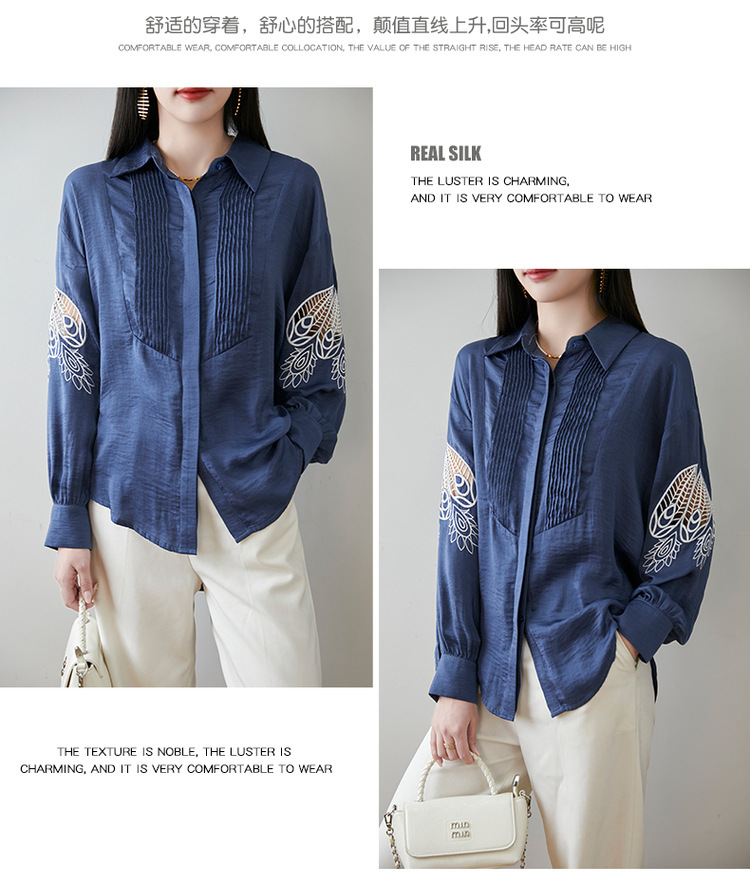 2025 봄과 여름 새로운 디자인 감각 폴로 칼라 우유 실크 셔츠 여성 자수 중공 디자인 감각스토어 가기