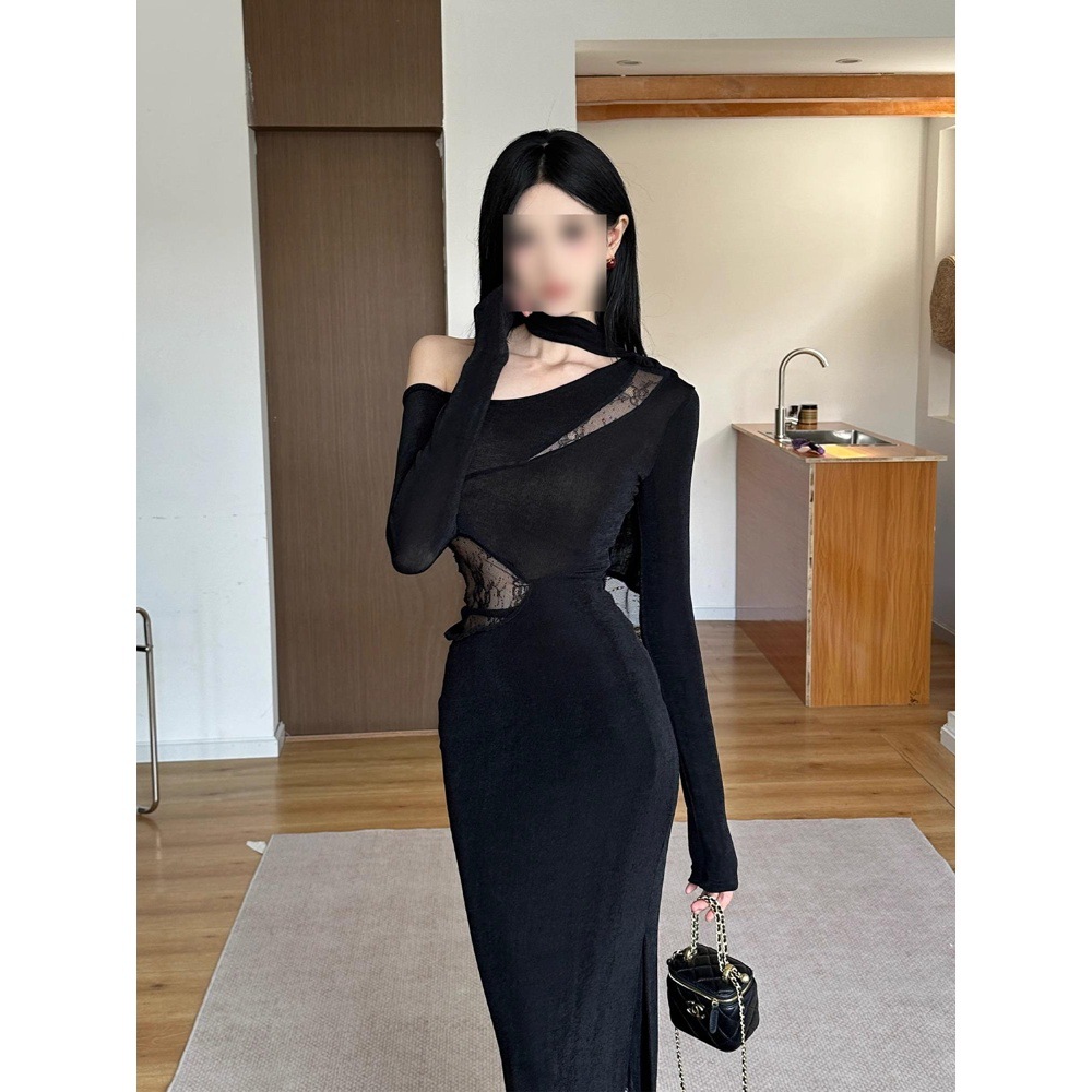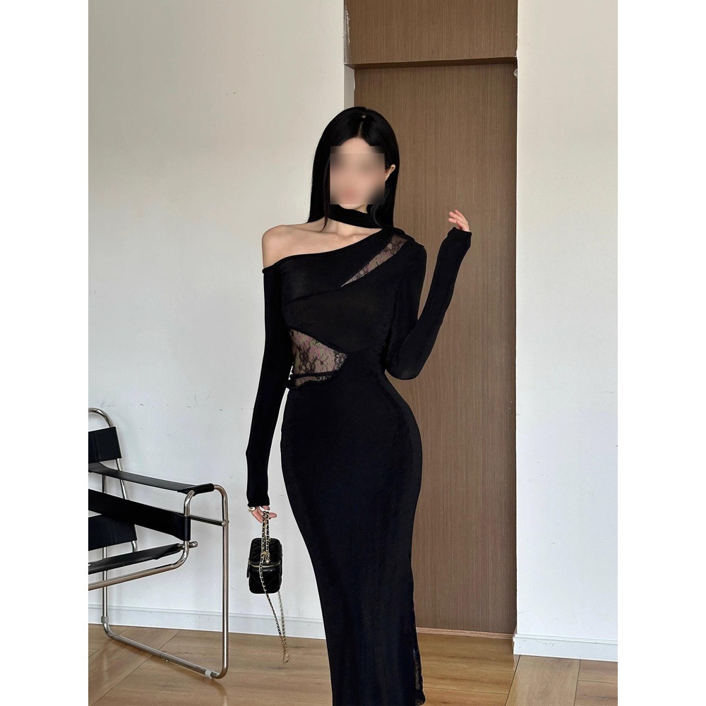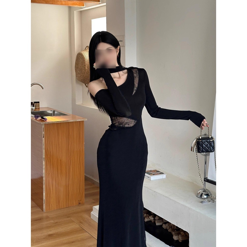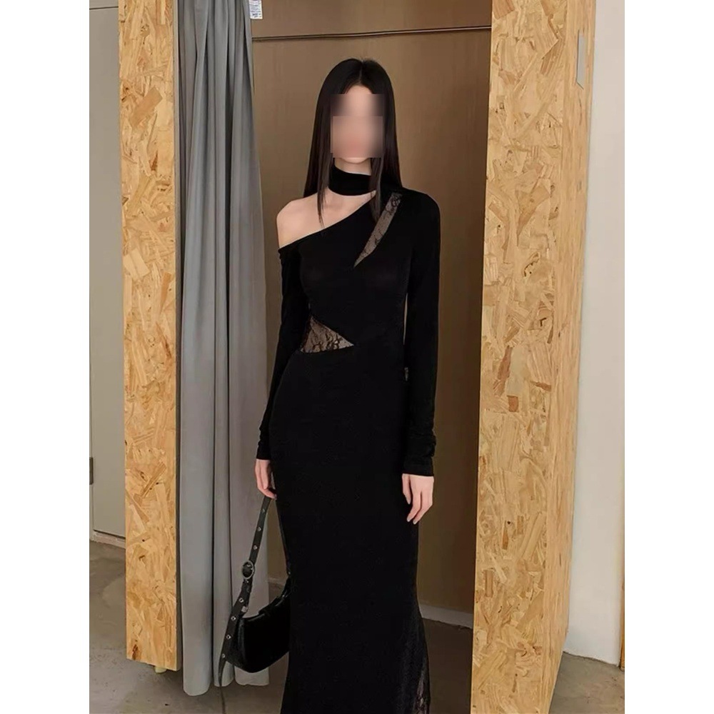 연회 저녁 원피스 블랙 원피스 봄 새로운 도착 프렌치 레트로 숄더 레이스 바느질 슬림 핏 롱 원피스 캐주얼스토어 가기