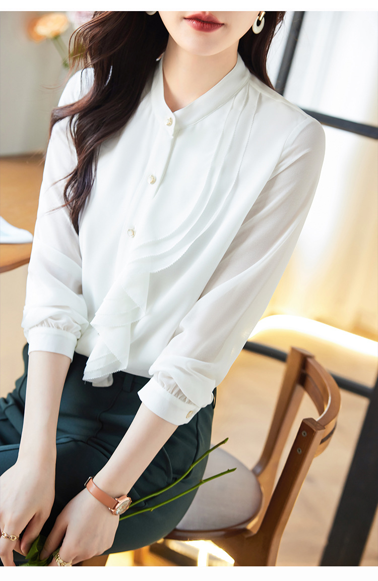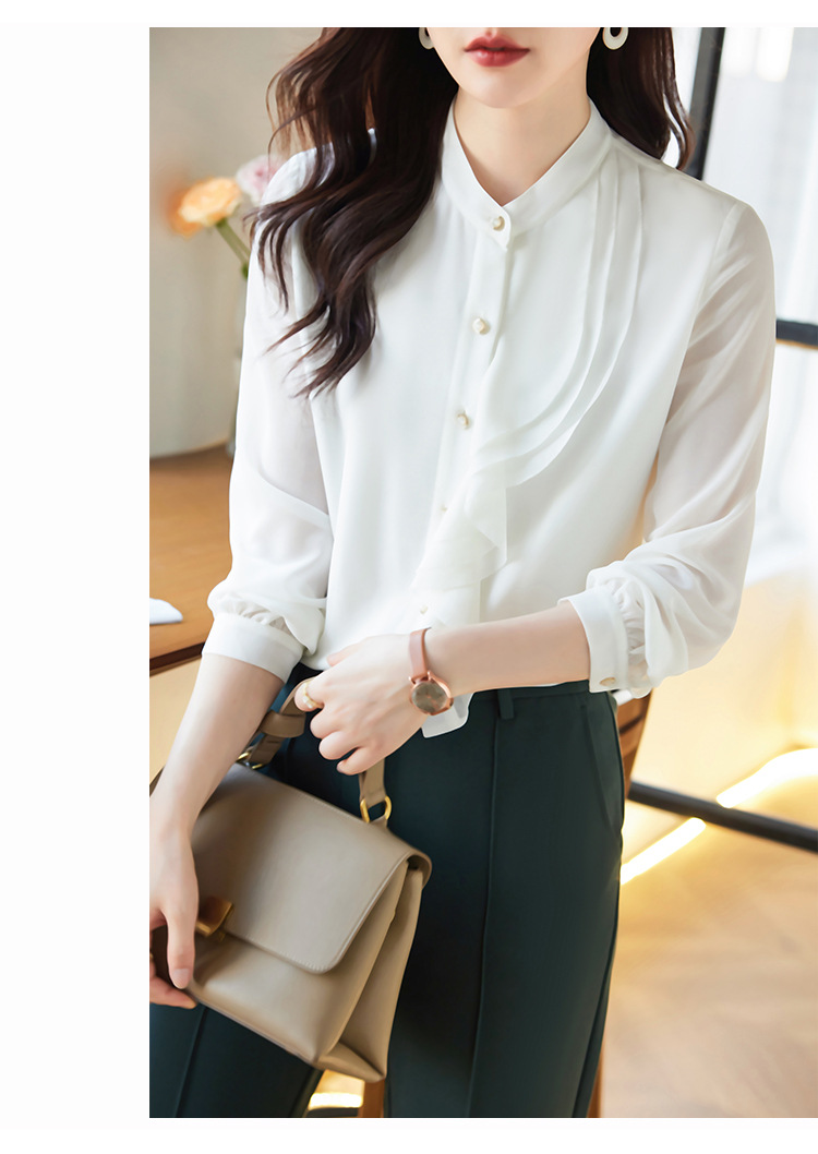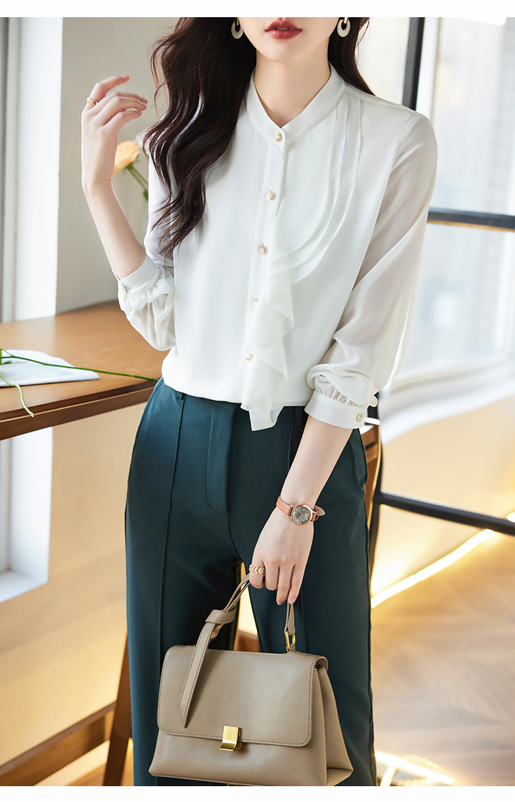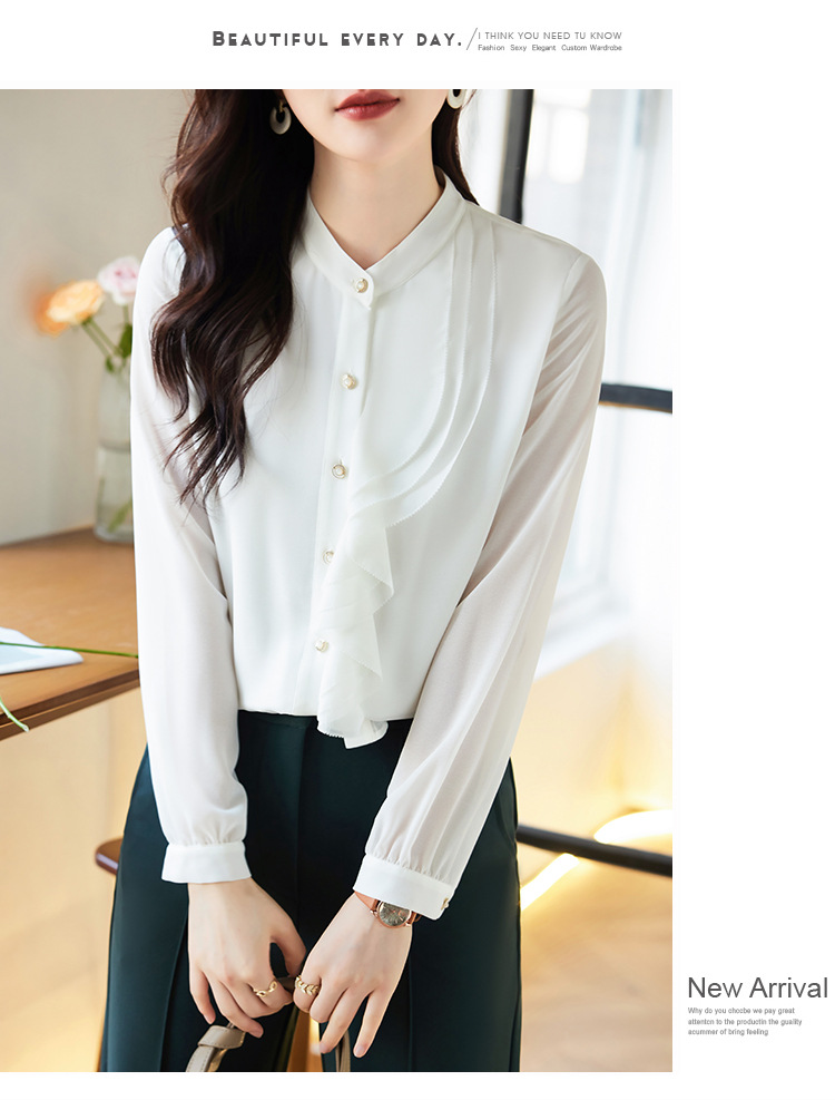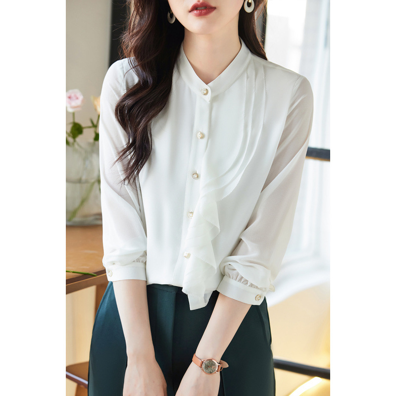 라이닝으로 리얼 샷 2025 봄 새 셔츠 화이트 러플 여성 셔츠 유행 슬림 통근 탑