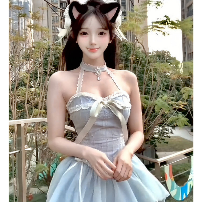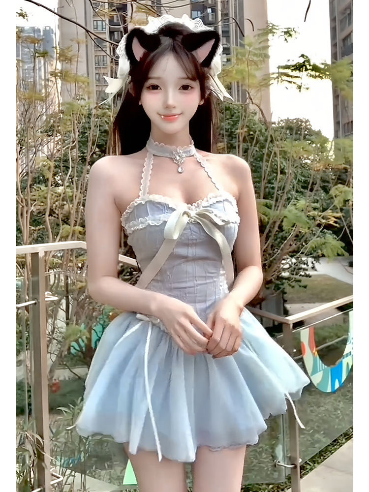 순수한 섹시한 달콤한 스파이스 소녀 슬림 핏 목 원피스 여름 새로운 한국식 발레 슬림핏 공주 스커트 짧은 치마
