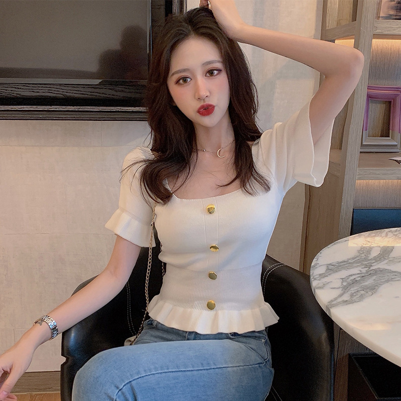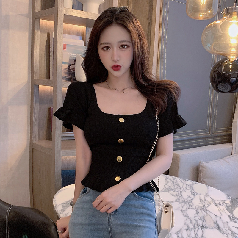 봄과 여름 아이스 실크 쇼트 탑 니트 반팔 티셔츠 여성용 칼라 러플 하이 허리 배꼽 프렌치 셔츠 탑스토어 가기