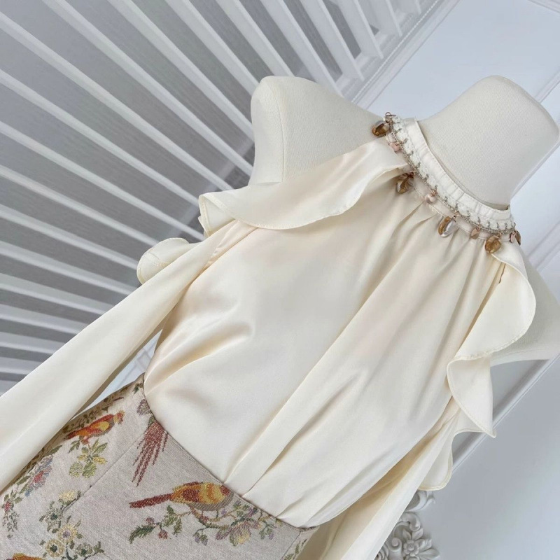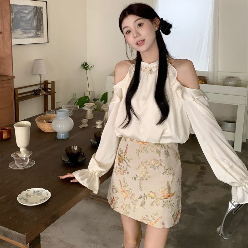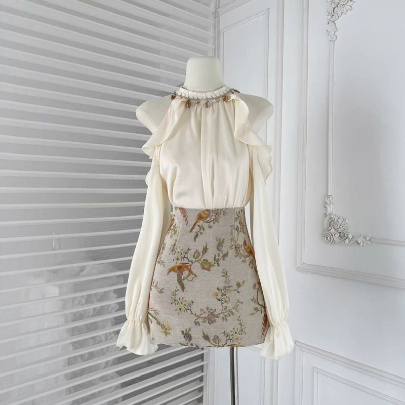 프랑스 스타일 세련된 순수 어깨 셔츠 여성 슬리밍 우아한 인쇄 치마 투피스 세트 봄 새로운 패션 세트
