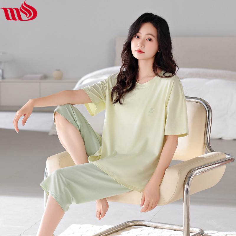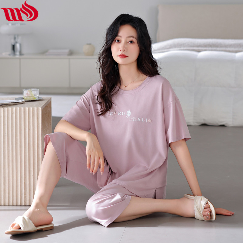 물롱 귀족 가족 잠옷 여성 여름 2025 새로운 모달 반팔 카프리 바지, 가슴 패드 쿨 느낌 홈 옷