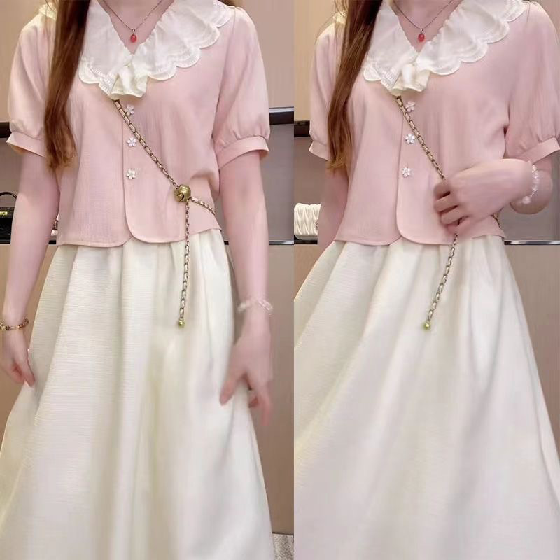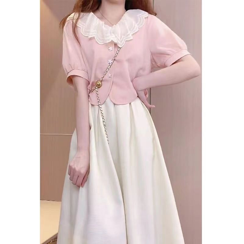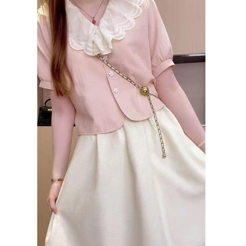 신선하고 귀여운 배를 덮는 셔츠 A 라인 스커트 세트 슈퍼 페어리 폭발 핑크 주름진 탑 주름 치마 투피스 세트스토어 가기