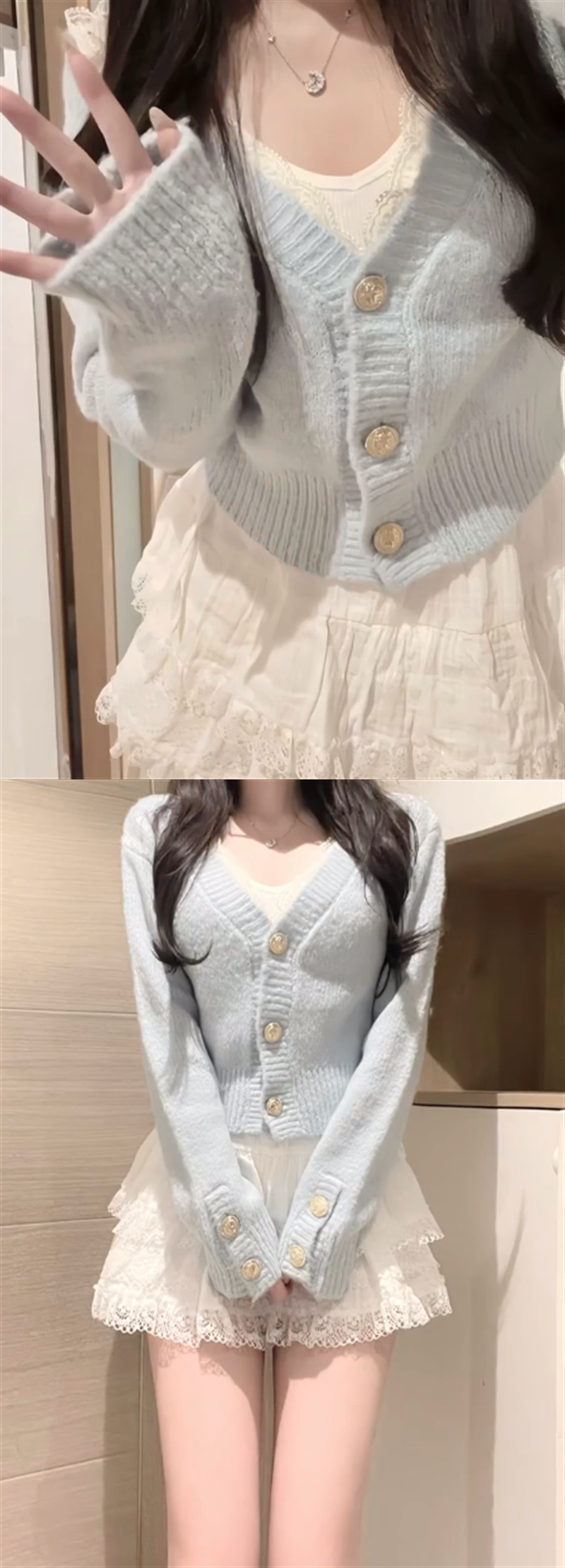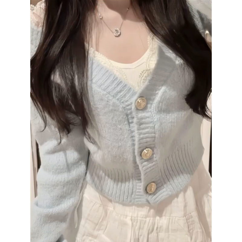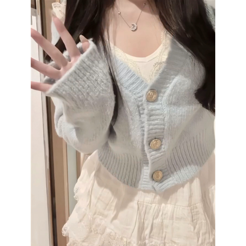 새로운 한국 스타일 우아한 부드러운 스타일 V 넥 니트 카디건 스웨터 여성의 높은 허리 슬림 A 라인 스커트 트렌디스토어 가기