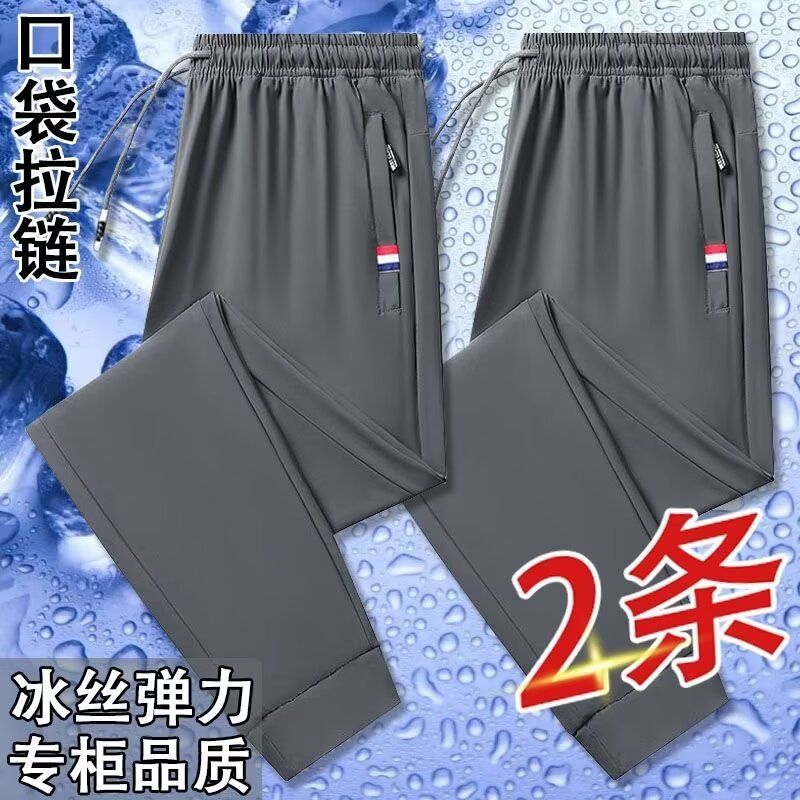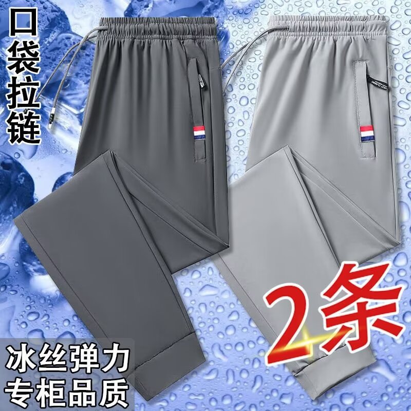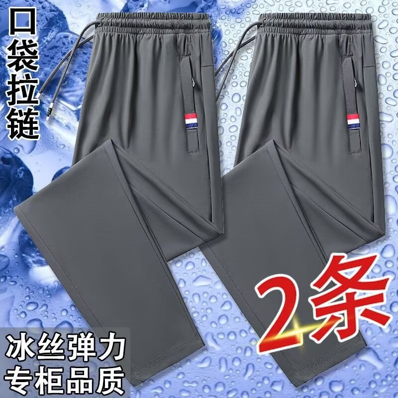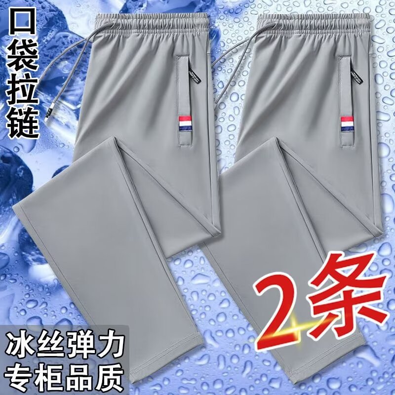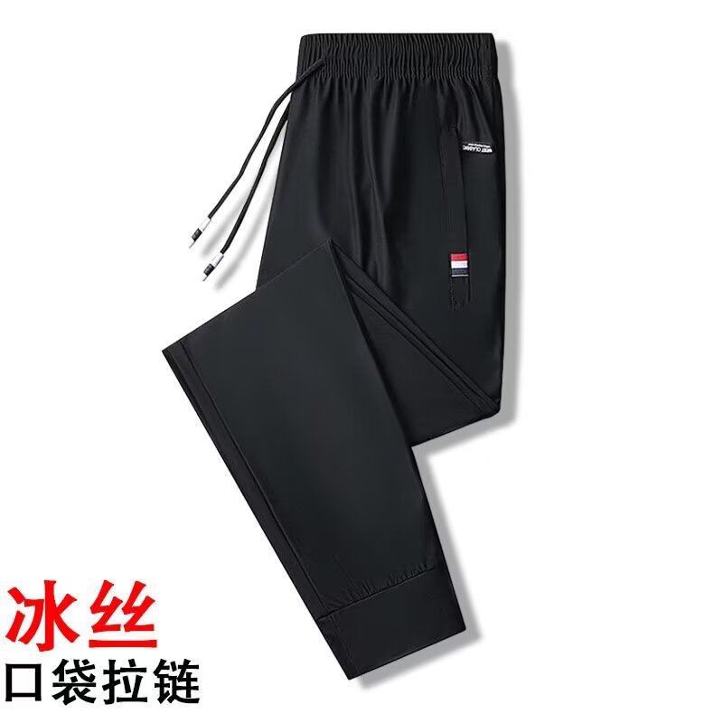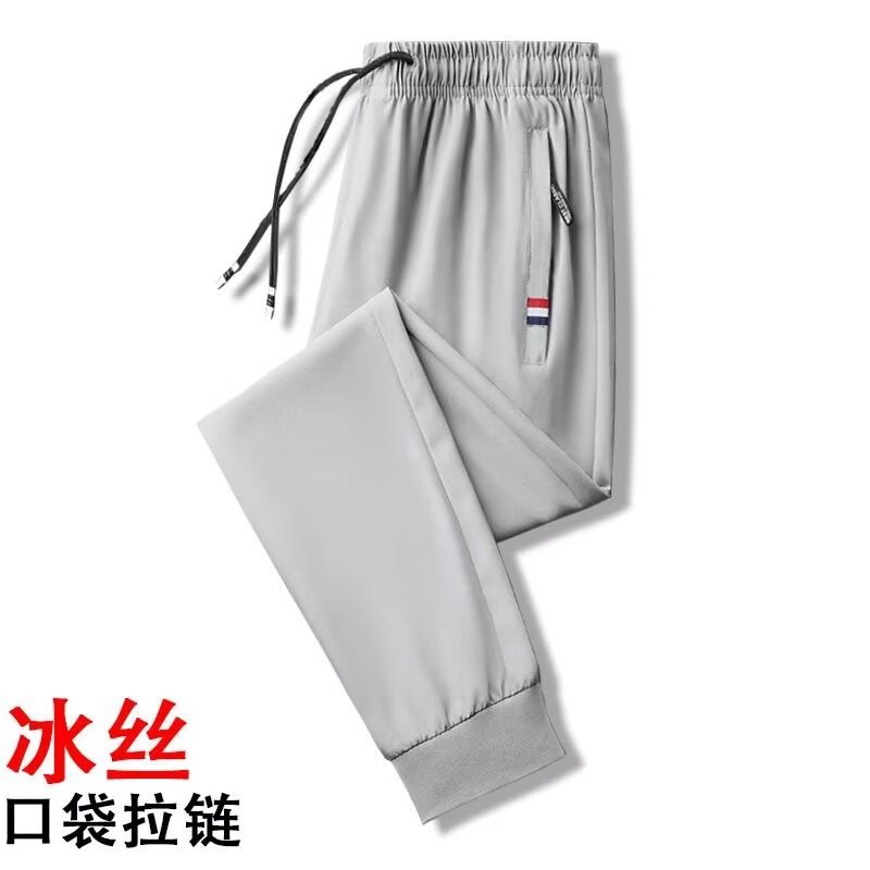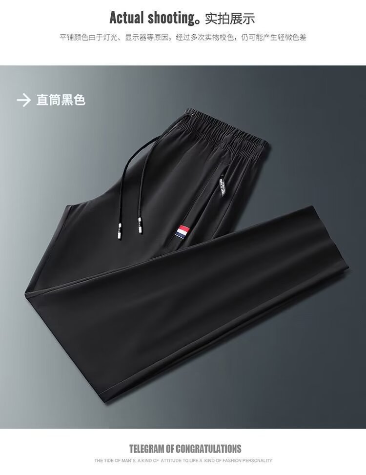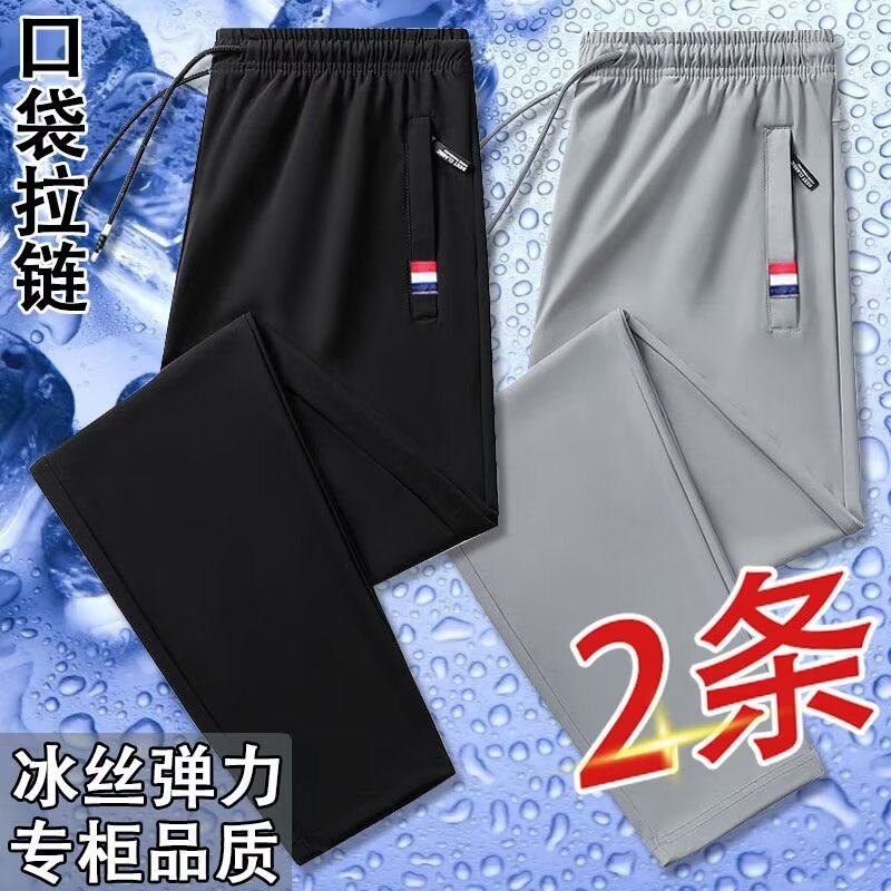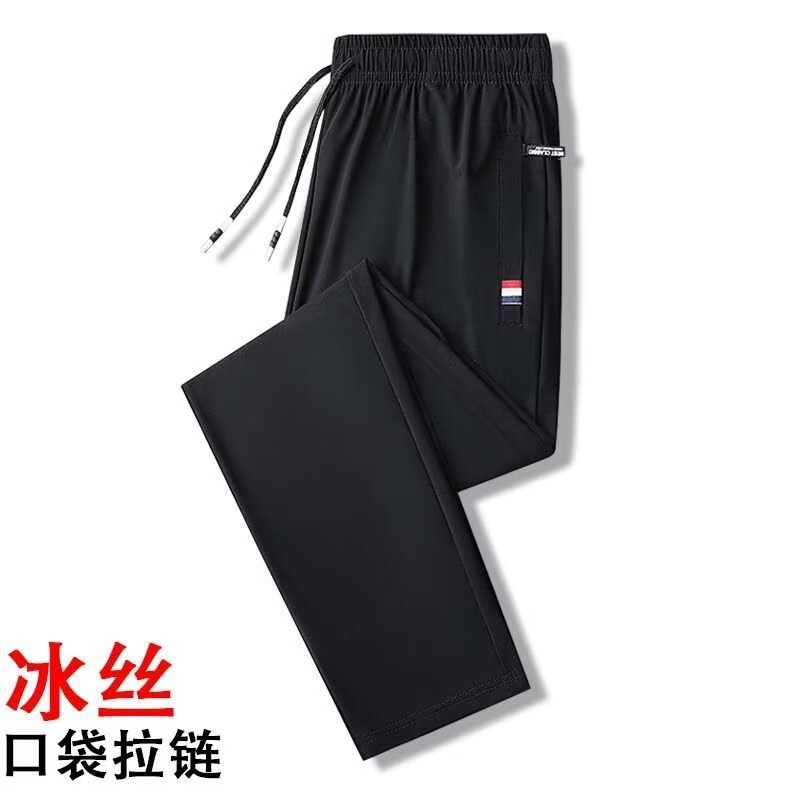 아이스 실크 바지 남자 여름 얇은 느슨한 단단한 허리 스트레이트 탄성 통기성 지퍼 스포츠 플러스 사이즈 다리 캐주얼 바지스토어 가기