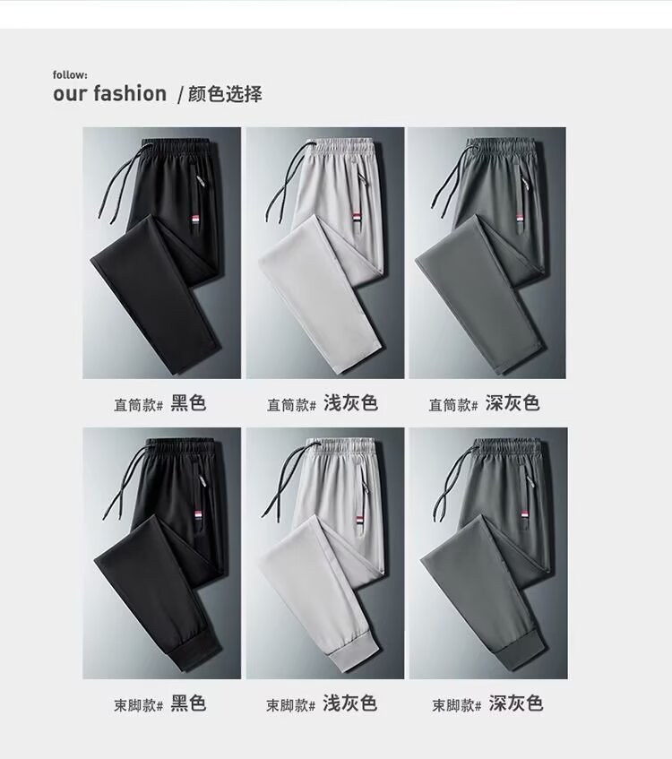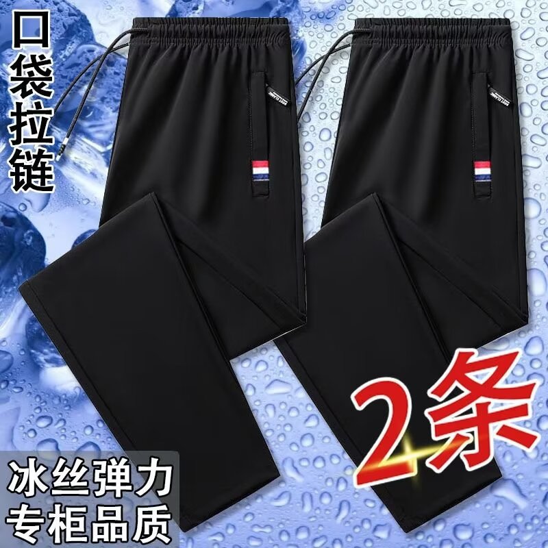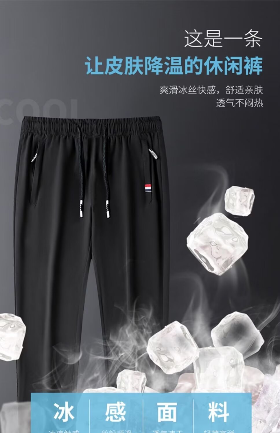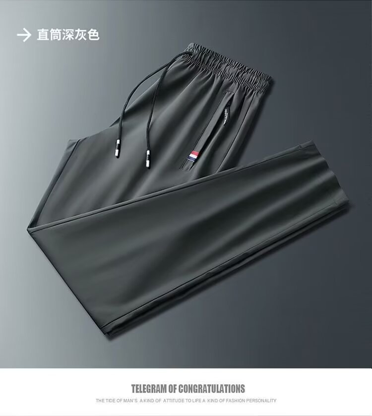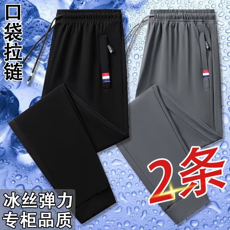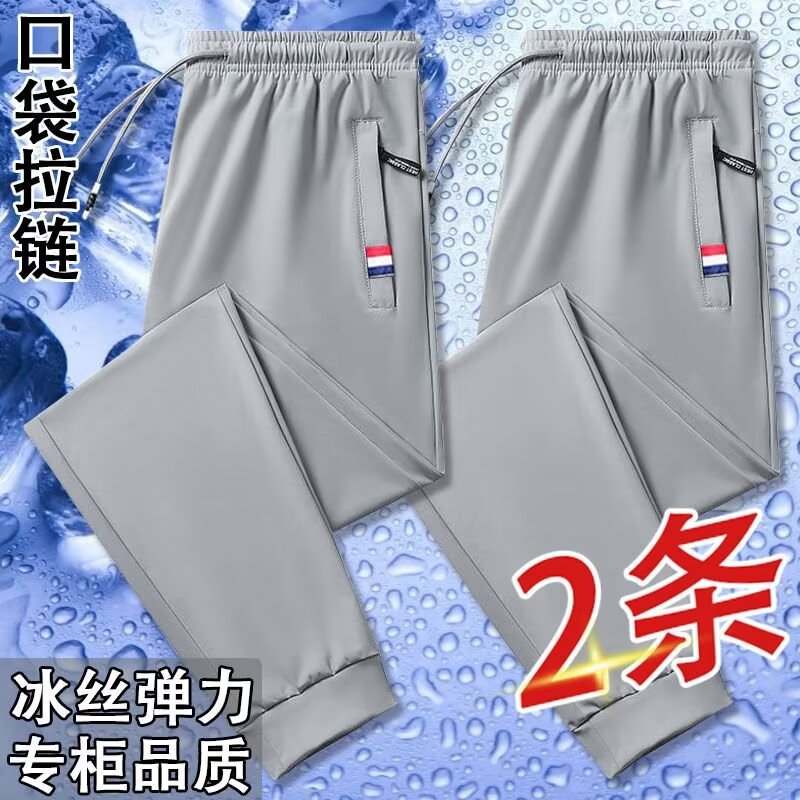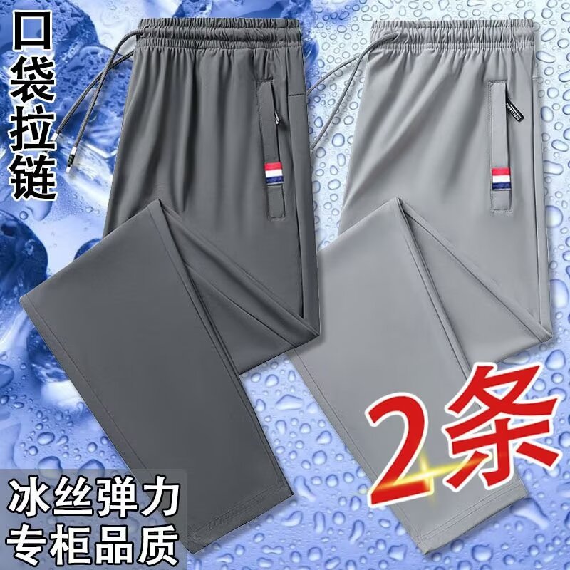 아이스 실크 바지 남자 여름 얇은 느슨한 단단한 허리 스트레이트 탄성 통기성 지퍼 스포츠 플러스 사이즈 다리 캐주얼 바지스토어 가기