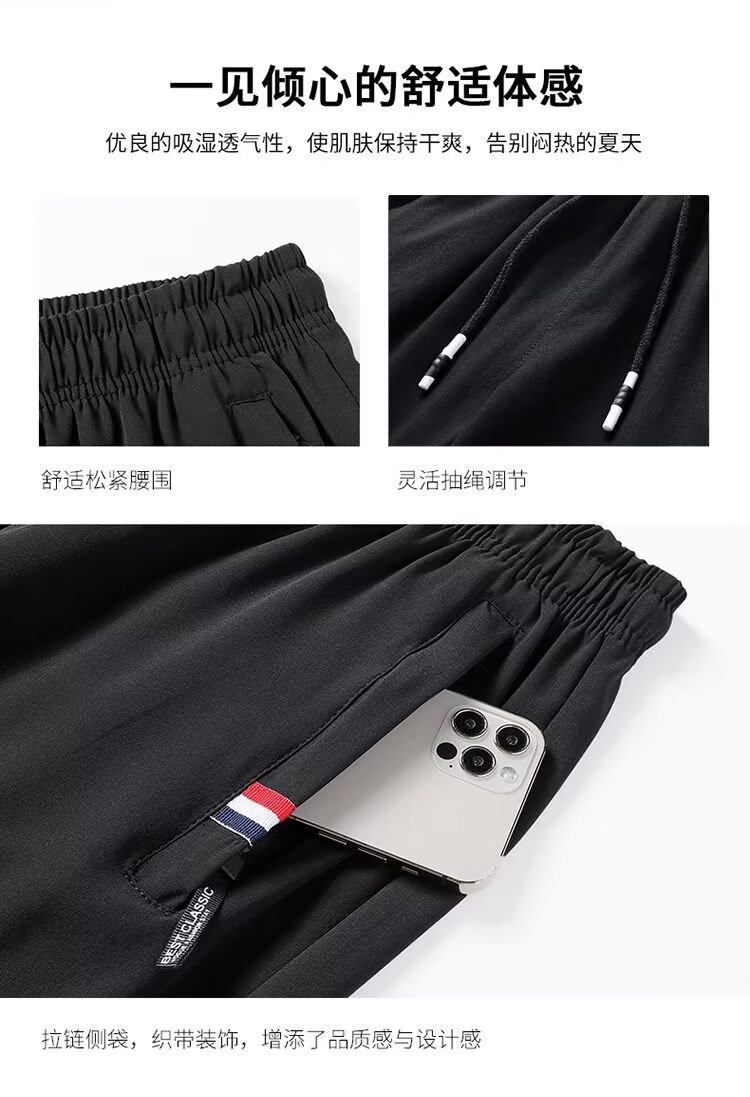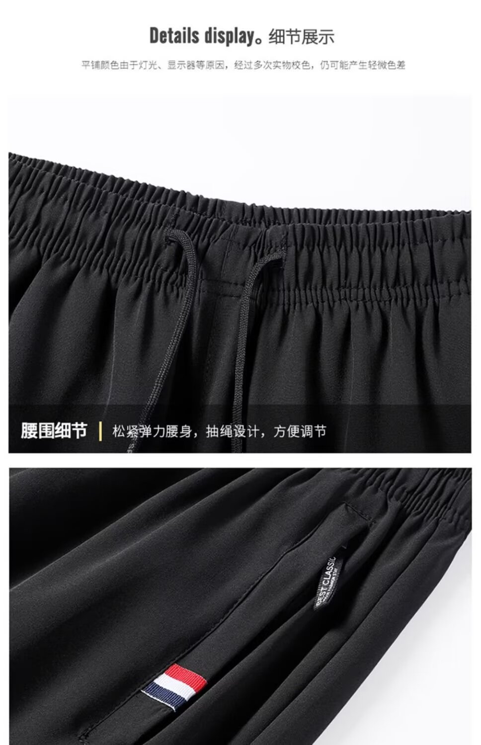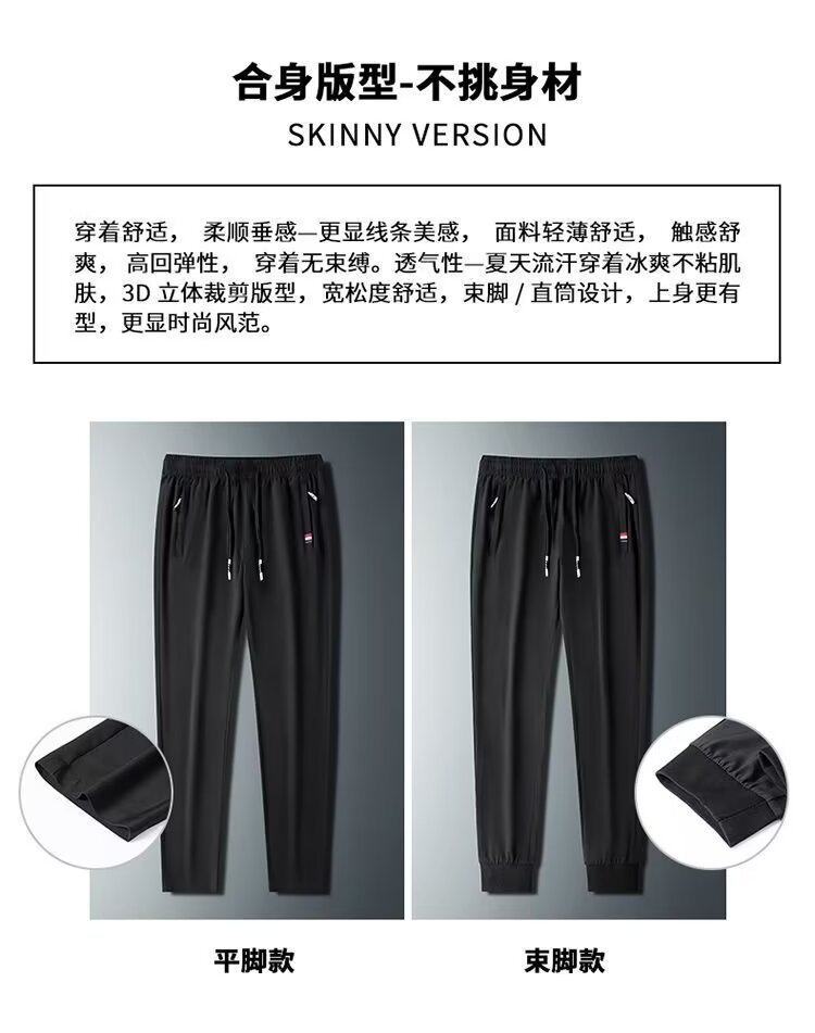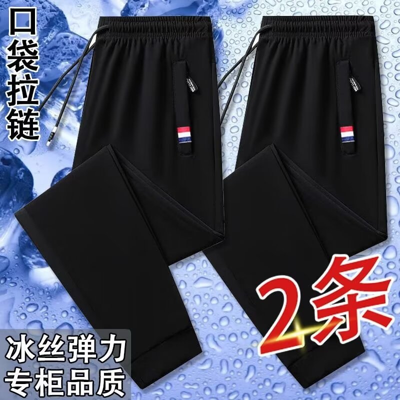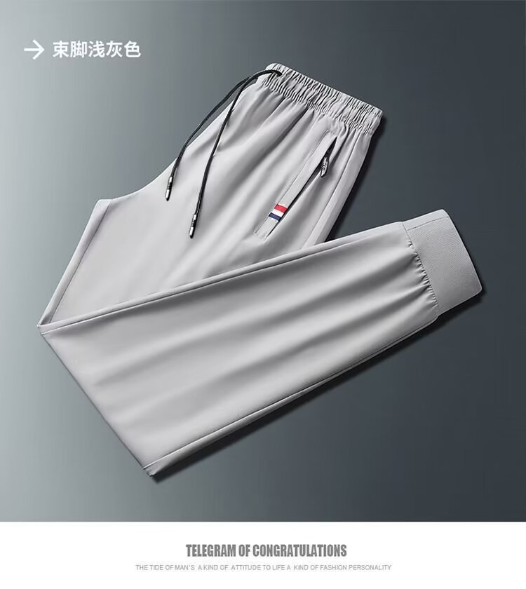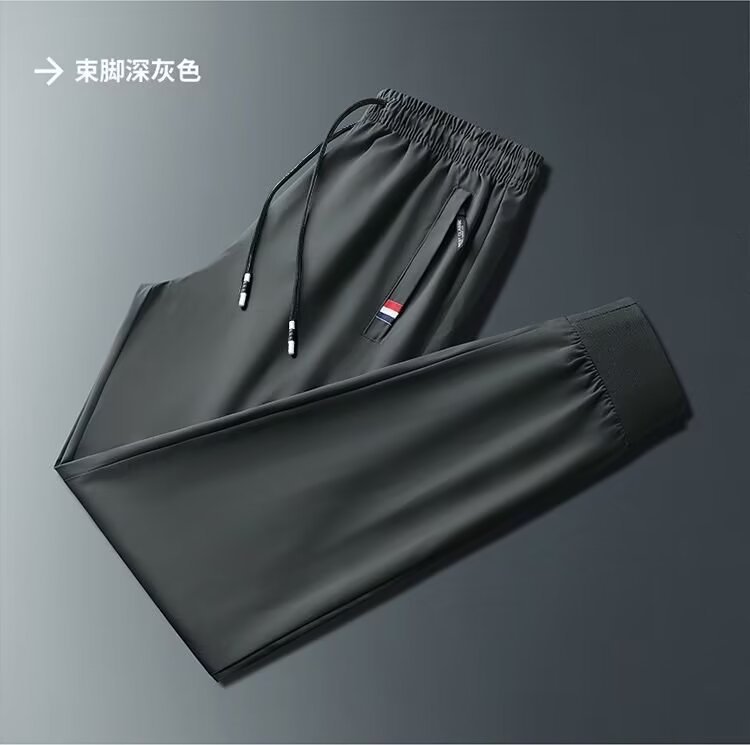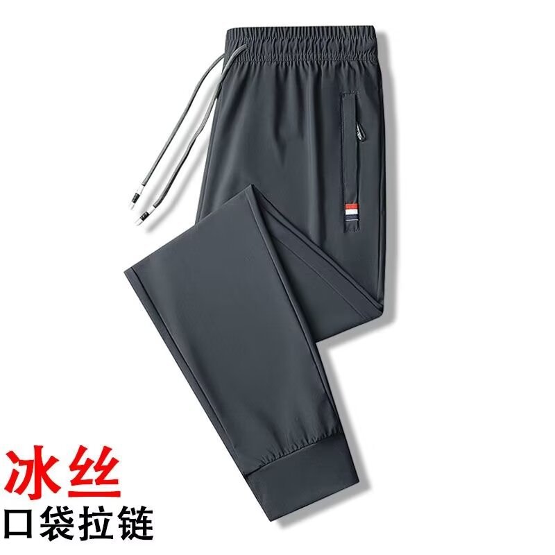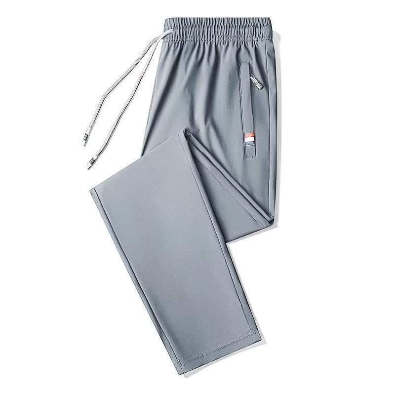아이스 실크 바지 남자 여름 얇은 느슨한 단단한 허리 스트레이트 탄성 통기성 지퍼 스포츠 플러스 사이즈 다리 캐주얼 바지스토어 가기