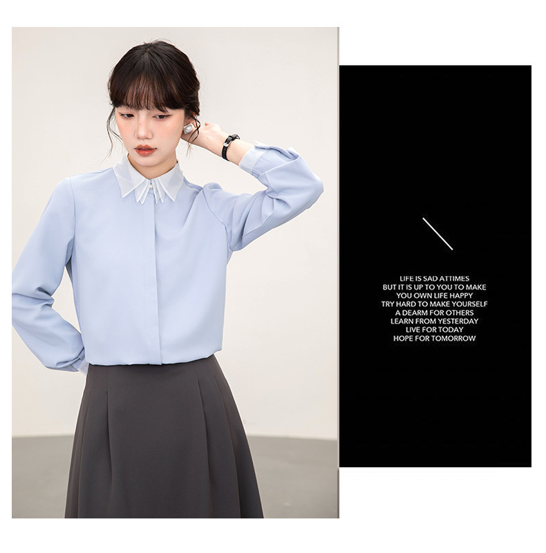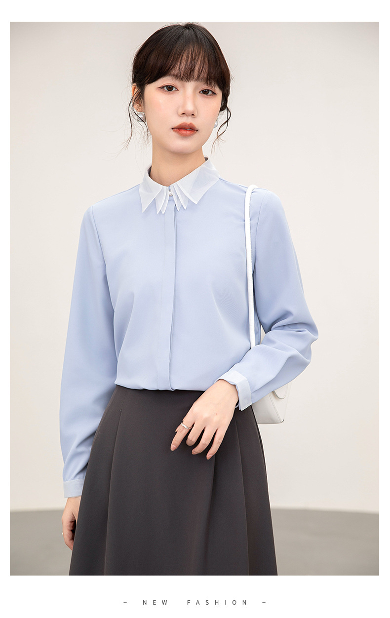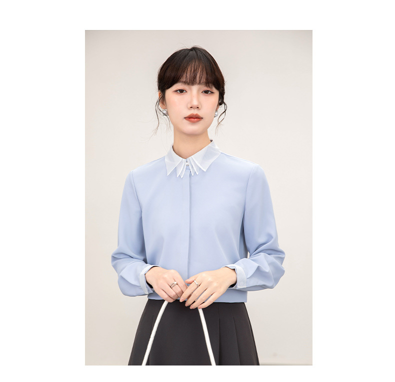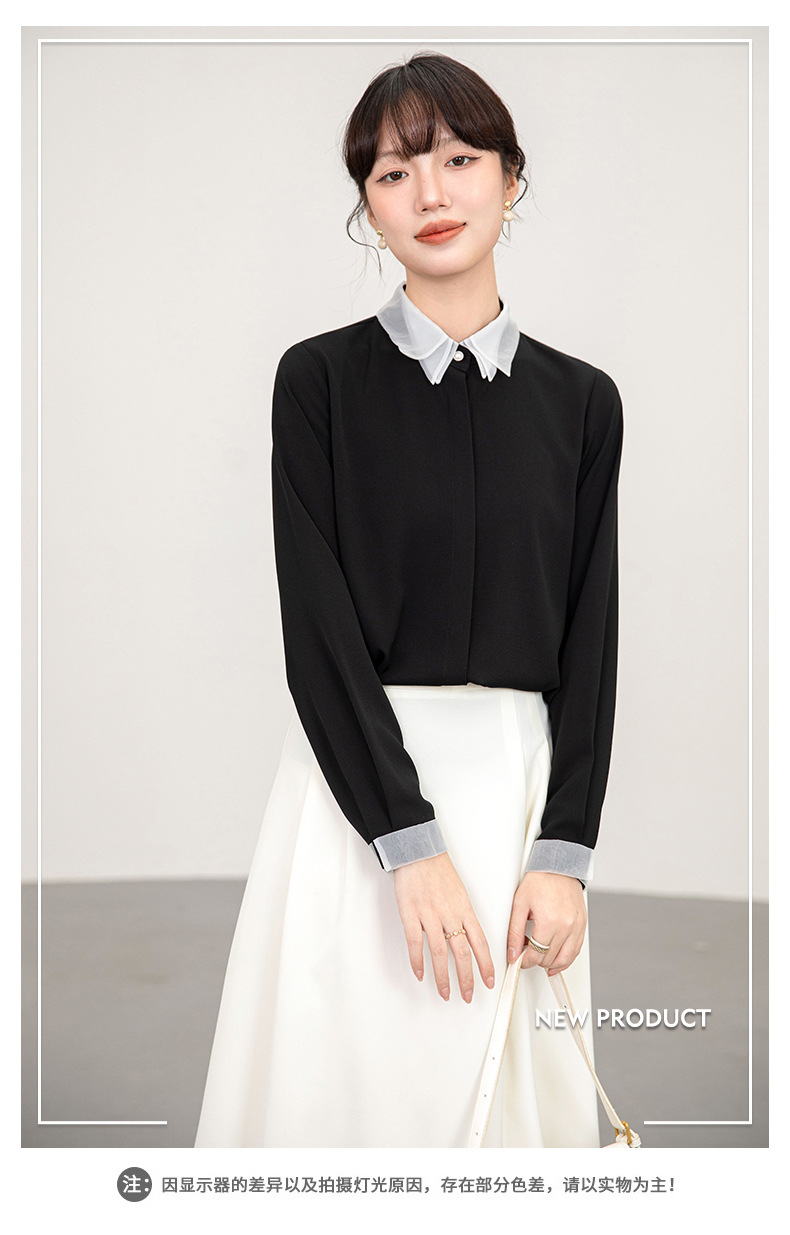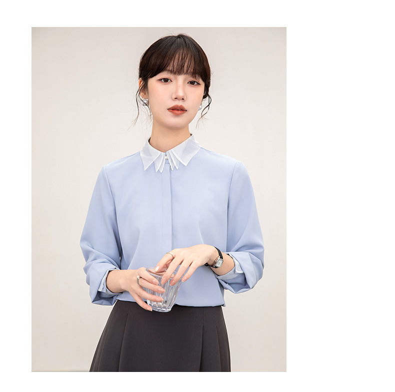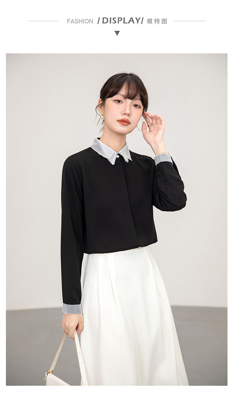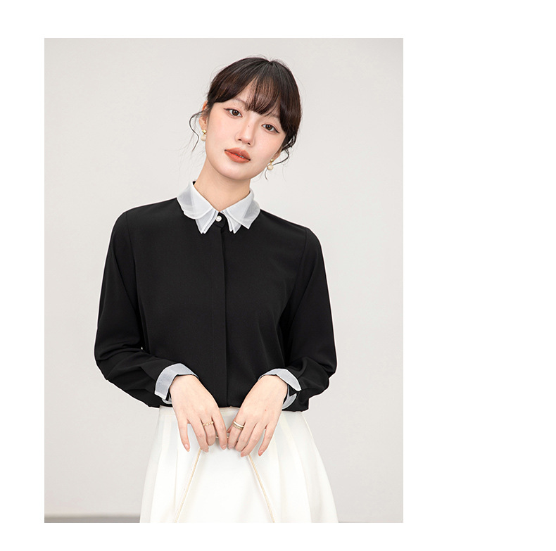 통근 셔츠 여성의 2025 봄과 가을 디자인 센스 틈새 접힌 칼라 컬러 블록 탑 우아한 슬림 핏 긴팔 스택 셔츠스토어 가기