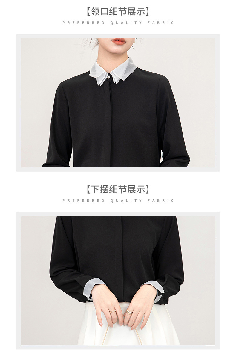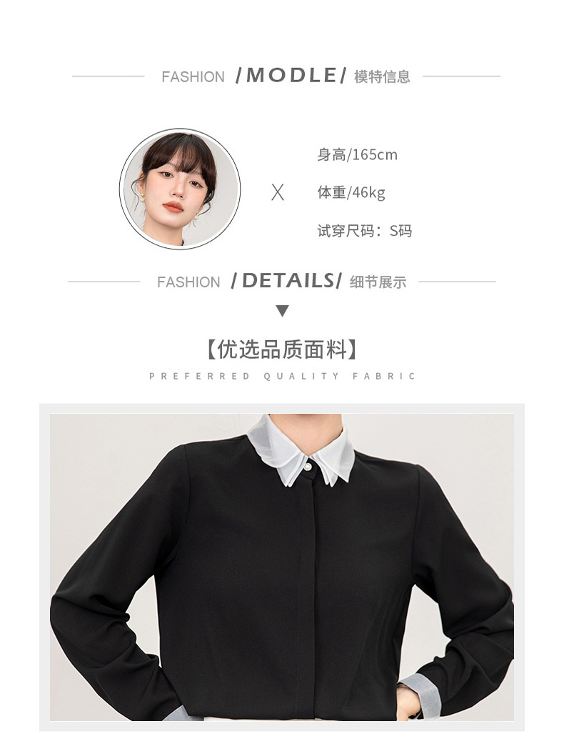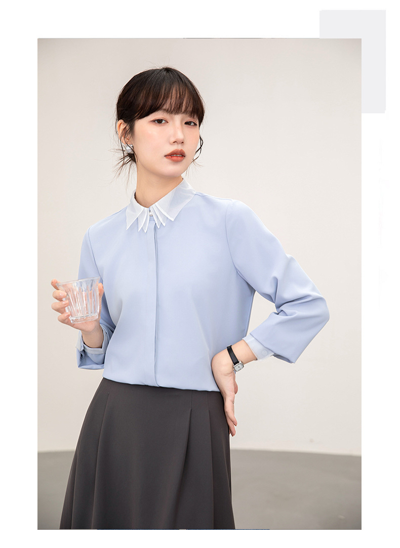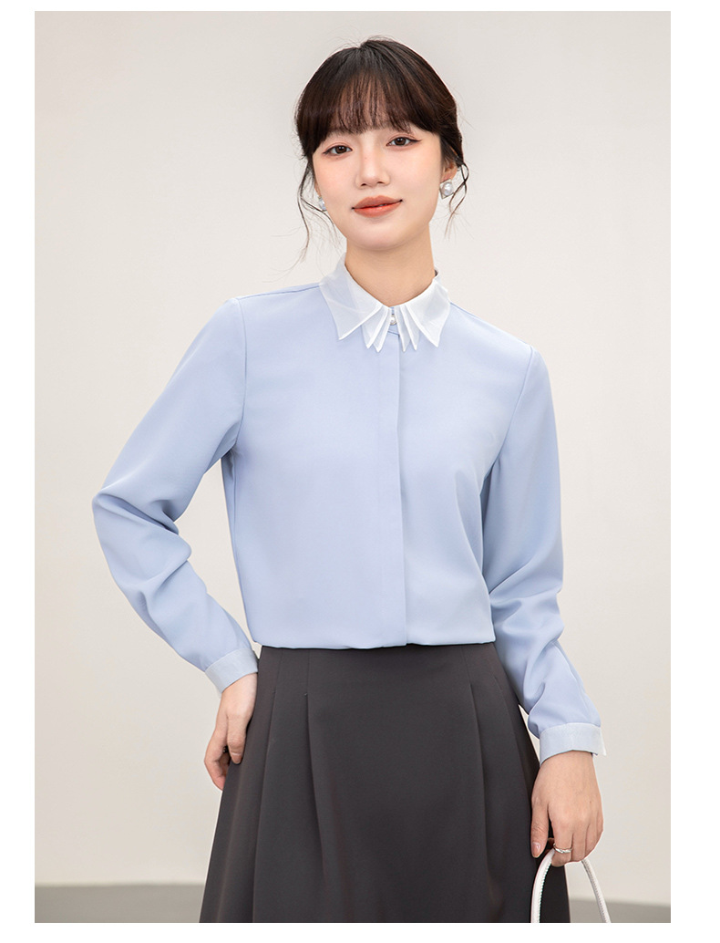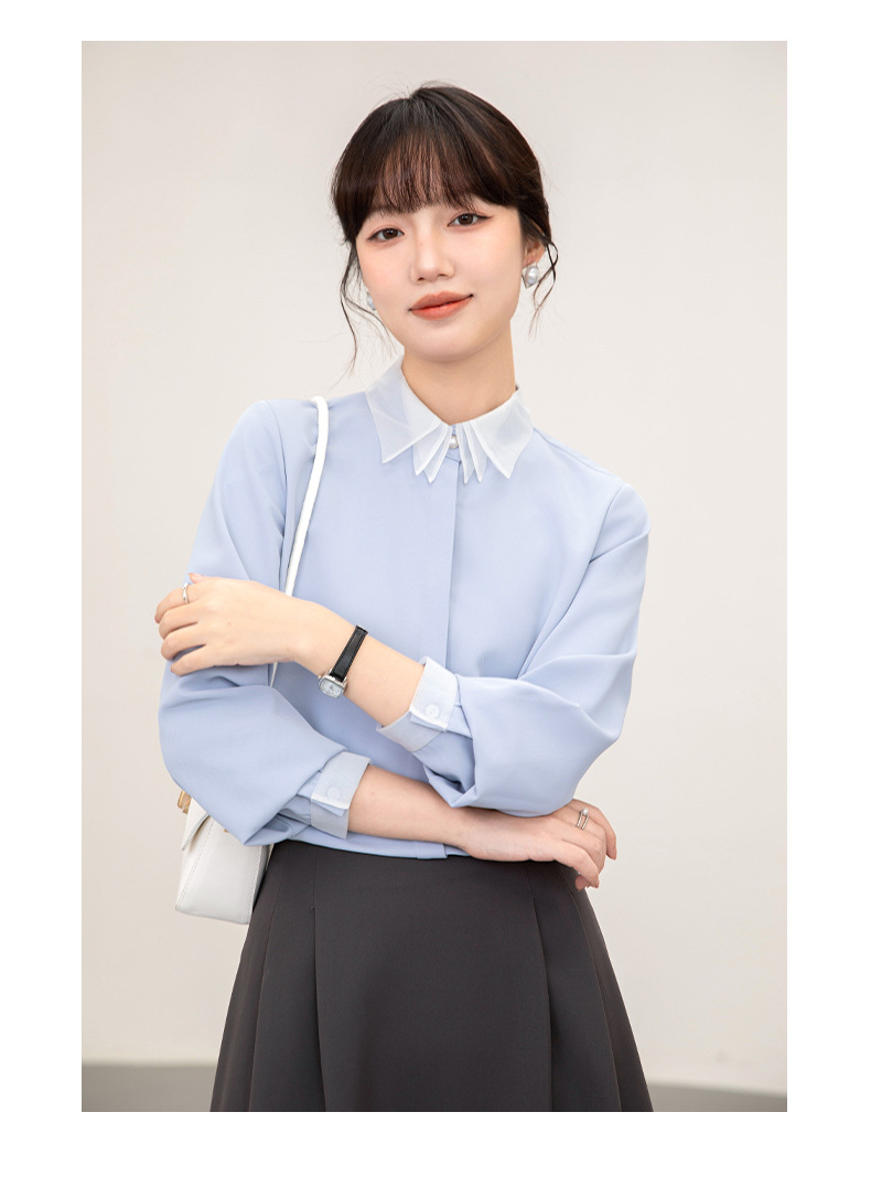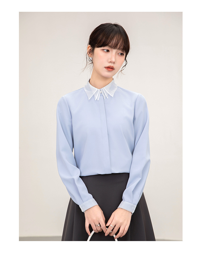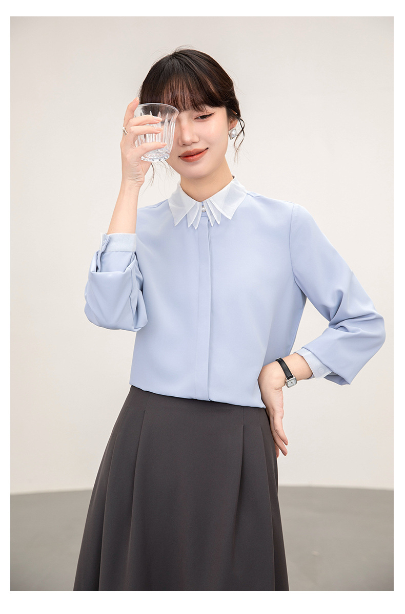 통근 셔츠 여성의 2025 봄과 가을 디자인 센스 틈새 접힌 칼라 컬러 블록 탑 우아한 슬림 핏 긴팔 스택 셔츠스토어 가기