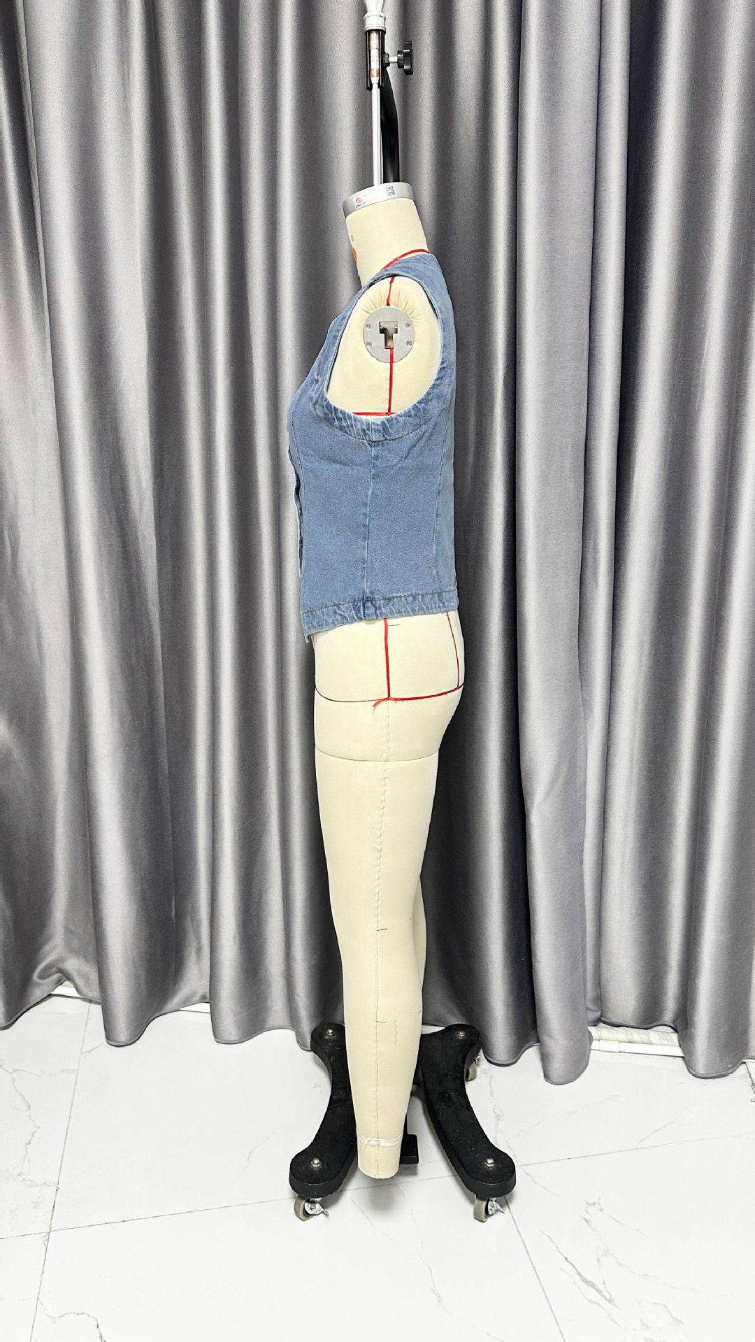 2025 년 여름 새로운 유럽 및 미국 국경 대외 무역 민소매 슬림 핏 슬림 핏 데님 조끼 여성 크루 넥 웨이스트 코트 조끼