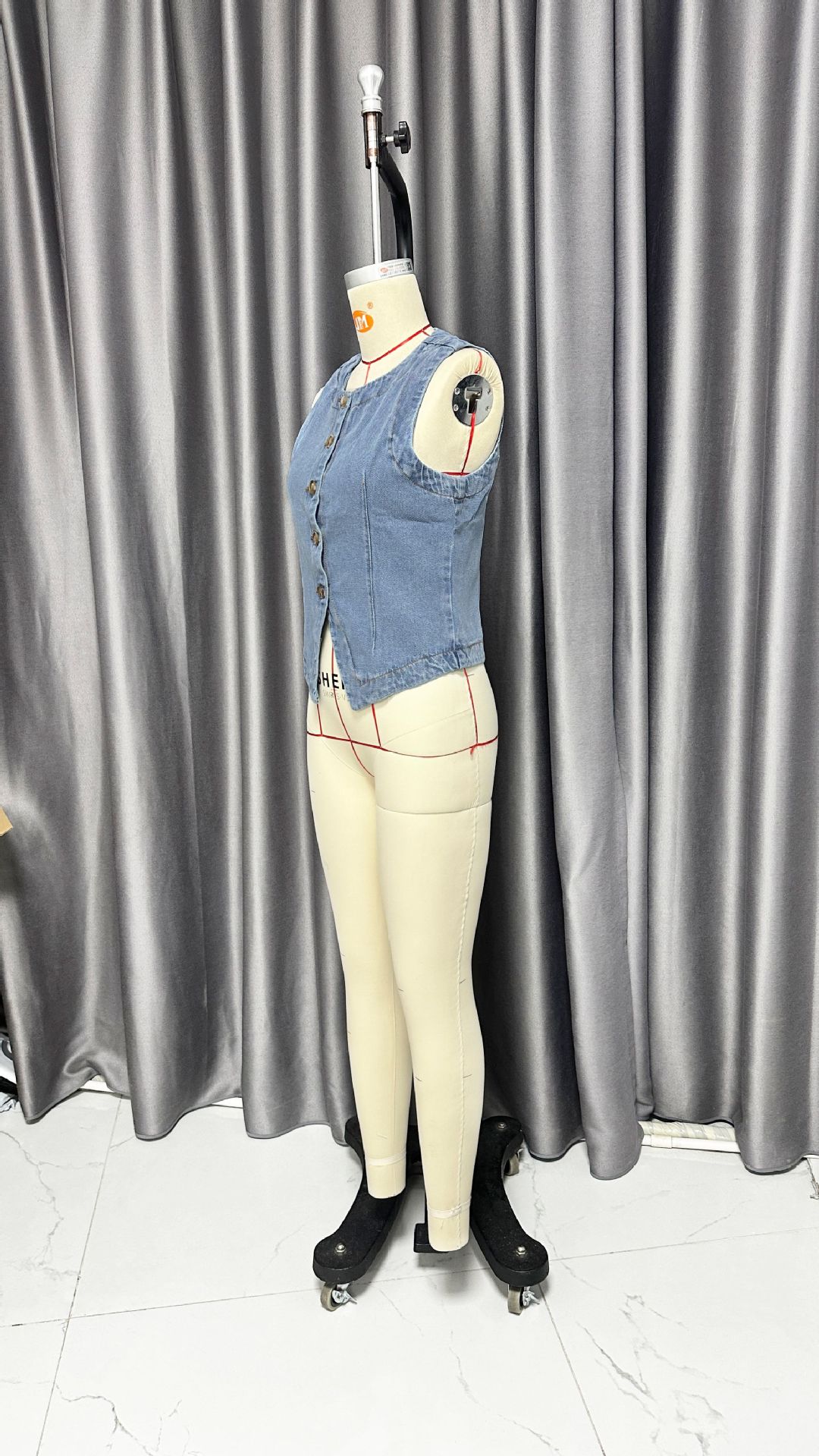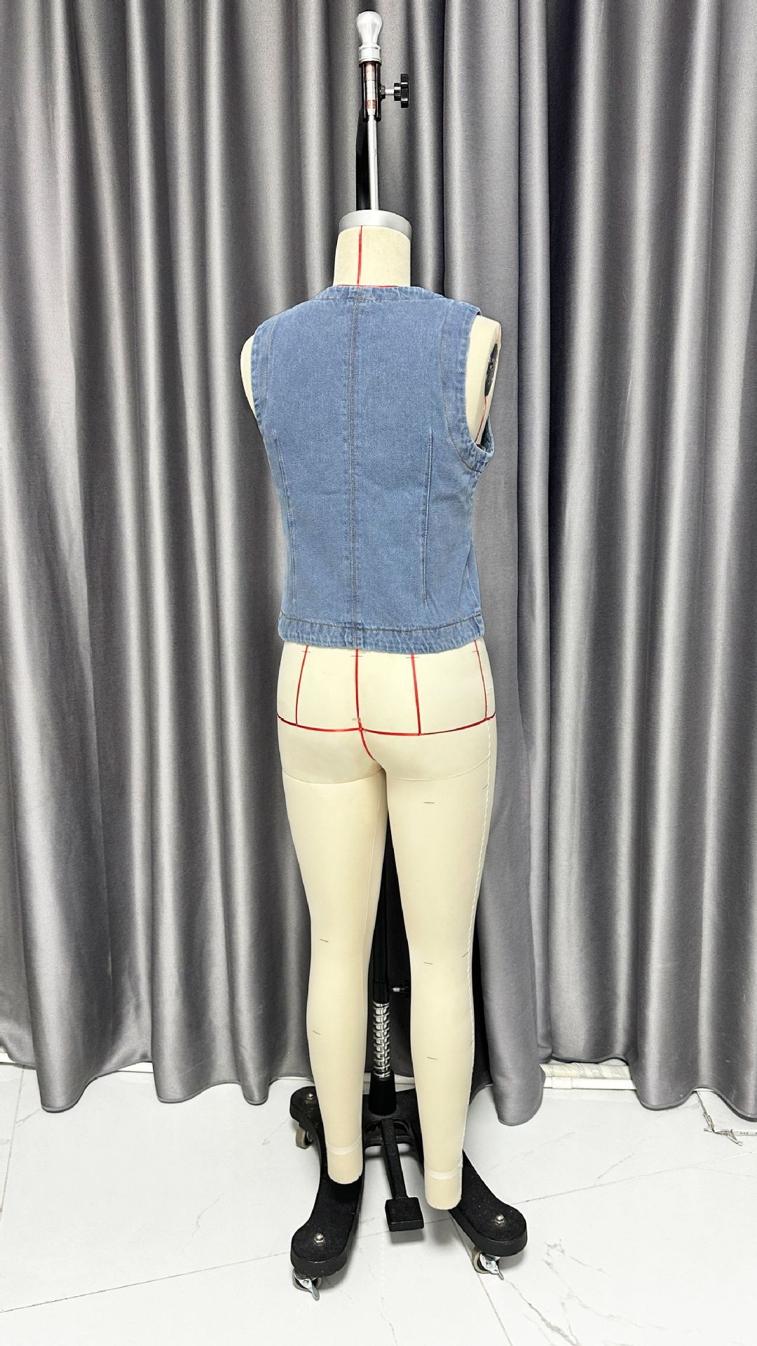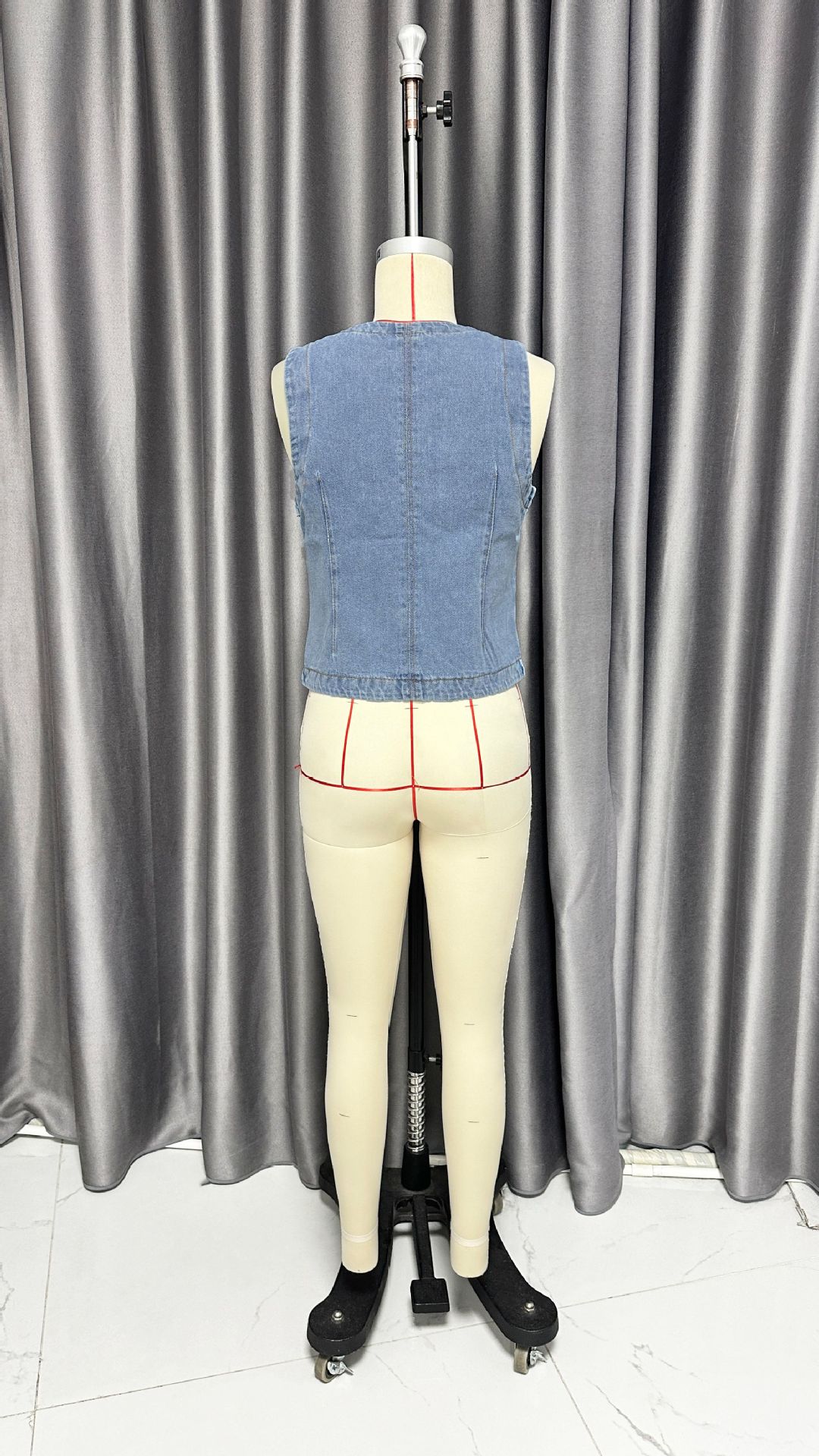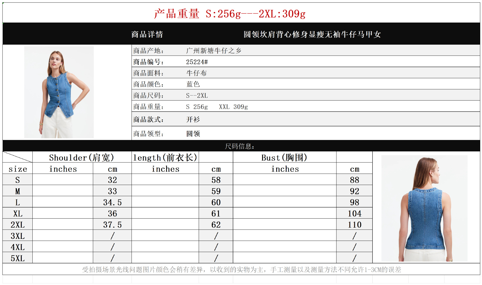 2025 년 여름 새로운 유럽 및 미국 국경 대외 무역 민소매 슬림 핏 슬림 핏 데님 조끼 여성 크루 넥 웨이스트 코트 조끼스토어 가기